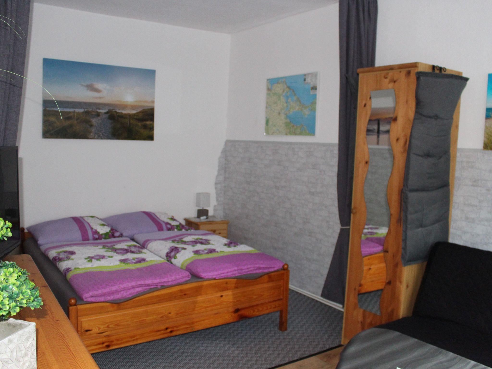 1 Raum Ferienwohnung, kombinierter Wohn- und Schlafraum (24 qm) mit TV, Radio, Doppelbett und Sitzgarnitur. Der Schlafbereich ist mit Teppichboden und der Wohnbereich mit Laminat ausgelegt. Der Flur und der Küchenbereich sind gefliest. Pantry-Küche mit Kochgelegenheit, Kühlschrank, Kaffeemaschine und Minibackofen. Gefliestes Bad mit Dusche und WC. PKW-Stellplatz am Haus. Bettwäsche und Geschirrtücher werden durch Vermieter gestellt, Handtücher bitte mitbringen. Eine Aufbettung mit Zustellbett für Kinder bis 17 Jahren möglich.Gartenmöbel und Grillgelegenheit vorhanden. Der Vermieter wohnt im Haupthaus und ist Halter von 2 Dalmatiner, die Fremden gegenüber sehr aufgeschlossen sind.