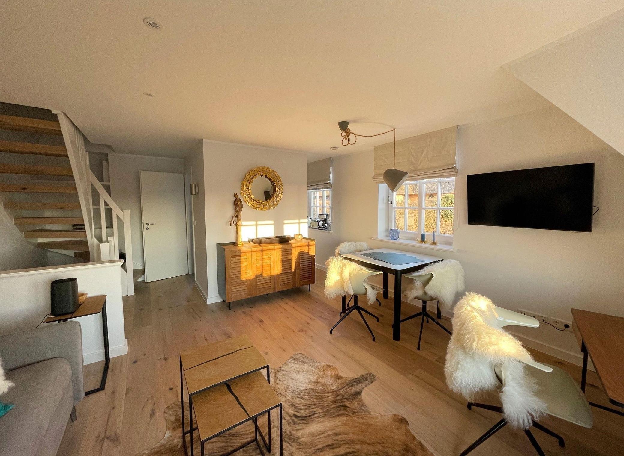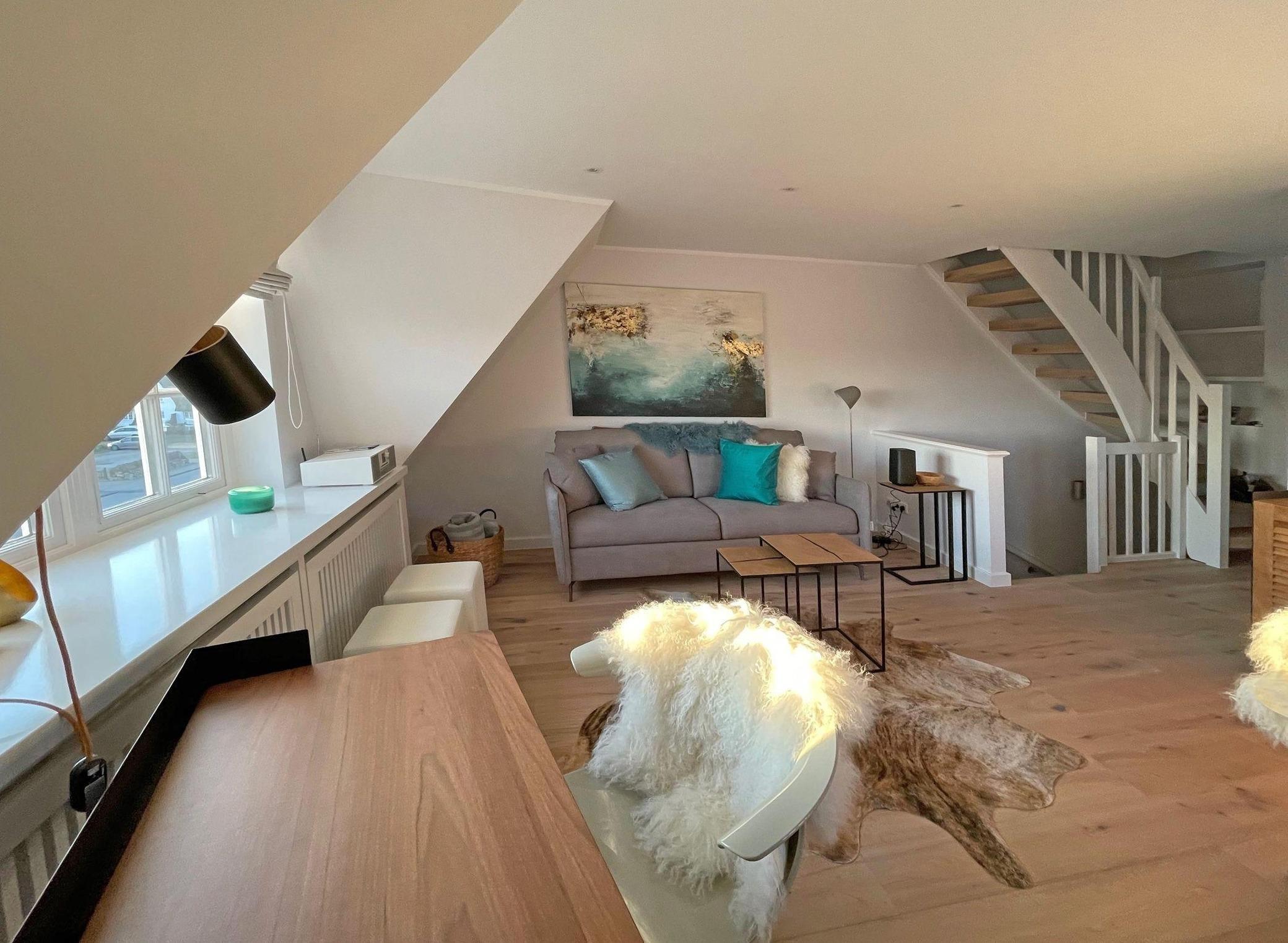 Über eine innenliegende Treppe gelangen sie in den stylischen, hellen Wohnraum mit wunderschönen Sitzgelegenheiten und traumhaftem Blick auf das Wattenmeer, einem Essplatz am Fenster zur Düne für 4 Personen, eine moderne offene Küche mit bester Ausstattung und einem neu gestalteten Badezimmer mit ebenerdiger Dusche.