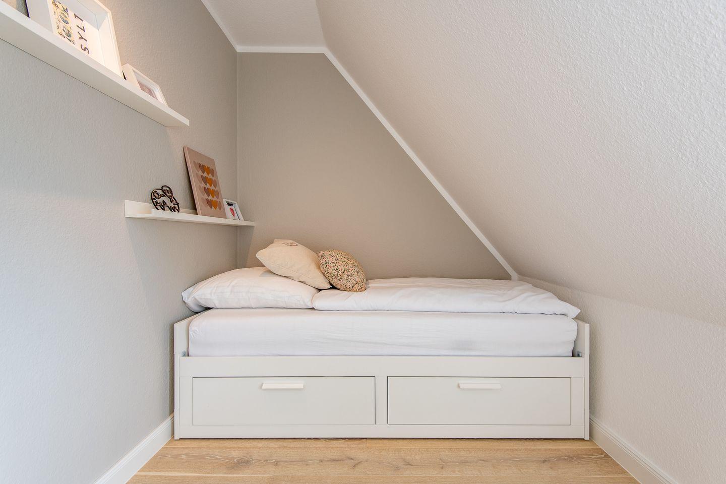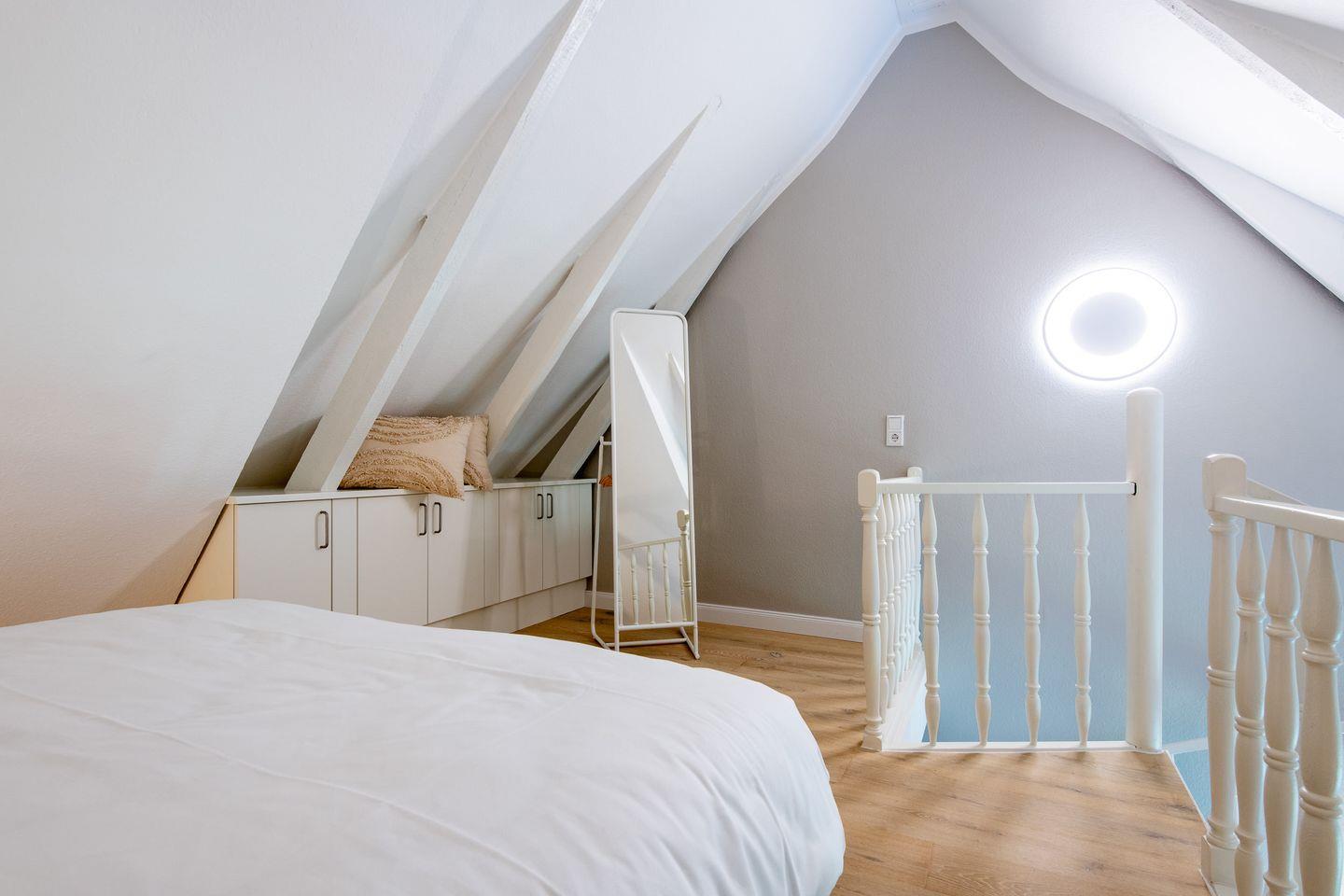 Das Ferienobjekt verfügt über ein Schlafzimmer im ersten Obergeschoss mit einem ausziehbaren Einzelbett, das sich besonders für Kinder oder Freunde eignet. Ein weiteres Highlight ist die Galerie, auf der ein Doppelbett (180x200 cm) zum Träumen und Erholen einlädt. Die ruhige Lage und die geschmackvolle Einrichtung sorgen für erholsame Nächte und eine angenehme Atmosphäre.