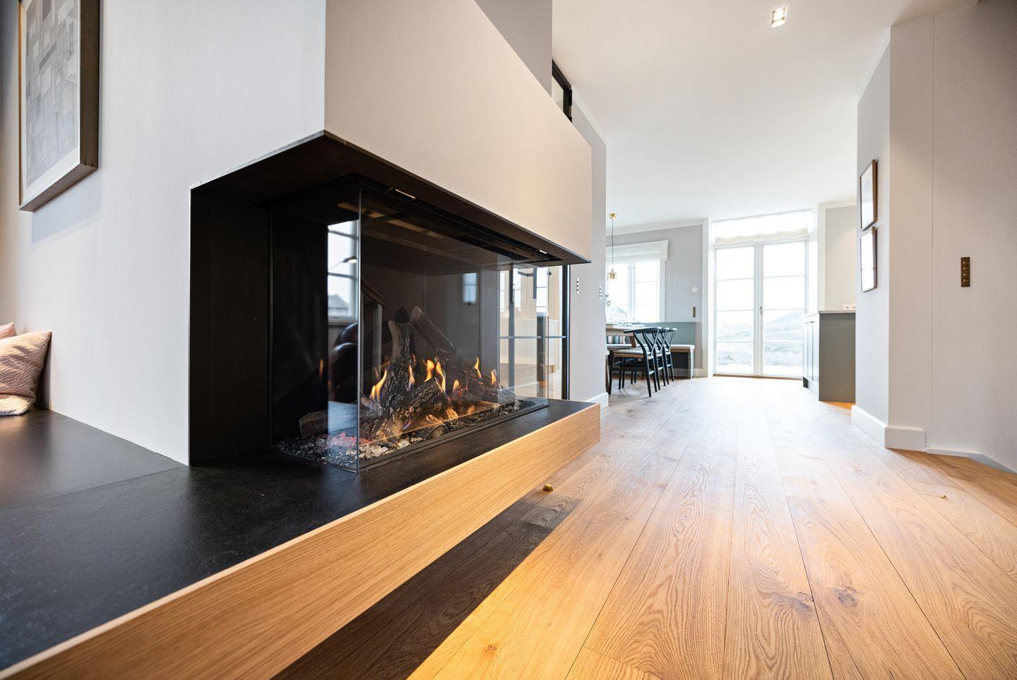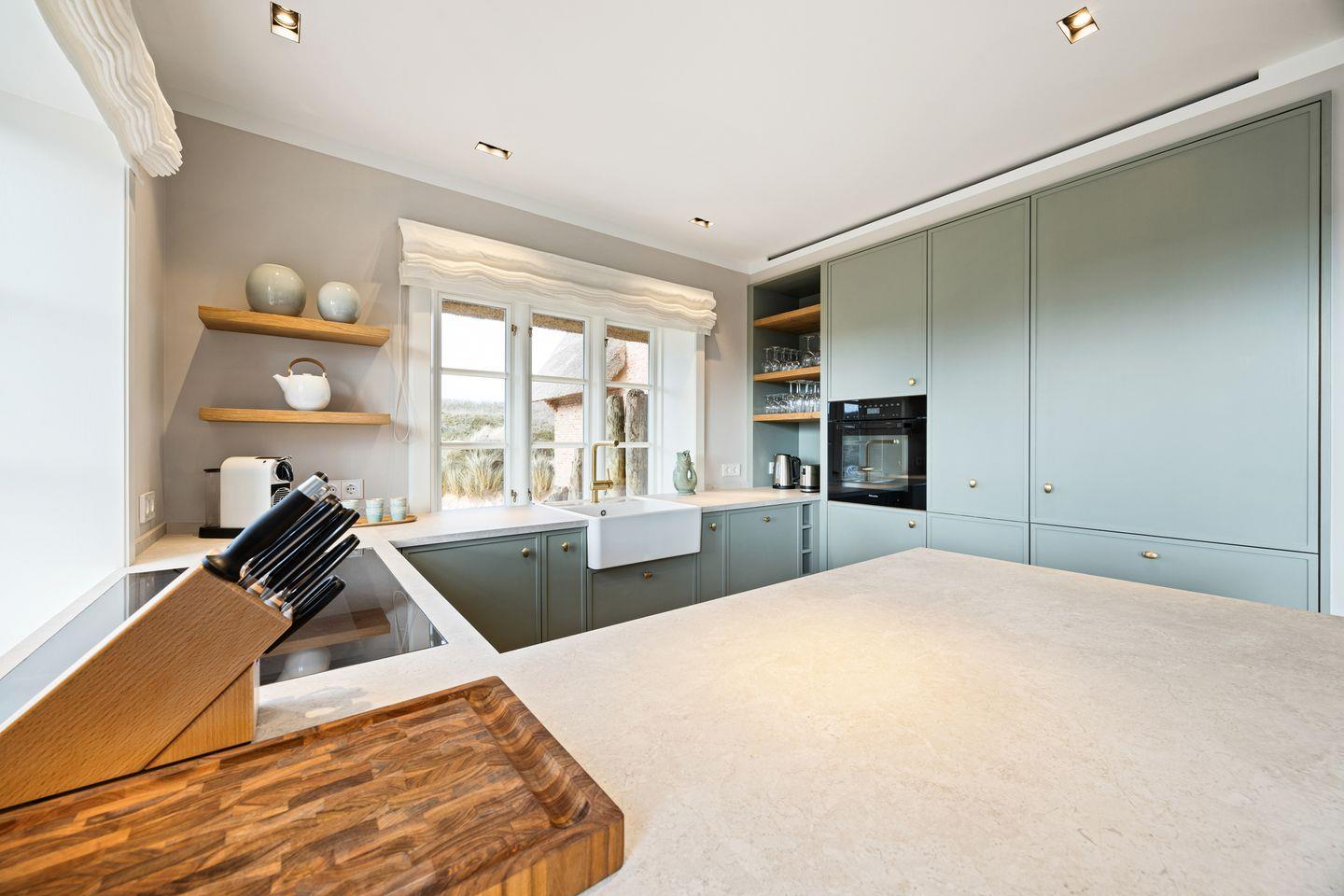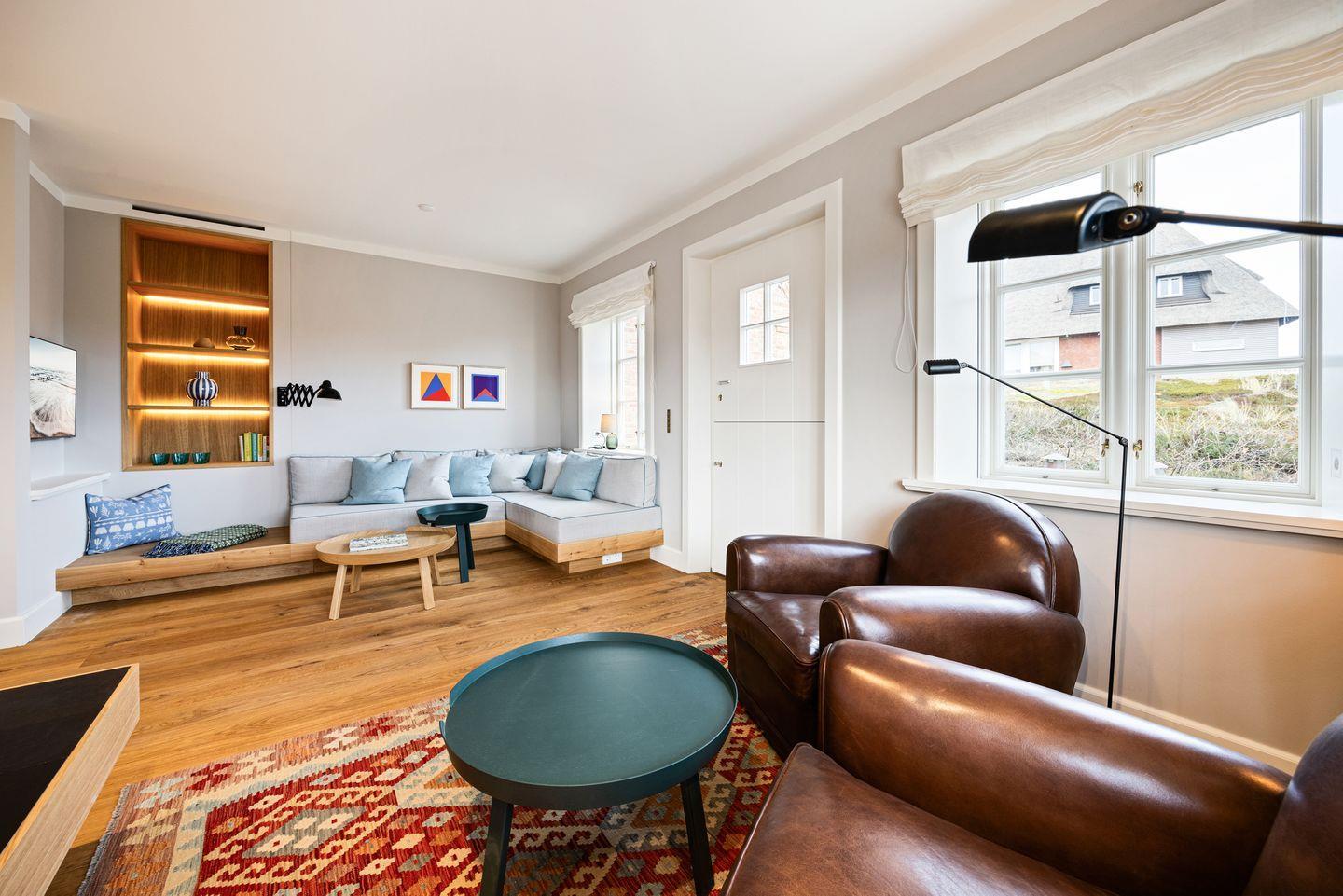 Der offene Wohn- und Essbereich beeindruckt mit einer stilvollen Einrichtung und einer einladenden Atmosphäre. Der große Esstisch, ein rustikaler Brauhaustisch in einer sonnigen Sitzecke, lädt zu geselligen Mahlzeiten ein. Gegenüber befindet sich die moderne Kochinsel, die die offene Raumgestaltung perfekt abrundet. Der elegante Gaskamin sorgt an kühleren Abenden für wohlige Wärme und Gemütlichkeit. In der Sofaecke oder den zwei bequemen Ledersesseln können Sie entspannen und die einmalige Aussicht auf die Dünenlandschaft genießen.
