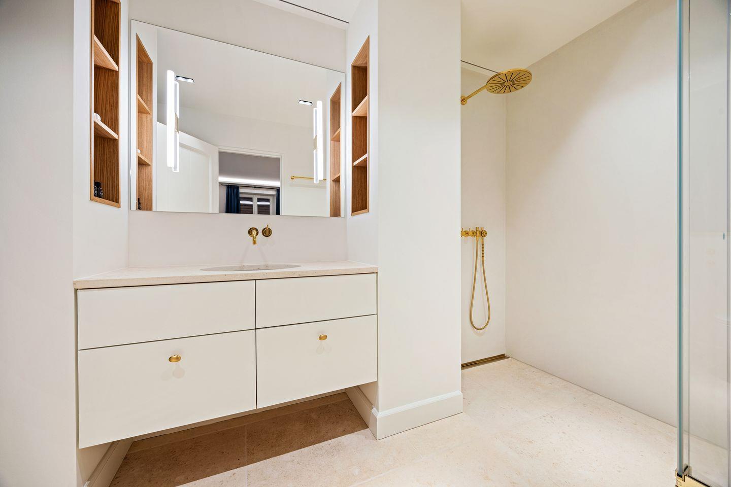 Die vier modernen Badezimmer mit bodengleichen Regenduschen garantieren Ihnen ein luxuriöses Duscherlebnis. Hochwertige Armaturen und stilvolle Gestaltung schaffen ein harmonisches Ambiente. Zusätzlich steht ein separates Gäste-WC zur Verfügung.