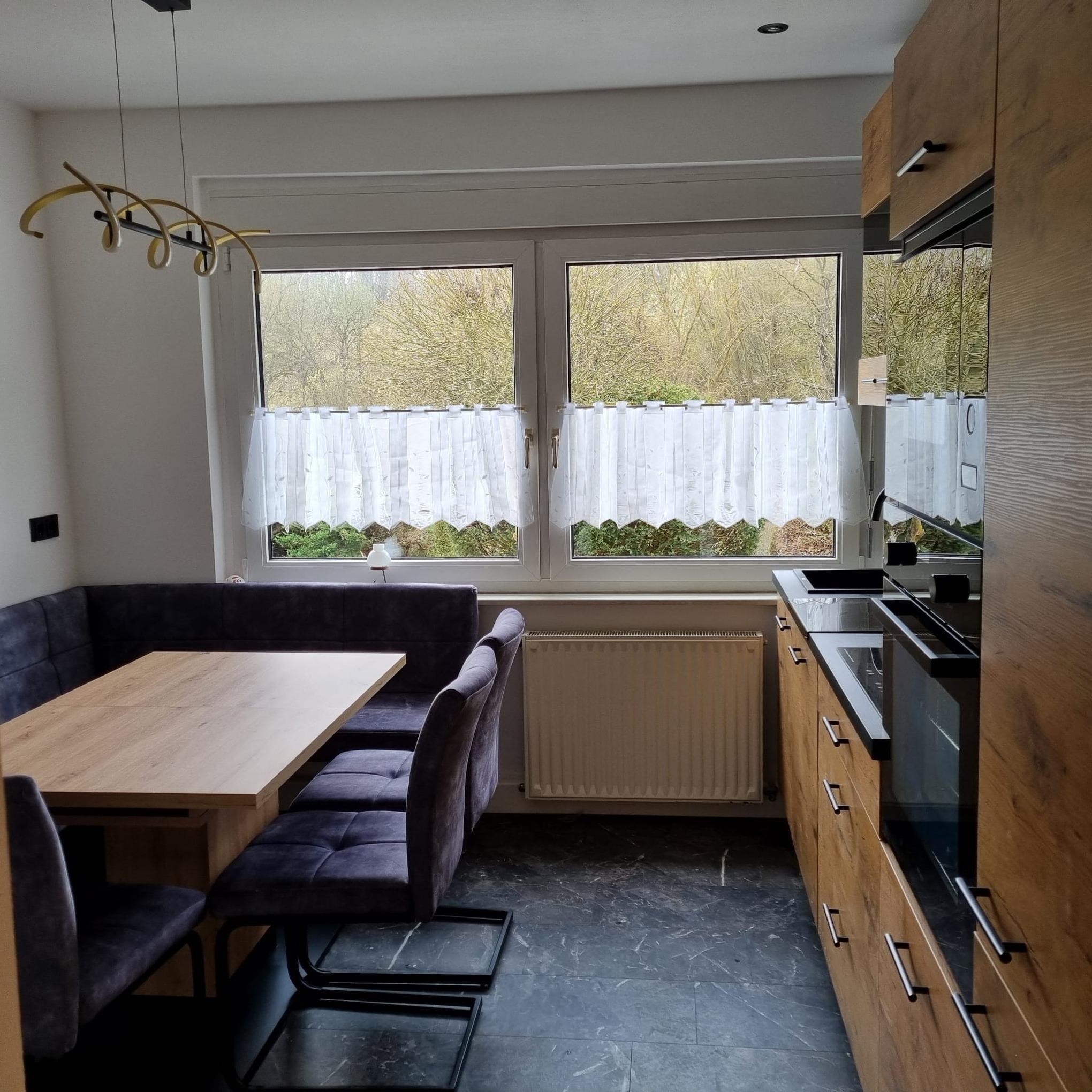 Die Küche hat einen E-Herd mit Backofen, eine Mikrowelle, Geschirrspüler und Spüle, einen Kühlschrank und Gefrierschrank sowie eine Kaffeemaschine, Wasserkocher, Toster, Eierkocher, Geschirr und Besteck.