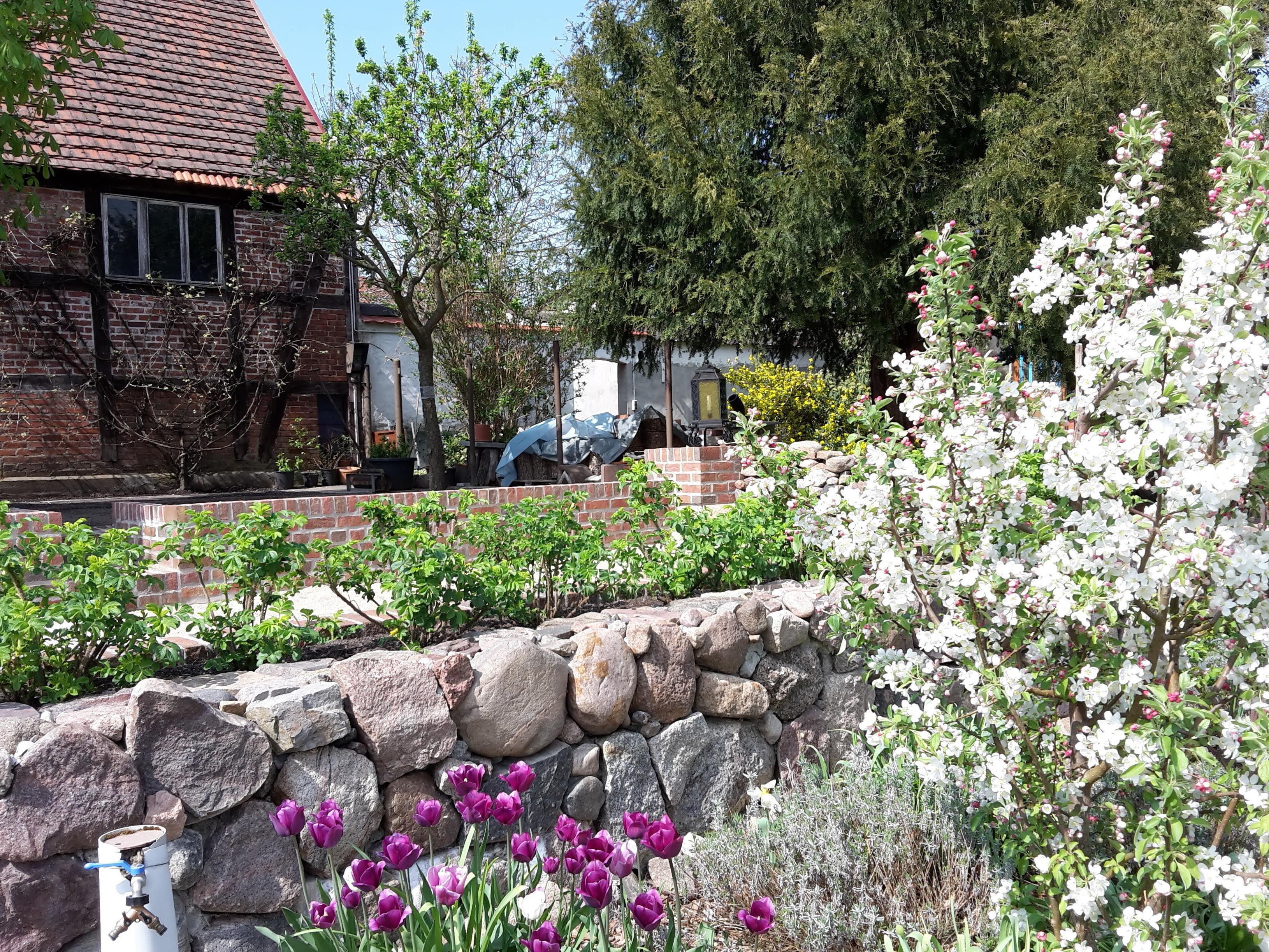 Im Außenbereich befinden sich im Innenhof sowie im Garten ausreichend Stühle, mehrere Sitzbänke, Tische sowie Sonnenliegen. Am Wasserfall können Sie relaxen. Unsere Burgruine ist ein Hingucker für unsere großen und kleinen Gäste. Gern können Sie die Feuerschale für ein gemütliches Beisammensein nutzen. Für unsere kleinen Gäste bieten wir einen hauseigenen Sandstrand hinter der Scheune. Der Strandkorb dazu bietet die perfekte Sommer-Sonne-Sand-Urlaubszeit. Zudem bieten wir für Erwachsene Fahrräder (Herren- oder Damenrad) an. Bis zu 3 PKW-Stellplätze sind auf unserem abschließbaren Hof kostenfrei abstellbar.