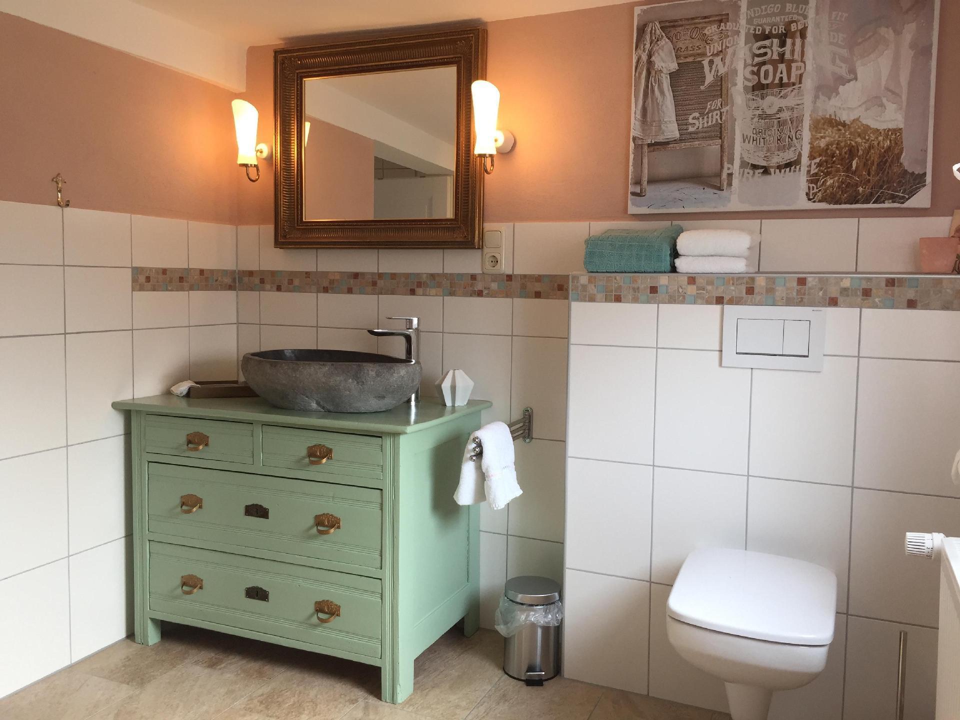 Our holiday home was built in 1748 and completely renovated in 2017. The former farmhouse has been lovingly furnished in country house style and offers a cosy place for your stay. It has two spacious bathrooms with walk-in showers, a separate living room with a high-quality piano, three separate bedrooms and a cosy, fully equipped kitchen with adjoining dining room. The balcony is directly accessible from the dining area. You are welcome to use the seating areas in the courtyard and garden.