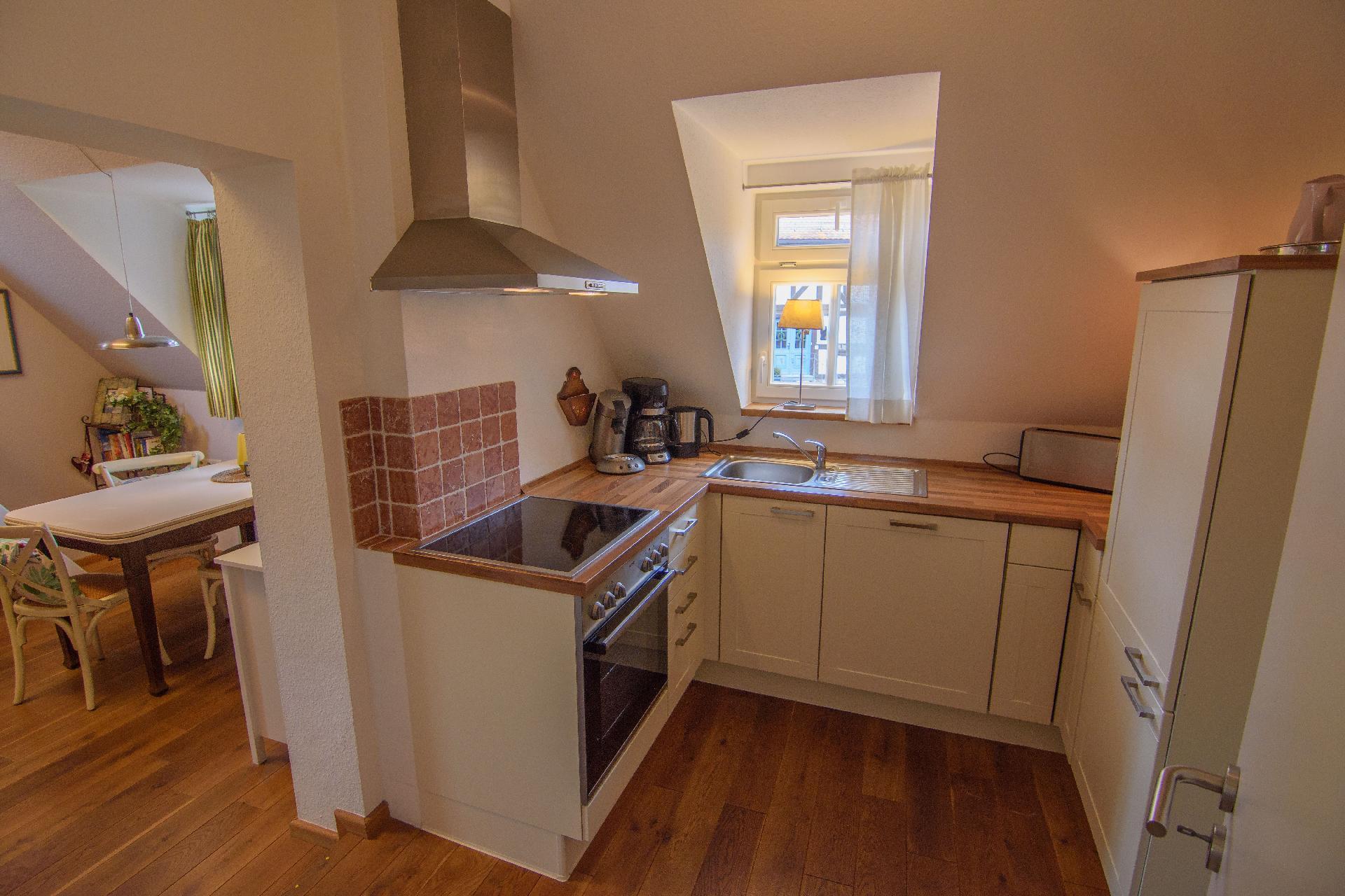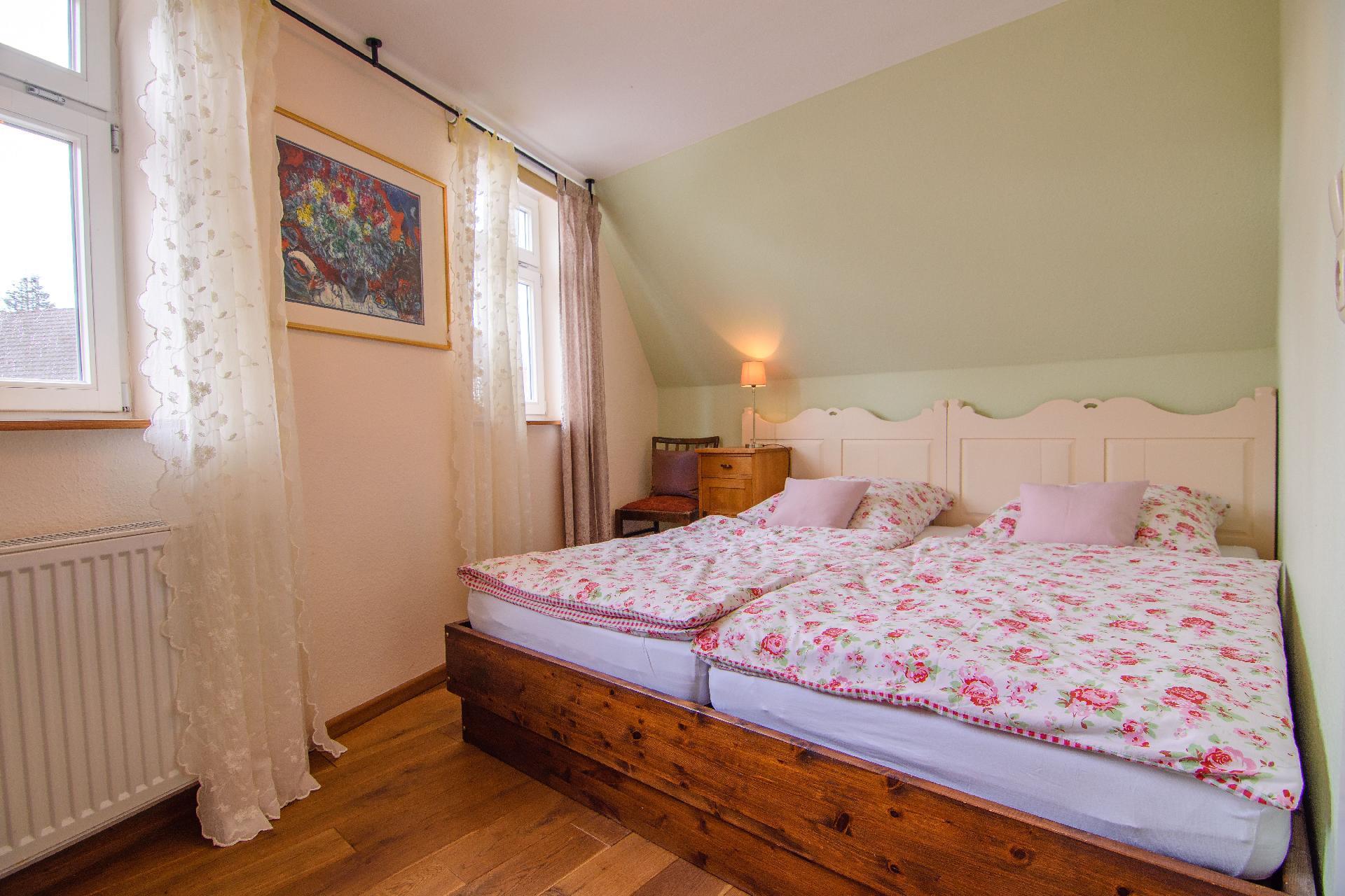 Our holiday flat 1 is located in a converted part of the outbuildings from the 19th century. The former granary has been lovingly converted and transformed into a cosy flat in a stylish country house style. This cosy flat offers you space for a relaxing holiday for two or a business stay. It has a shower room with walk-in shower, a separate bedroom, a fully equipped kitchen and a living/dining area with access to the sleeping loft, which can be used as additional sleeping accommodation. You are welcome to use the seating in the courtyard and garden.