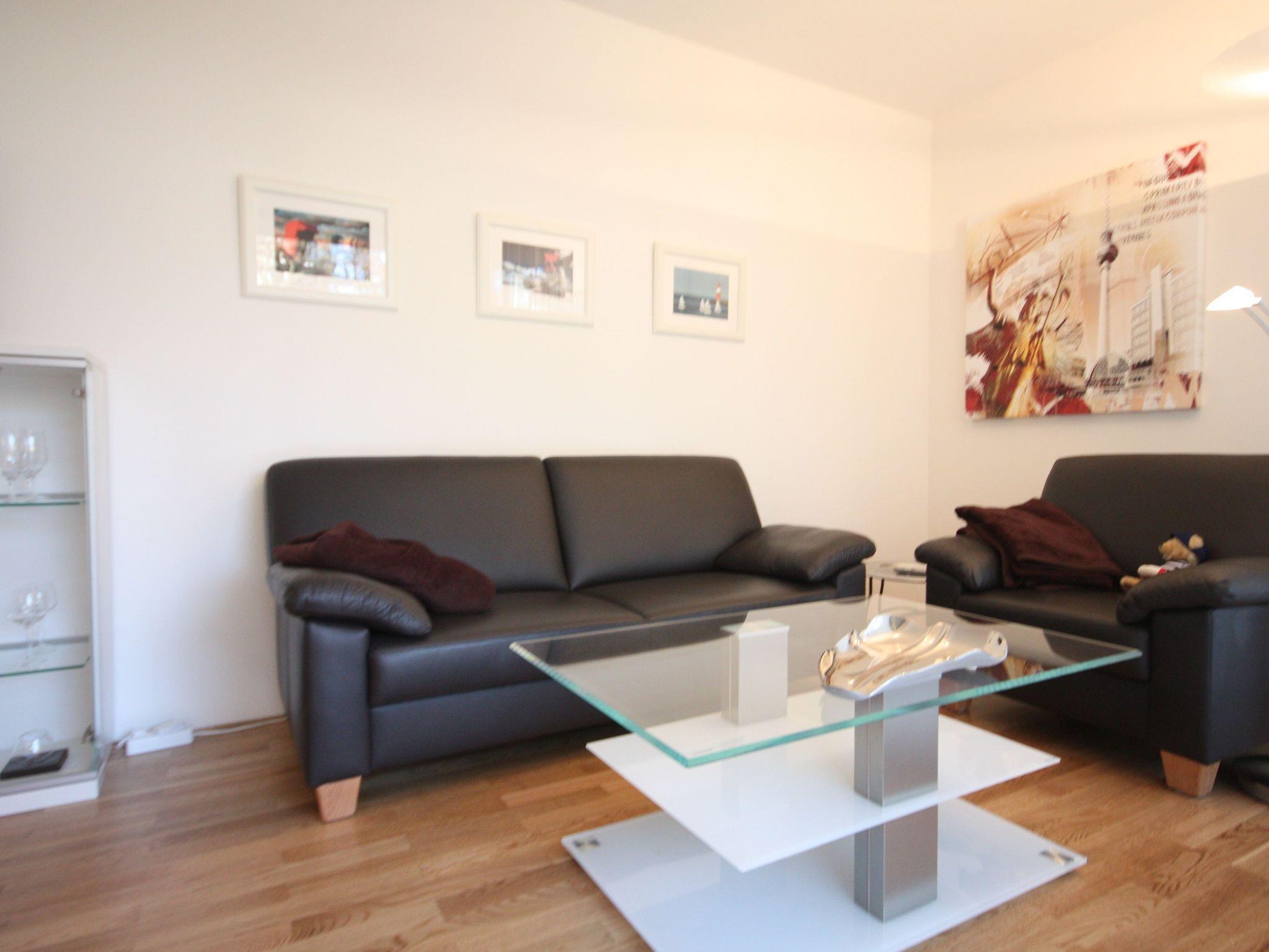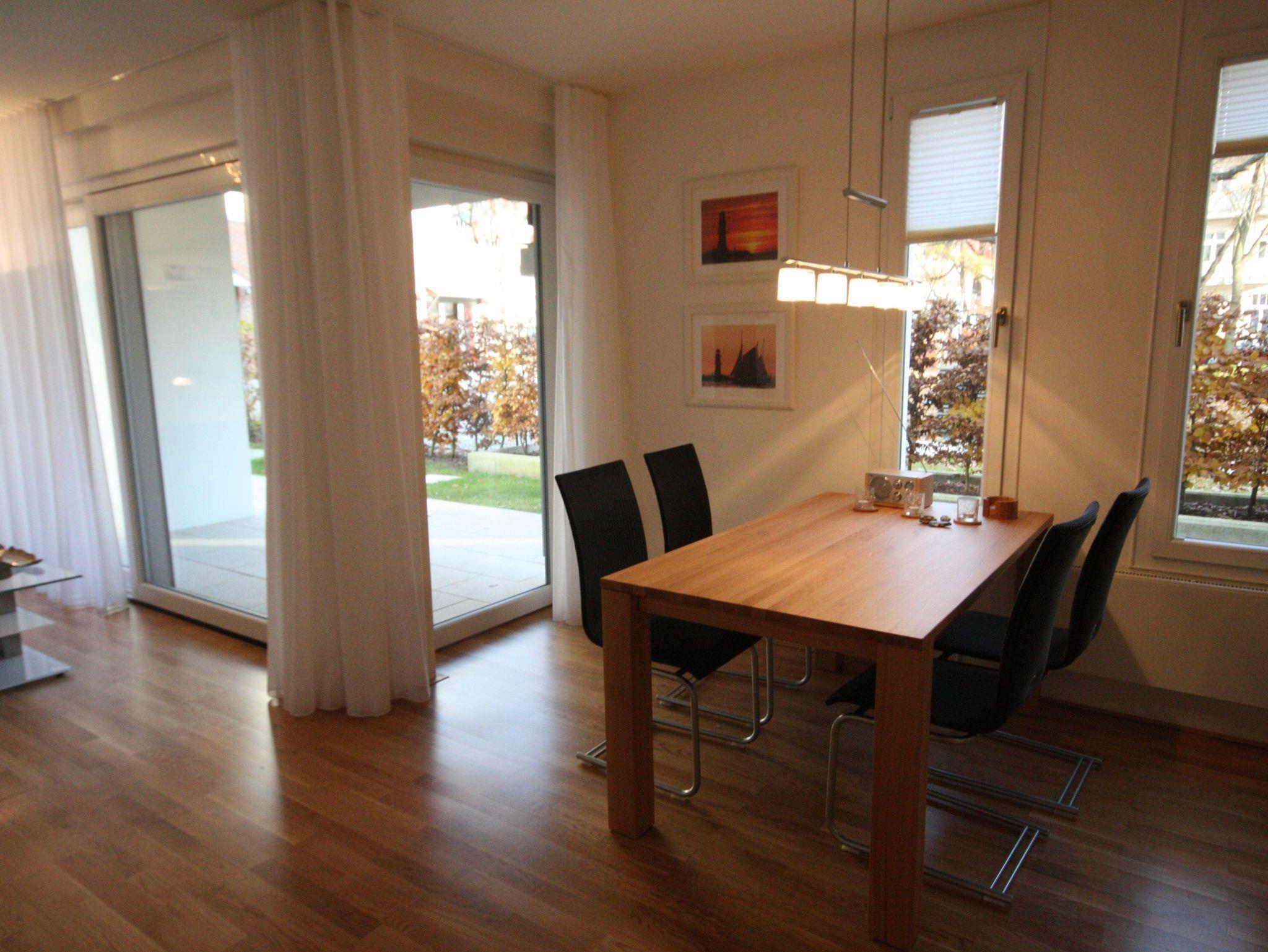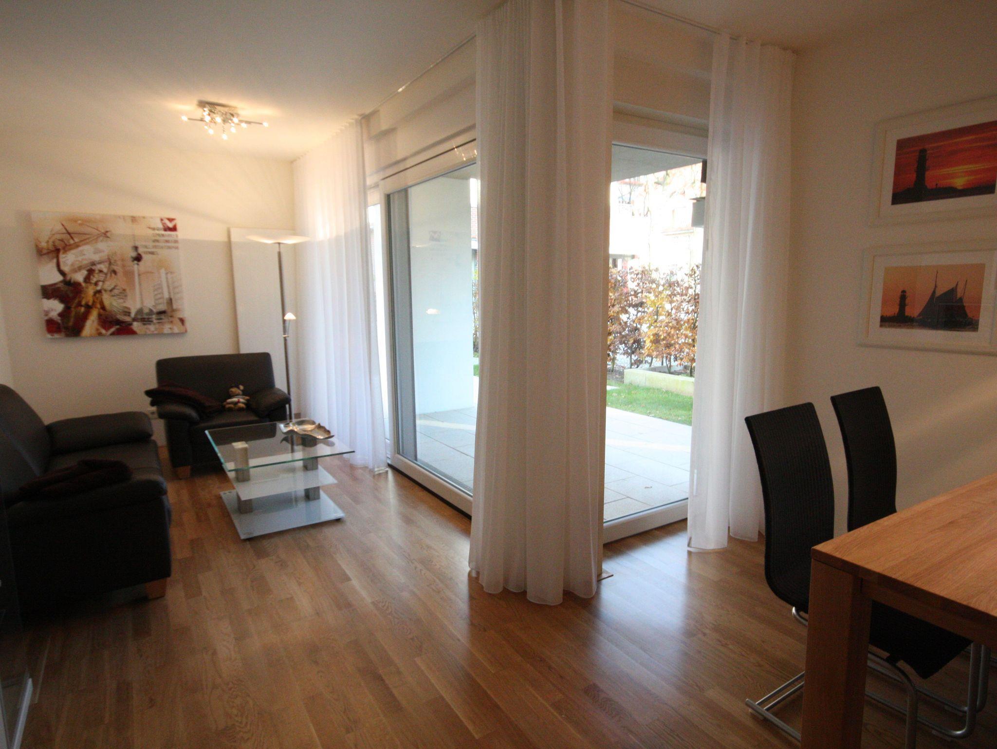 Sie ist hell und modern eingerichtet. Bodentiefe Fenster im Wohnzimmer geben ein exklusives Ambiente. Vom Sofa können Sie auf die Terrasse und den herrlich grün angelegten Vorgarten der Residenz schauen.