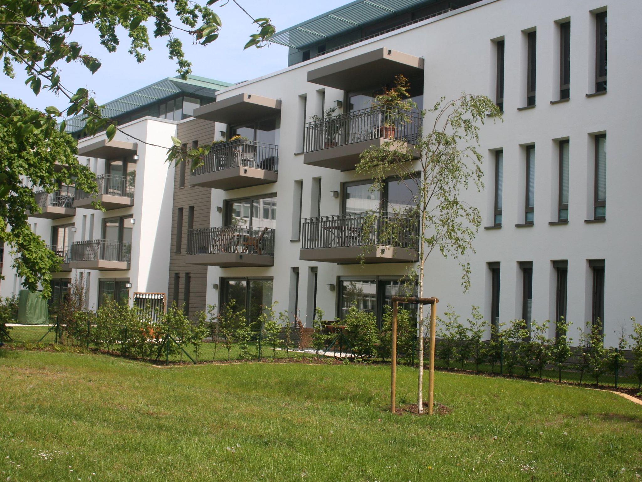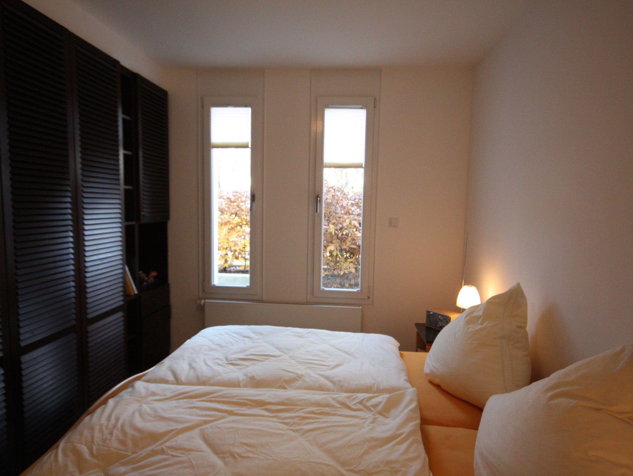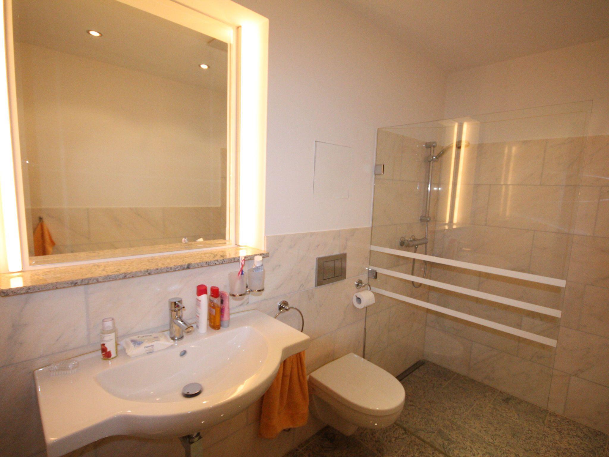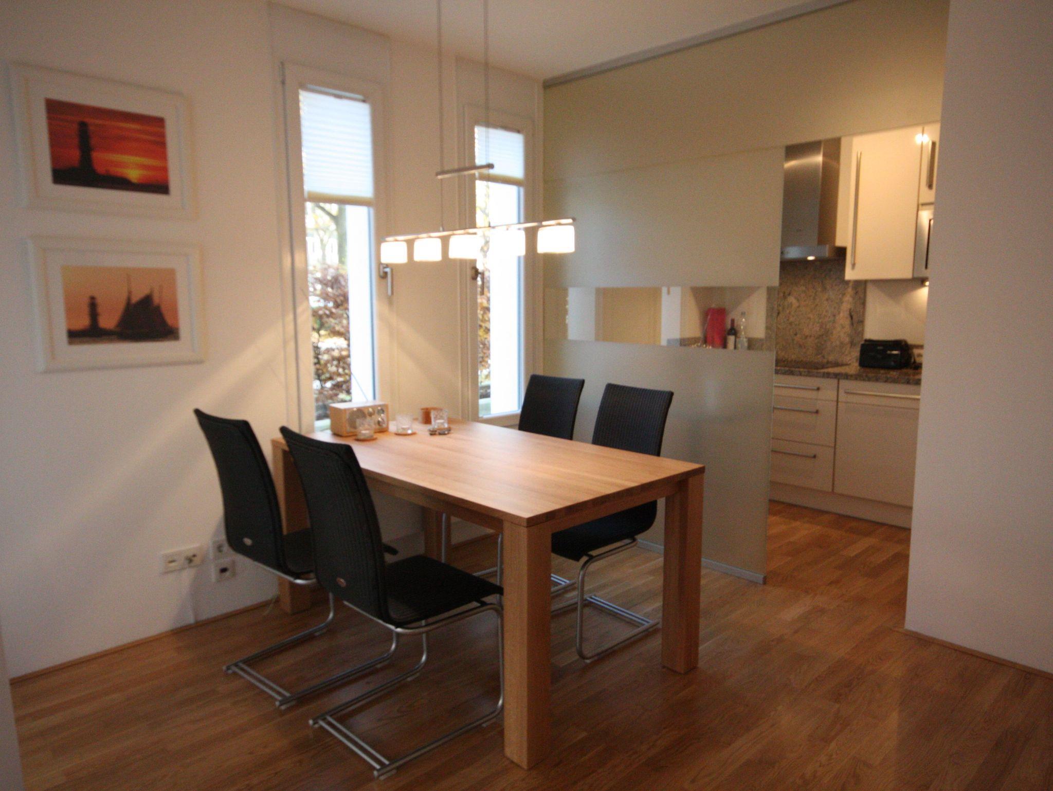 Sie ist hell und modern eingerichtet. Bodentiefe Fenster im Wohnzimmer geben ein exklusives Ambiente. Vom Sofa können Sie auf die Terrasse und den herrlich grün angelegten Vorgarten der Residenz schauen.