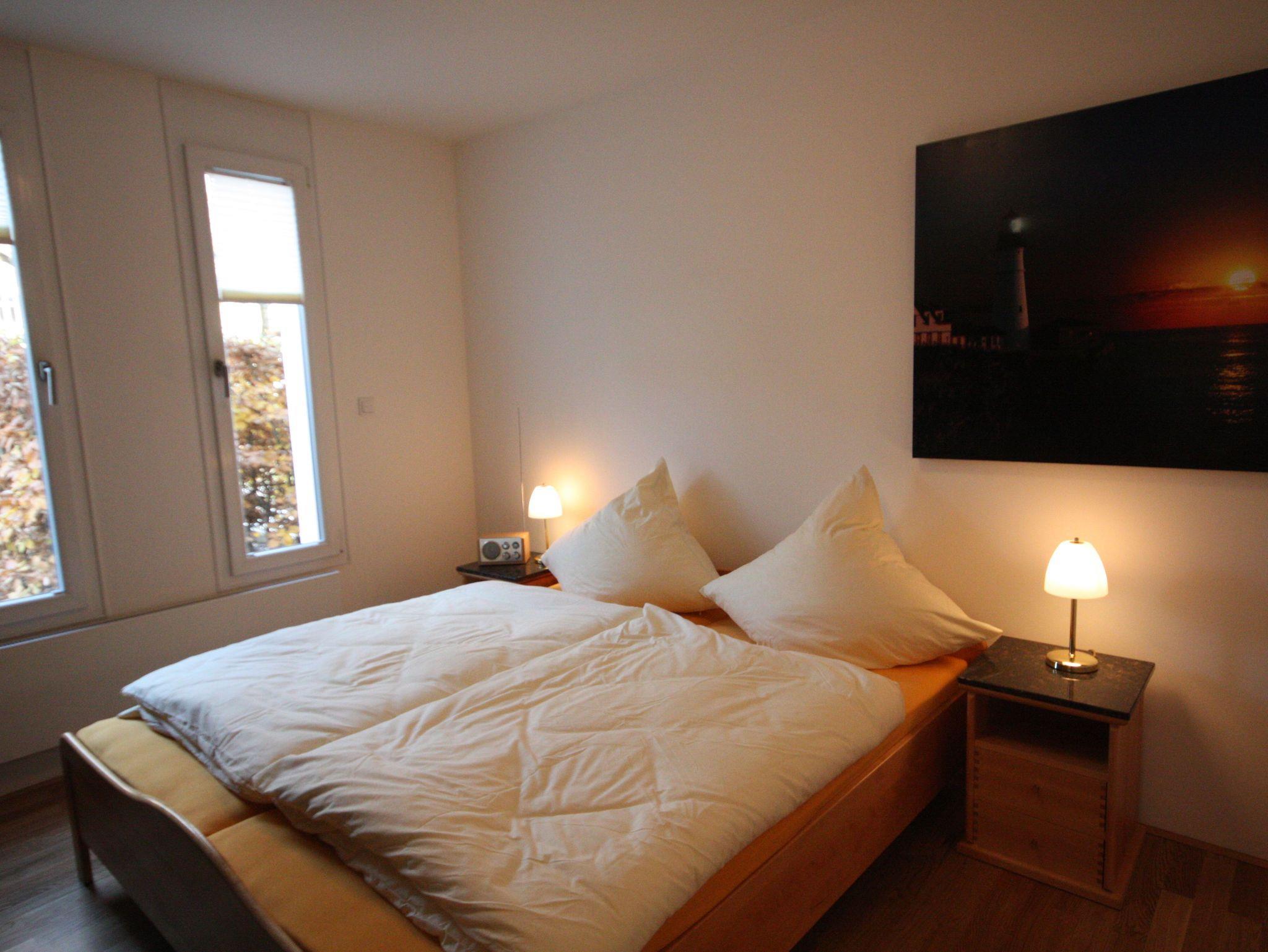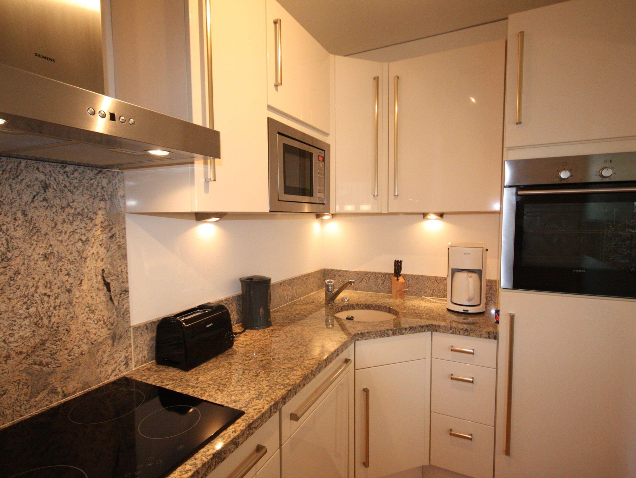 Die sehr gut ausgestattete Küche ist mit einer mattierten edlen Glaswand optisch vom Wohnraum getrennt. Das Schlafzimmer ist mit Doppelbett und einem großen Schrank ausgestattet. Das Badezimmer verfügt über eine begehbare Dusche.