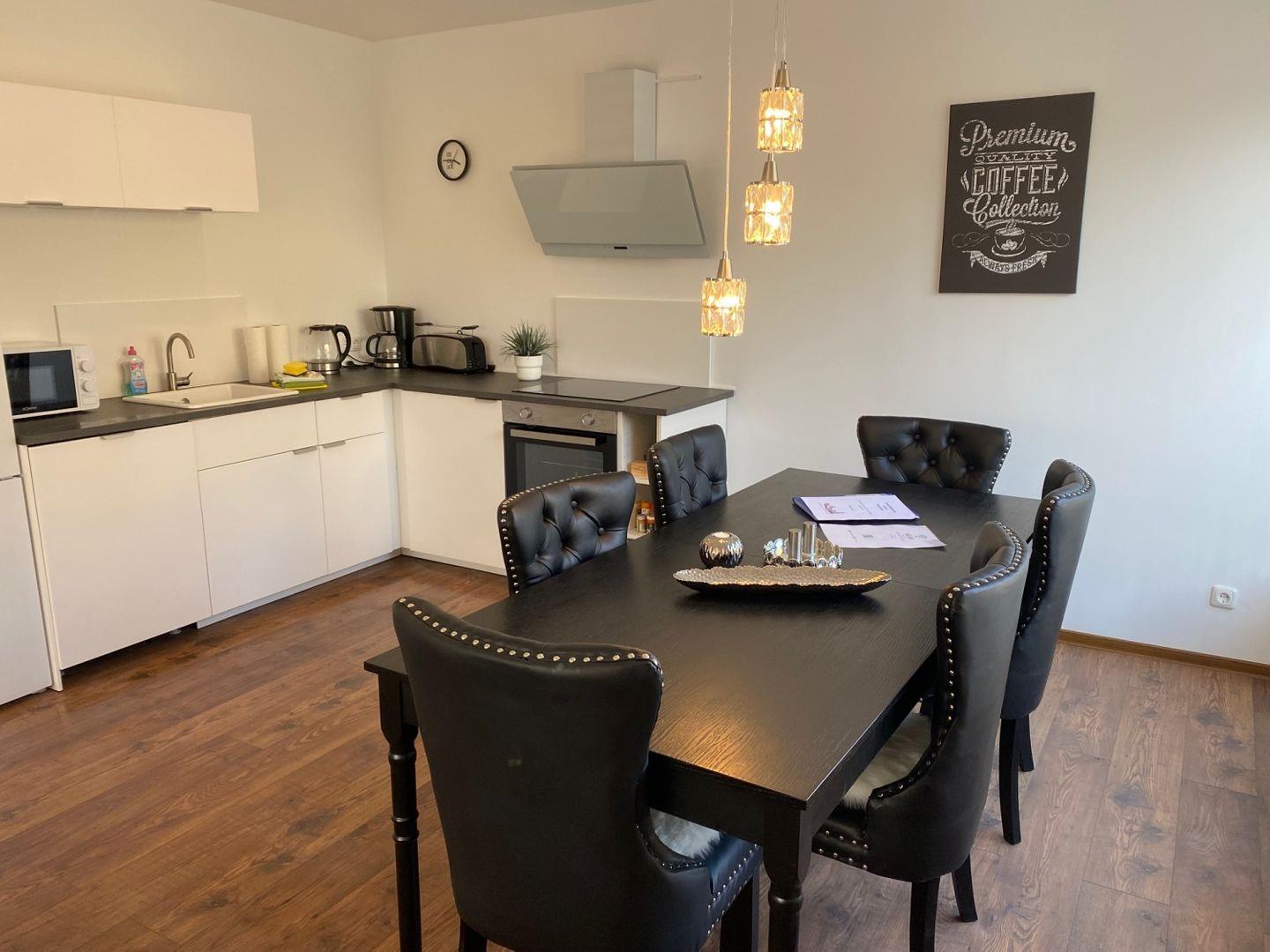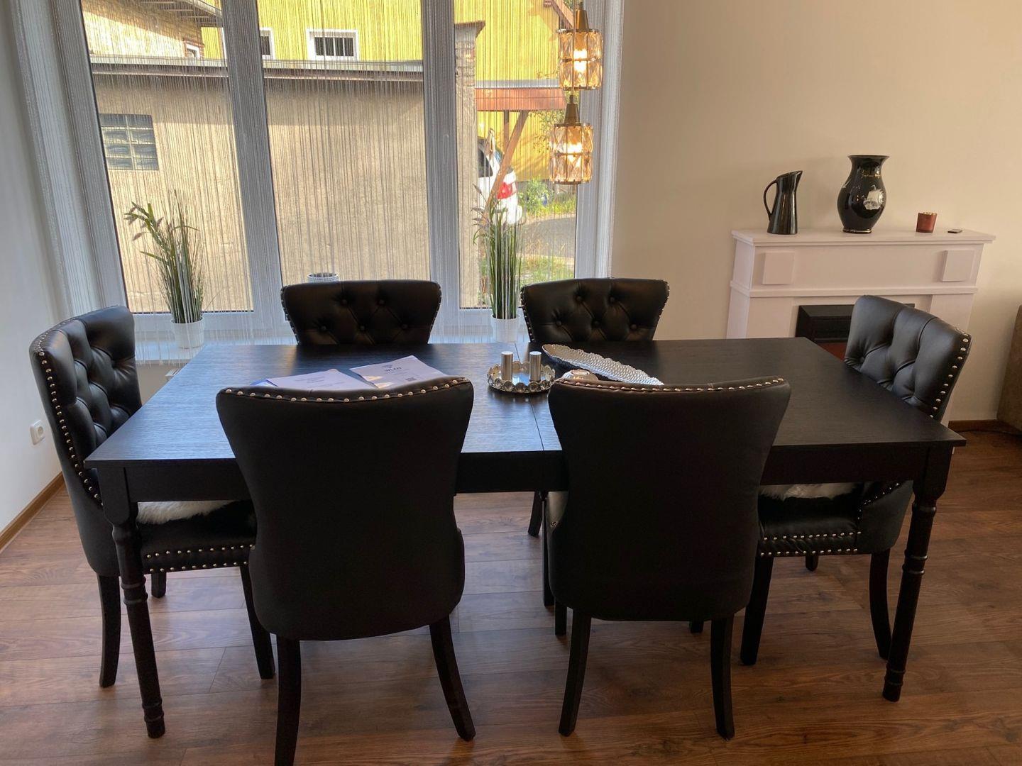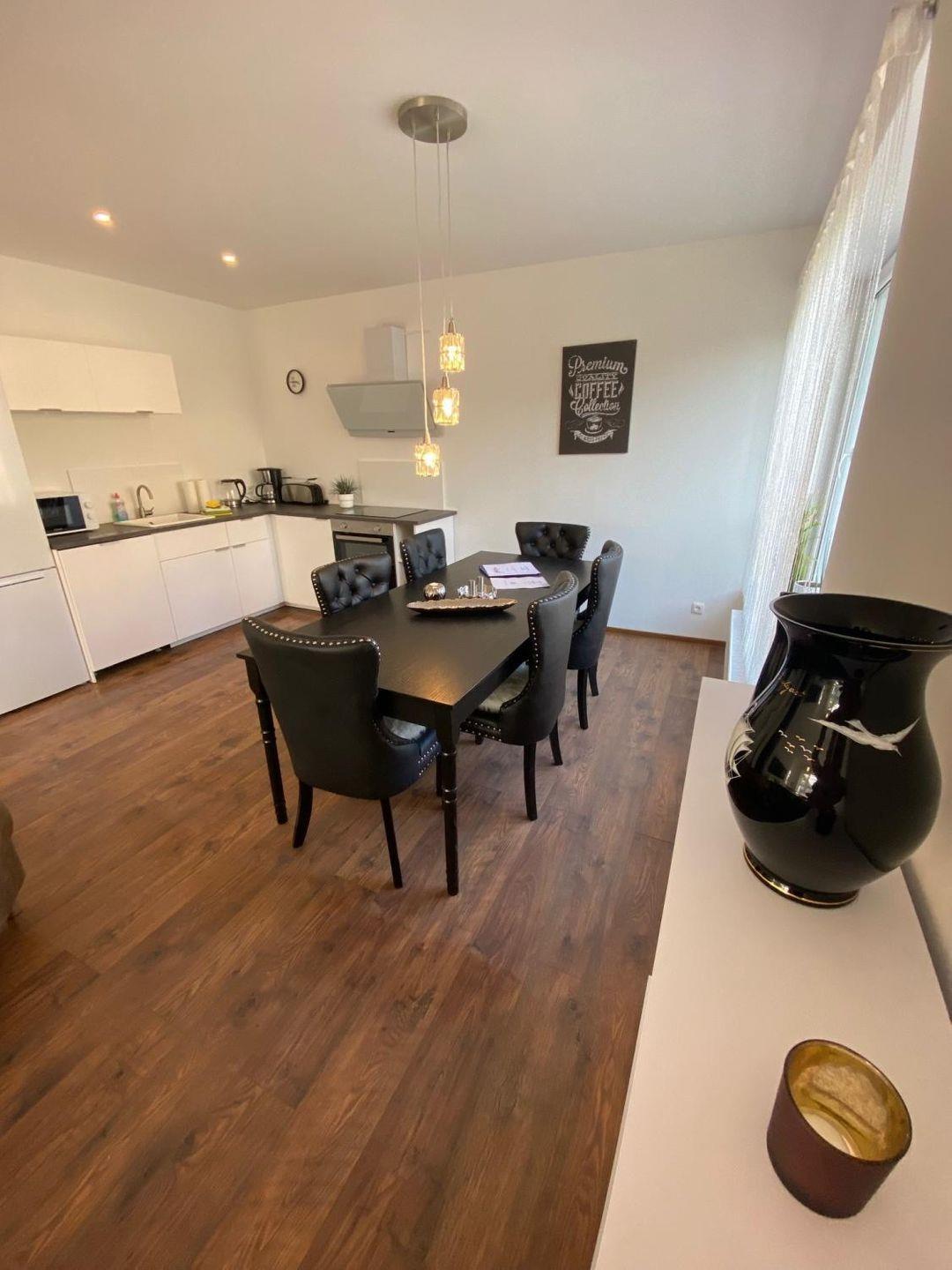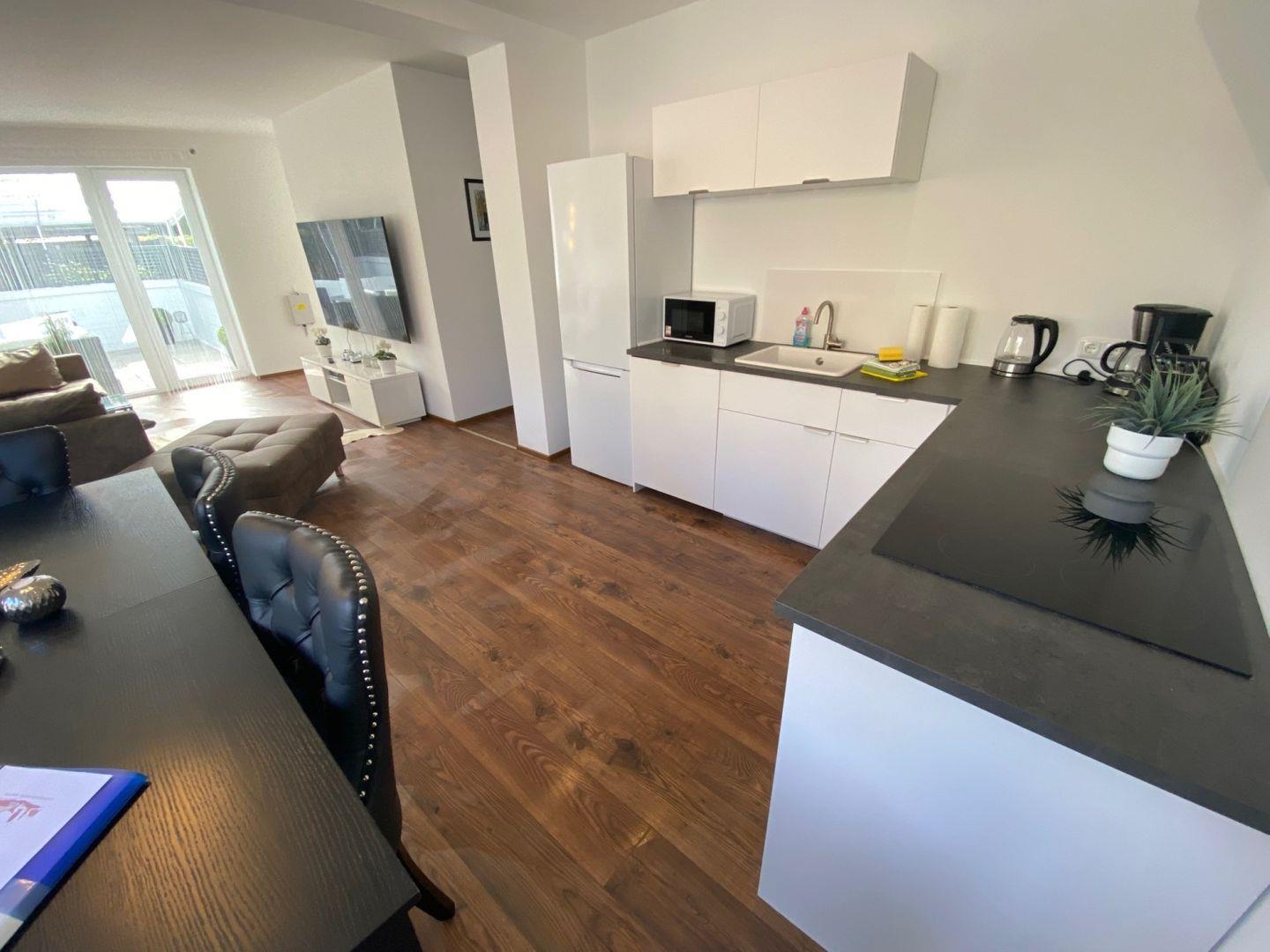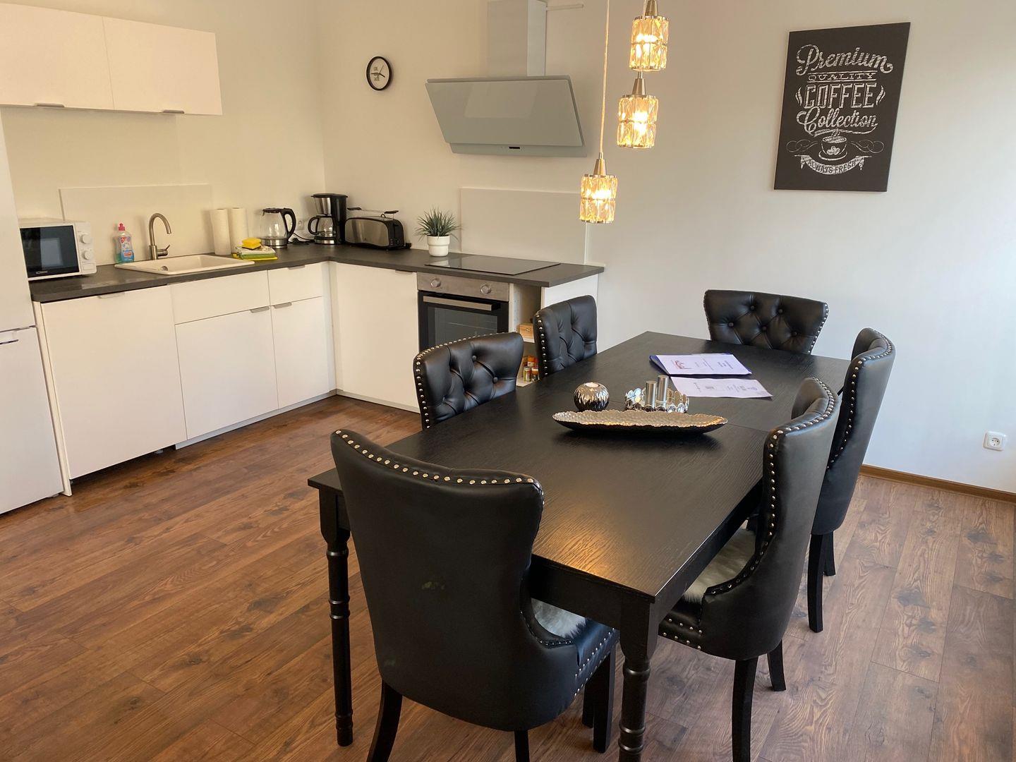 Unsere vollausgestattete offene Küche mit Kühlschrank, Herd, Backofen, Toaster, Mikrowelle, Wasserkocher, Kaffeemaschine uvm. bietet Ihnen alles, was Sie zum Vorbereiten für ein tolles Frühstück oder Abendessen benötigen. Am ausziehbaren großen Esstisch denieren Sie auf hochwertigen Sitzmöbeln.