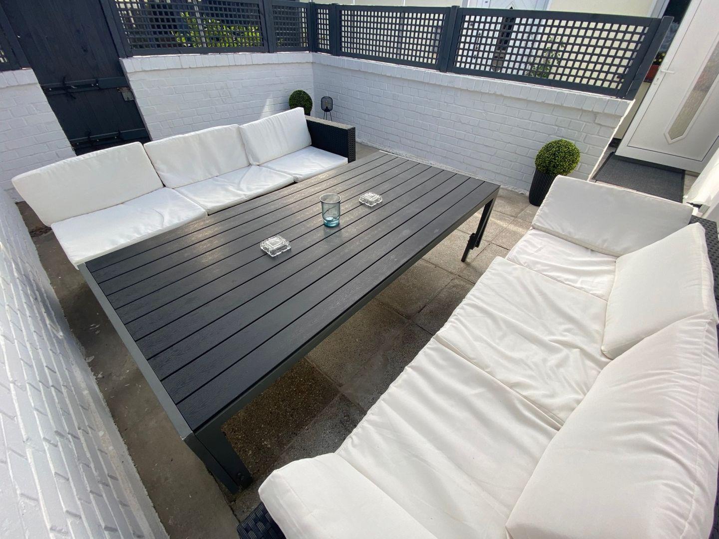 Die überdachte Süd-Terrasse ist mit 2 Outdoor-Sofas und einem großen Esstisch möbliert.