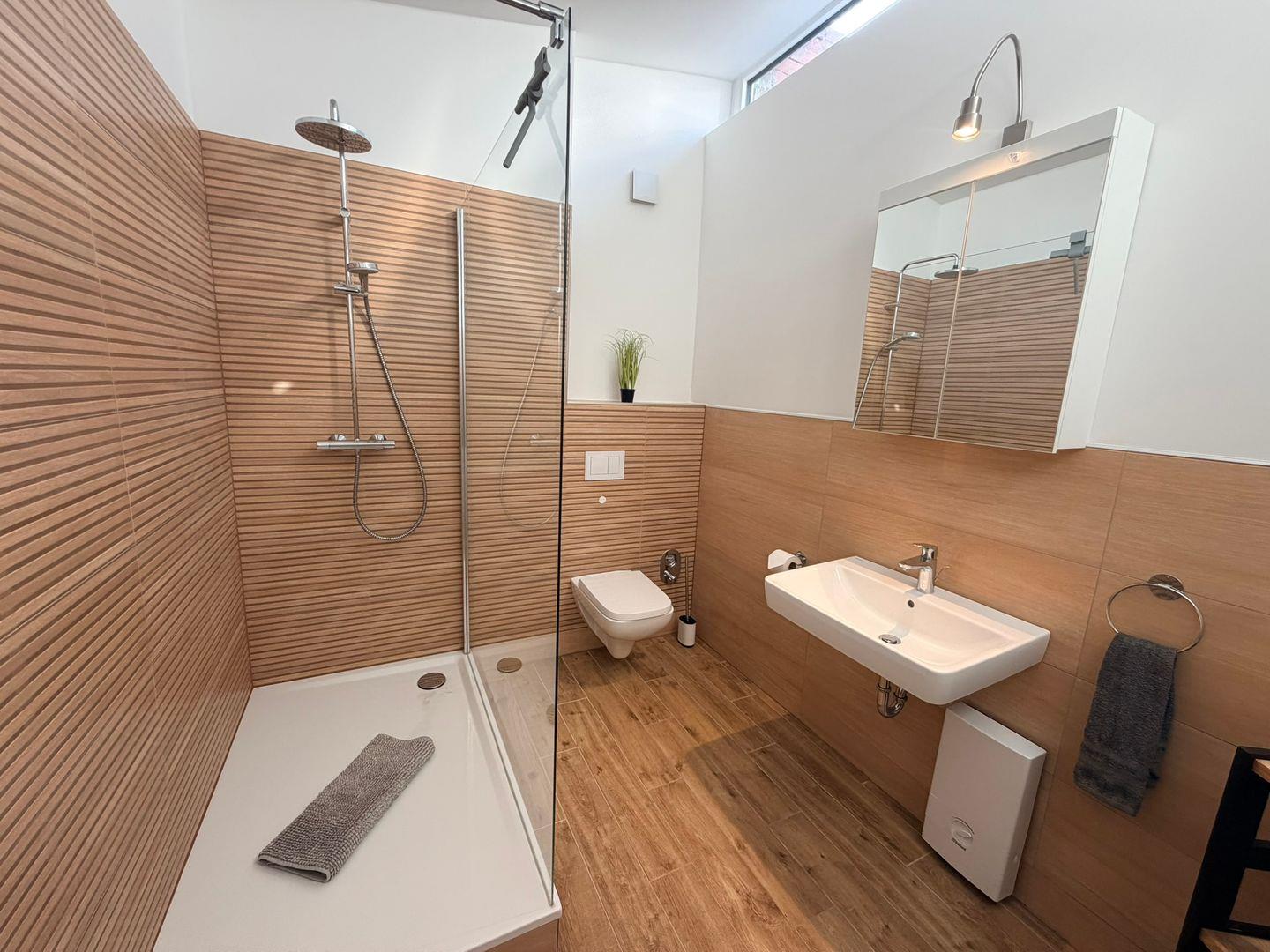 Das Badezimmer verfügt über ein Fenster, Waschbecken, Spiegel, Ganzkörperspiegel, WC und eine Dusche mit Wanne. Handtücher, Badetücher und Bettwäsche sind vorhanden. Zusätzlich stehen Ihnen eine Waschmaschine zur Eigennutzung, ein Wäscheständer, Reinigungsmittel und ein Staubsauger zur Verfügung, was besonders bei längeren Aufenthalten angenehm ist.