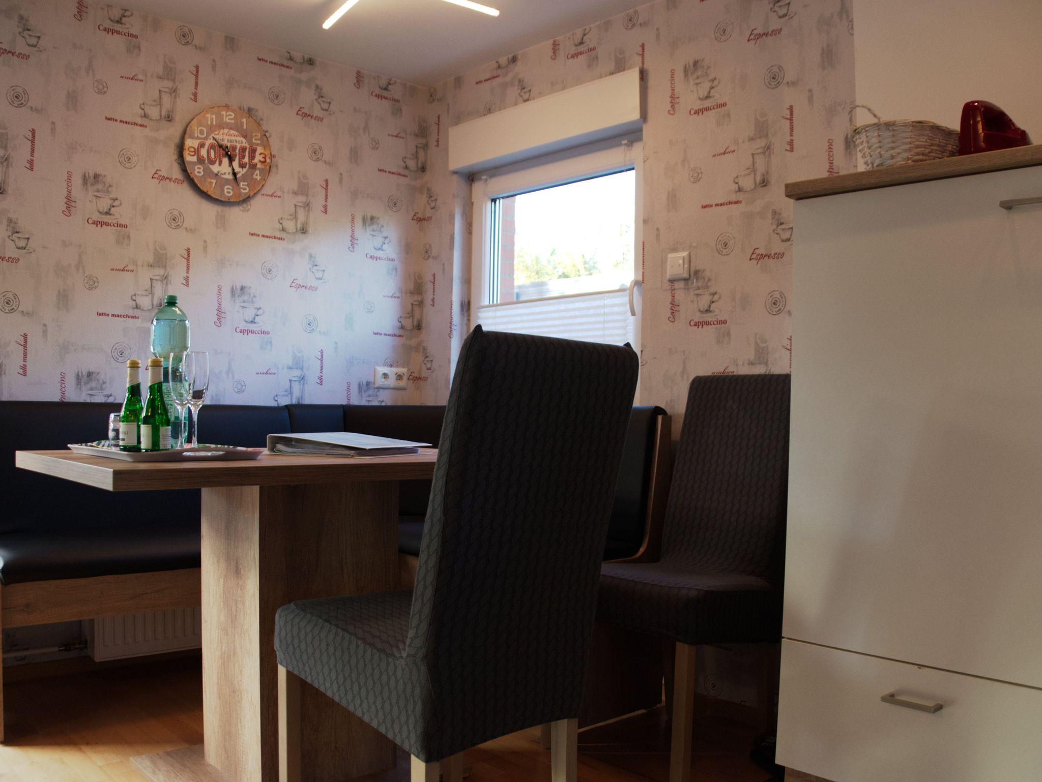 Wohnbereich: Offene, komplett eingerichtete Küche mit Herd, Spülmaschine, Kühlschrank mit Gefrierfach und allem, was Sie für Ihren Aufenthalt benötigen. Die Essecke ist mit einer gemütlichen Eckbank ausgestattet, und im Wohnbereich lädt ein Sofa mit Fernseher zum Entspannen ein.