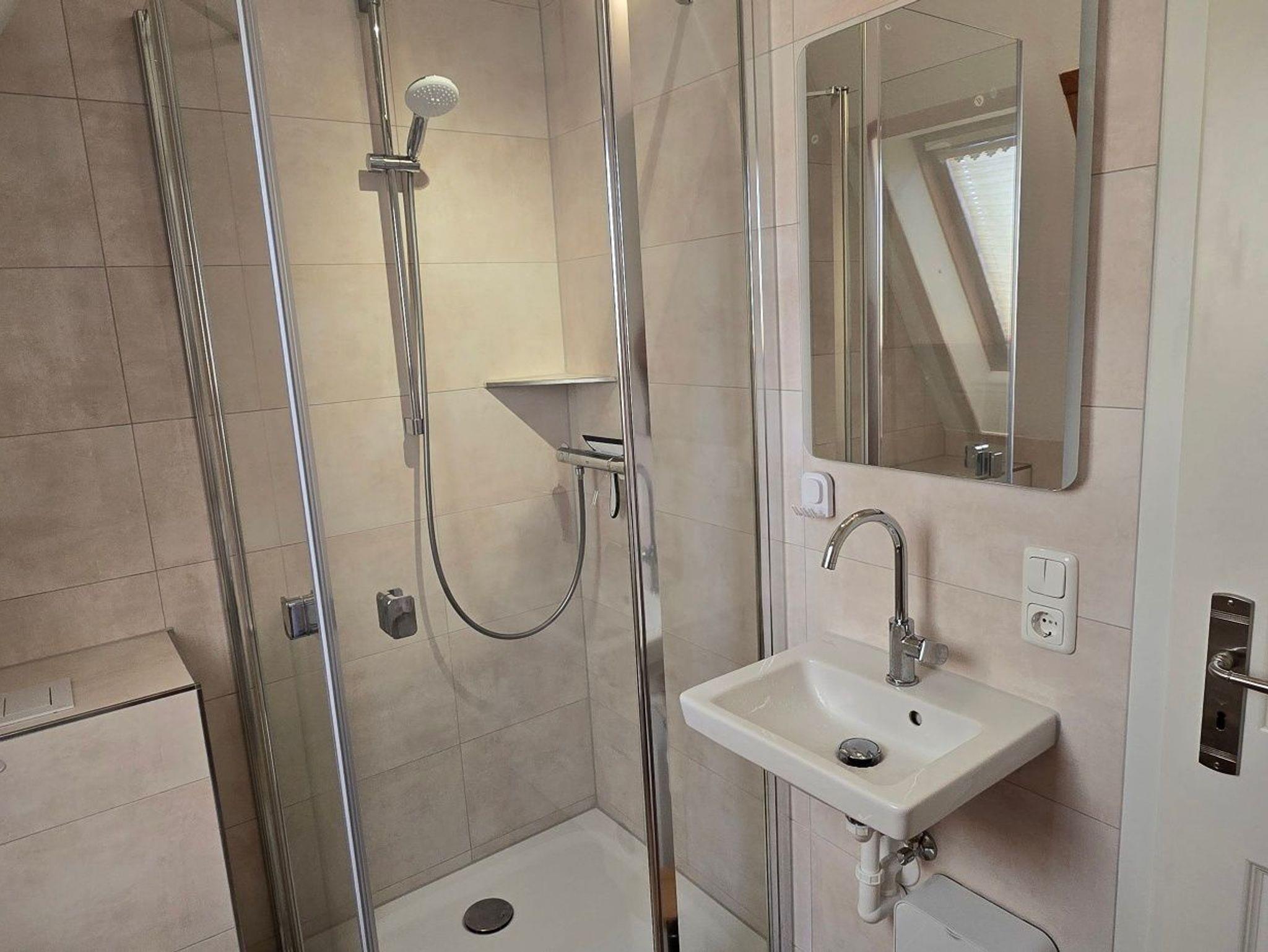 Das Bad ist praktisch und funktional gestaltet, mit Dusche, Toilette, Waschtisch und Spiegelschrank, der ausreichend Stauraum für Pflegeprodukte bietet. Ein zusätzlicher Hochschrank dient zur Aufbewahrung von Badwäsche. Eine Waschmaschine steht für Ihre Wäsche zur Verfügung, und Handtuchhalter sind ausreichend vorhanden.