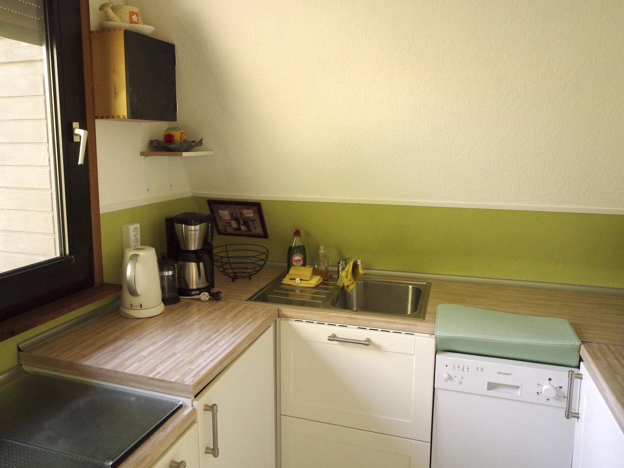 Die Küche ist vollständig ausgestattet und lässt keine Wünsche offen. Sie verfügt über ein modernes Ceran-Kochfeld, Backofen, Mikrowelle, Kühlschrank, Geschirrspüler, Kaffeemaschine, Wasserkocher und Toaster. Darüber hinaus sind Kochutensilien, Töpfe, Pfannen, Auflauf- und Backformen sowie Geschirrtücher und Topflappen vorhanden. Mülltrennung wird vor Ort praktiziert.