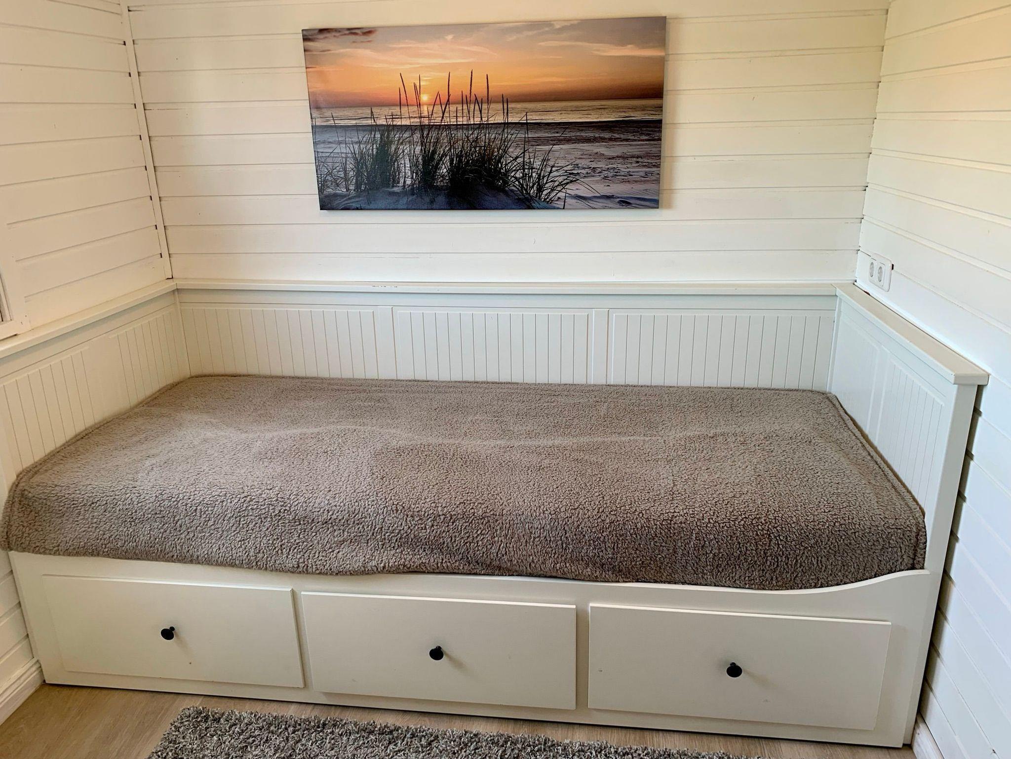 Dieses ca. 50 m² große Ferienhaus bietet Platz für 2 Erwachsene und 1 - 2 Kinder und ist ideal für einen entspannten Urlaub. Das Elternschlafzimmer ist mit einem Doppelbett (1,60 x 2,00 m) ausgestattet, das einen Einstieg von vorne ermöglicht. Das zweite Schlafzimmer verfügt über ein praktisches Ausziehbett (80 x 2,00 m), das auf 1,60 x 2,00 m erweitert werden kann.