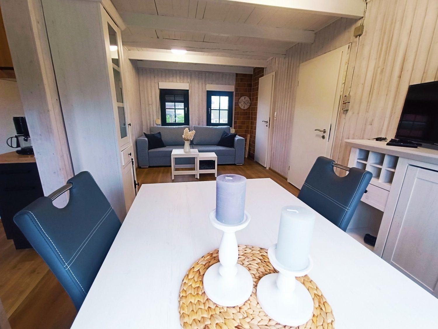 Eine gemütliche Couch , welche in ein Schlafsofa(140x200) umgewandelt werden kann, ein Flachbildschirm-TV und kleine Musikanlage laden zum Verweilen ein. Die in der angrenzenden Küche zubereiteten Speisen können am Esstisch mit mit vier Schwingstühlen eingenommen werden.