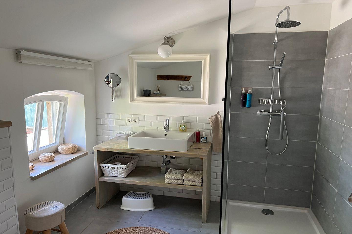 ° Wellnessduschbad, WC, Waschtisch, Föhn und Kosmetikspiegel