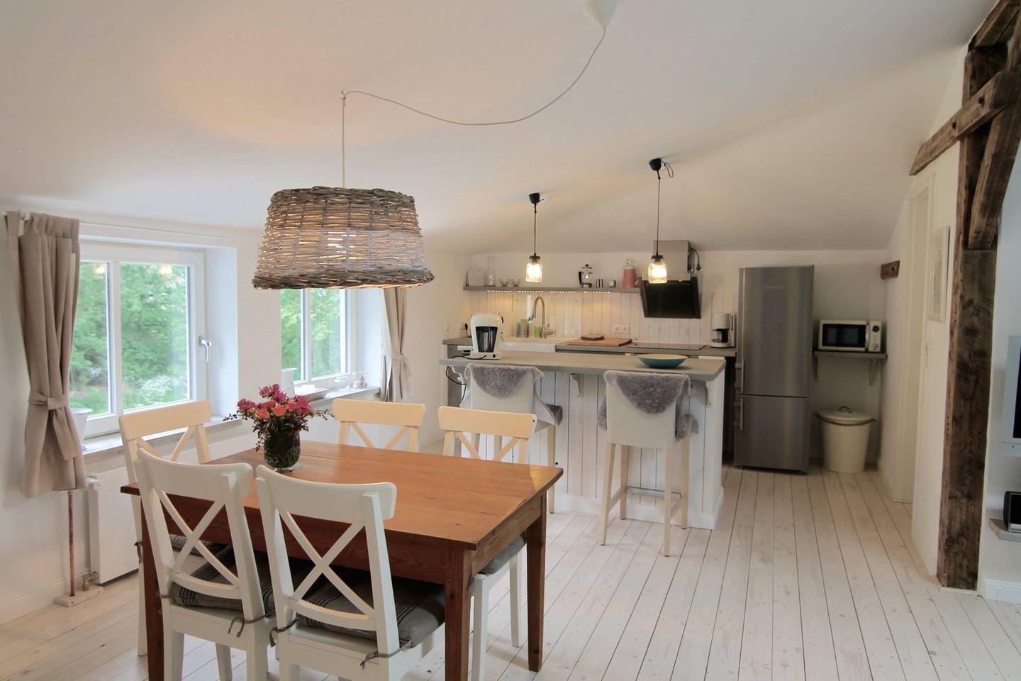 Die im Beachstyle gewählte Einrichtung verleiht diesem sehr gut ausgestatteten Appartement seinen unvergleichlichen nordischen Charme. Der helle offene Wohnessraum mit Holzfußböden und dem Küchentresen als Zentrum, schaffen eine hyggelige Wohnatmosphäre. Ein Kamin sorgt zusätzlich für Gemütlichkeit und Wärme und die freigelegten Holzbalken verleihen der Wohneinheit etwas Besonderes. Moderner lässiger Komfort kann mit allen Annehmlichkeiten eines Bauernhofurlaubes verbunden werden.