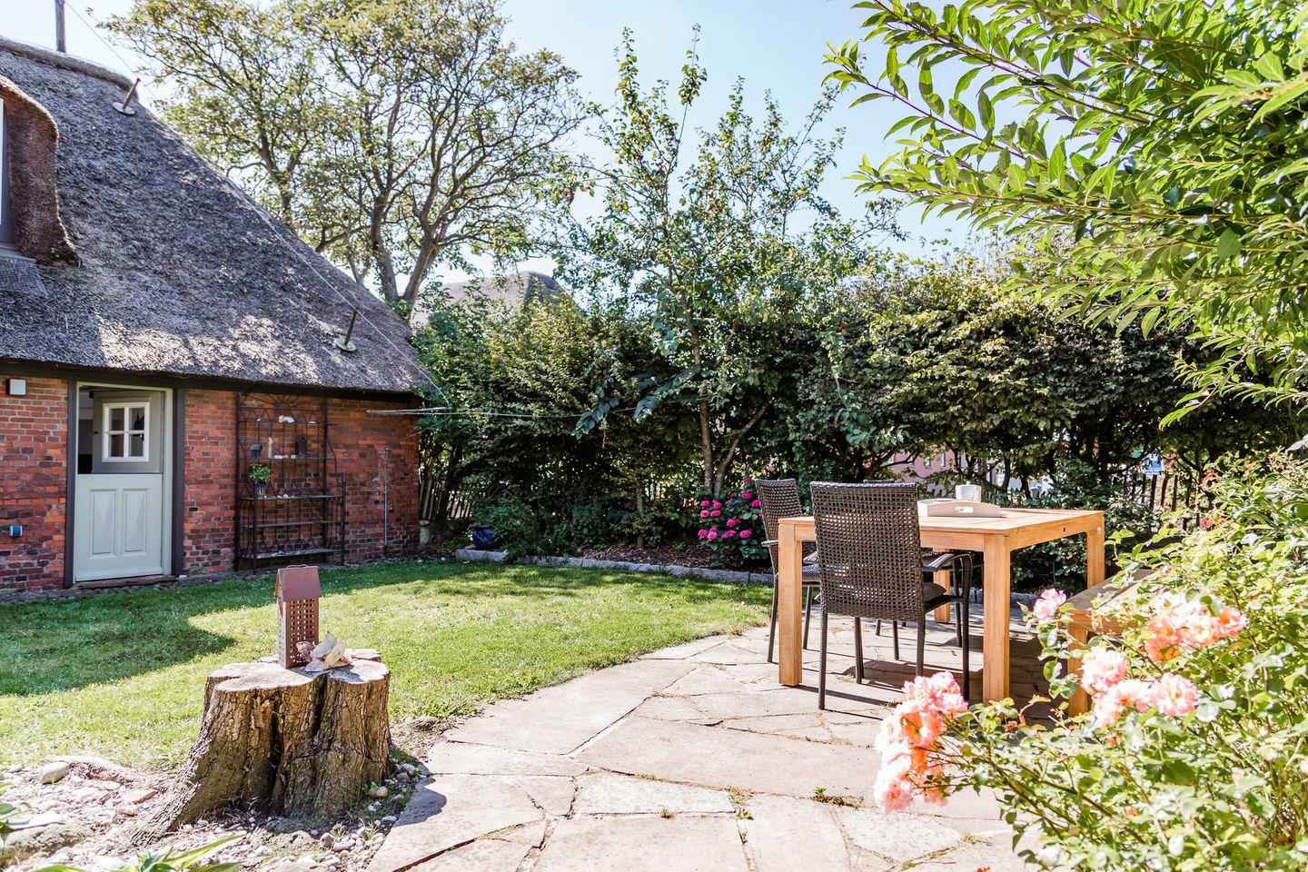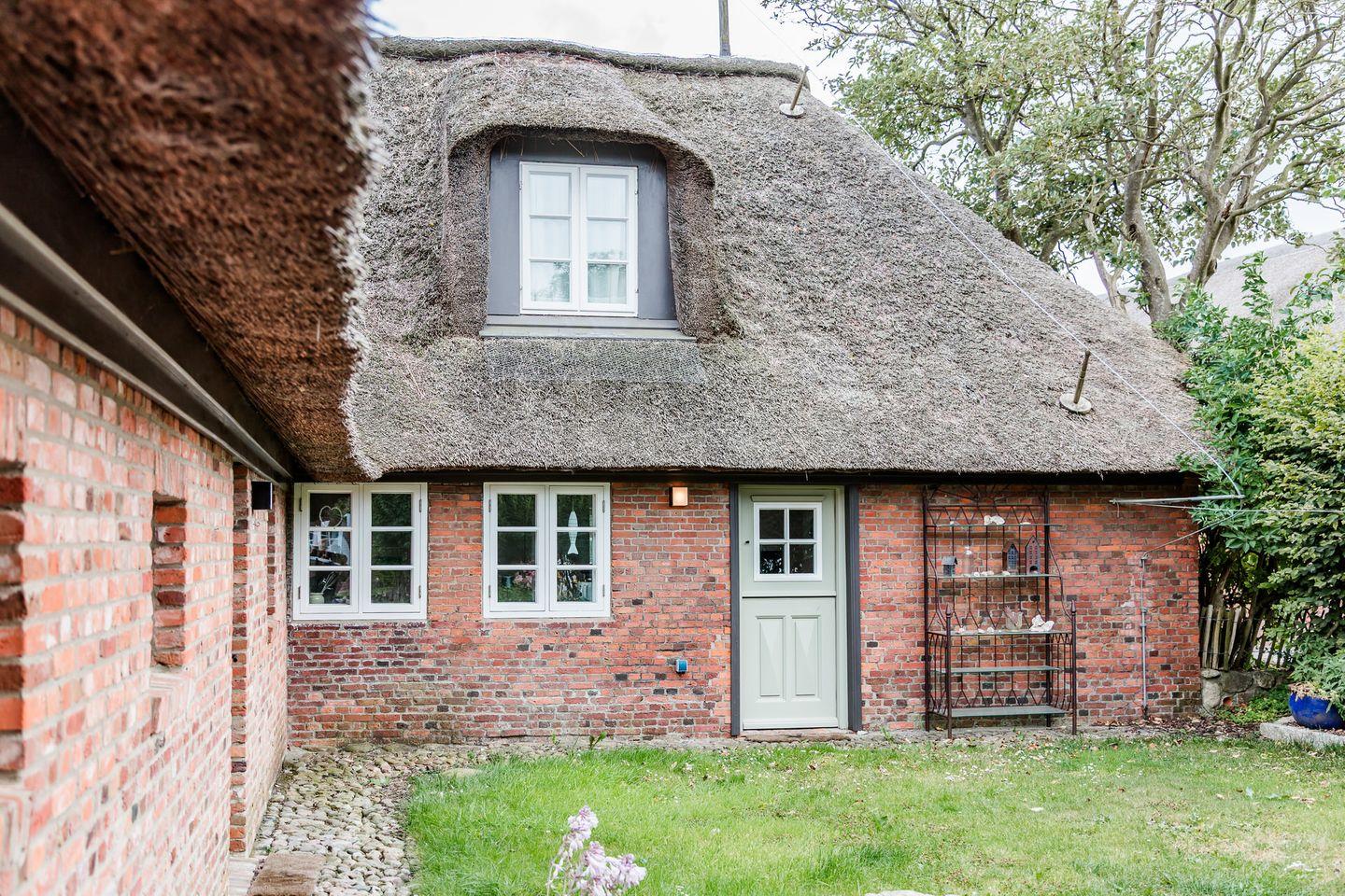 Reetgedeckter Ferienhausteil mit hauseigener Sauna und Garten mit Terrasse.