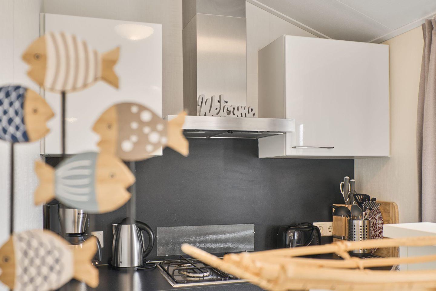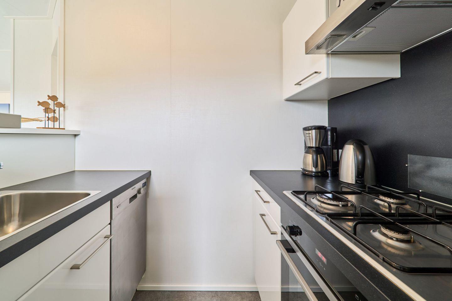 Im Inneren empfängt Sie das Ferienhaus mit einer modernen, offenen Küche, die in den Wohnbereich integriert ist. Diese ist vollständig ausgestattet mit Kaffeemaschine, Wasserkocher, Toaster, Backofen, Herd, Kühlschrank mit Gefrierfach, Geschirrspüler sowie sämtlichem Geschirr und Besteck. Ein Esstisch für gemeinsame Mahlzeiten rundet den Küchenbereich ab. Für Ihren Komfort sind Bettwäsche, Handtücher, Geschirrhandtücher und ein Staubsauger vor Ort vorhanden.