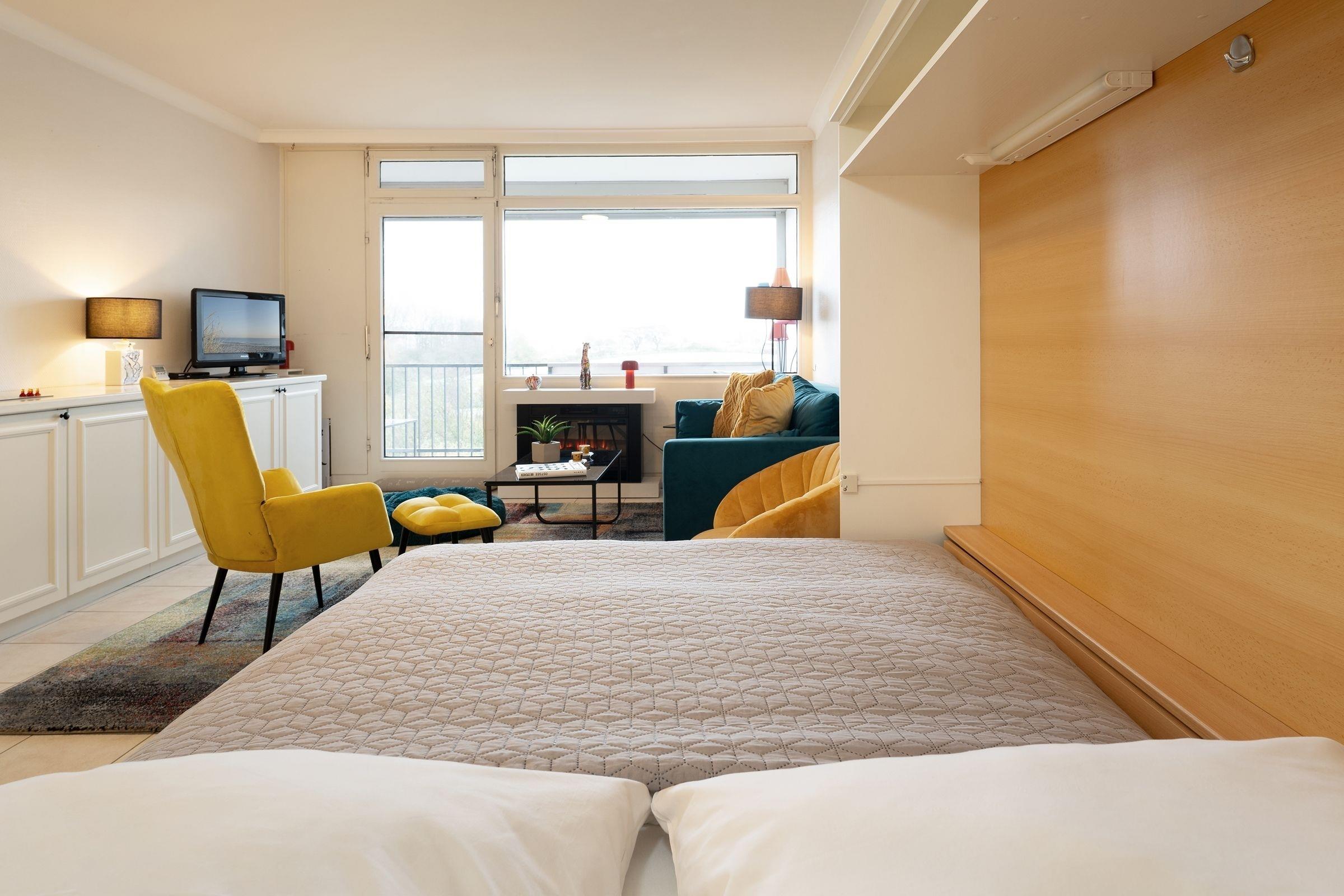 Wohnzimmer: Schrankdoppelbett (140x200 cm), Kleiderschrank, TV, Verdunkelung: Rollo, kein Platz für ein Babybett vorhanden