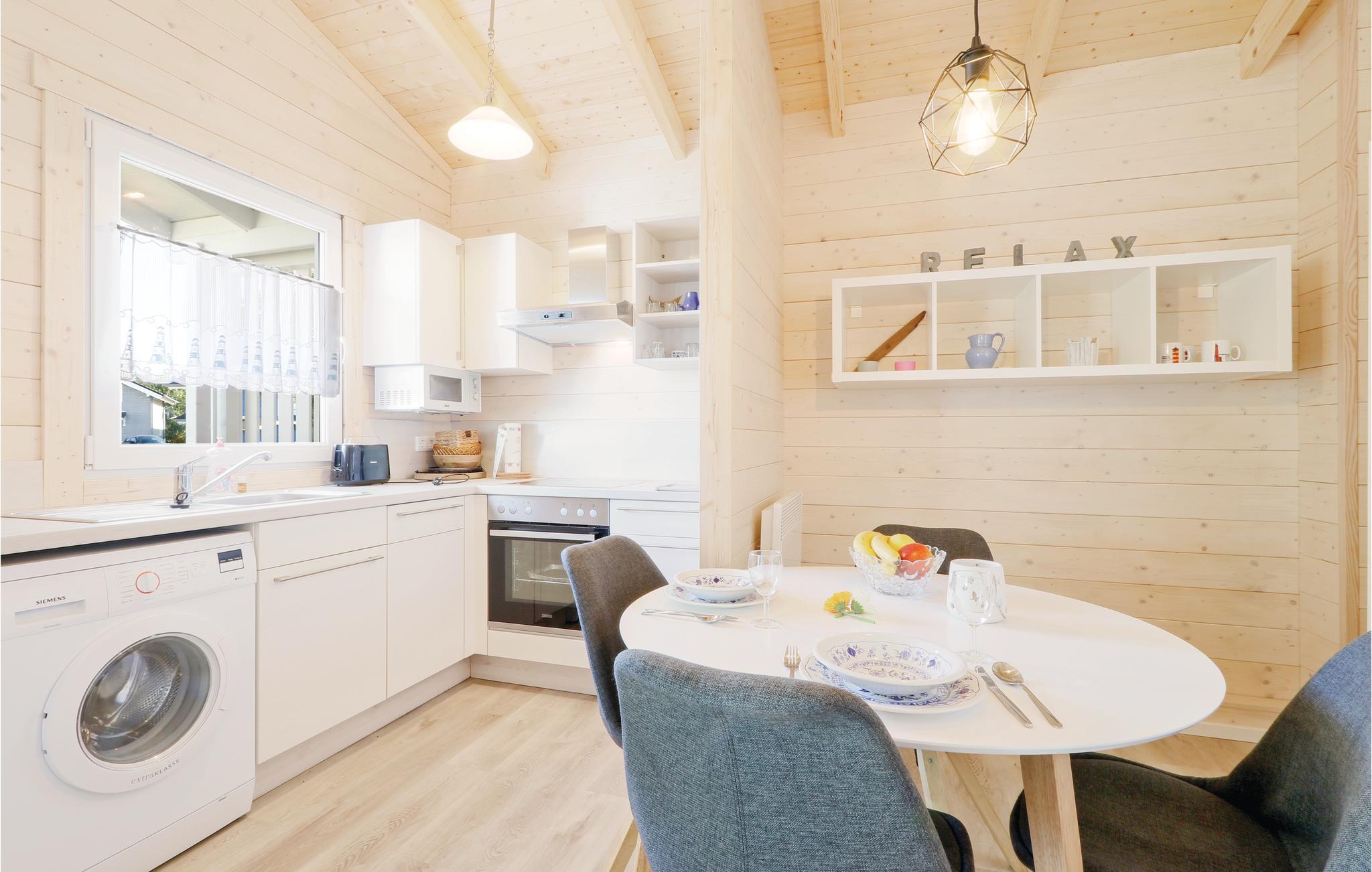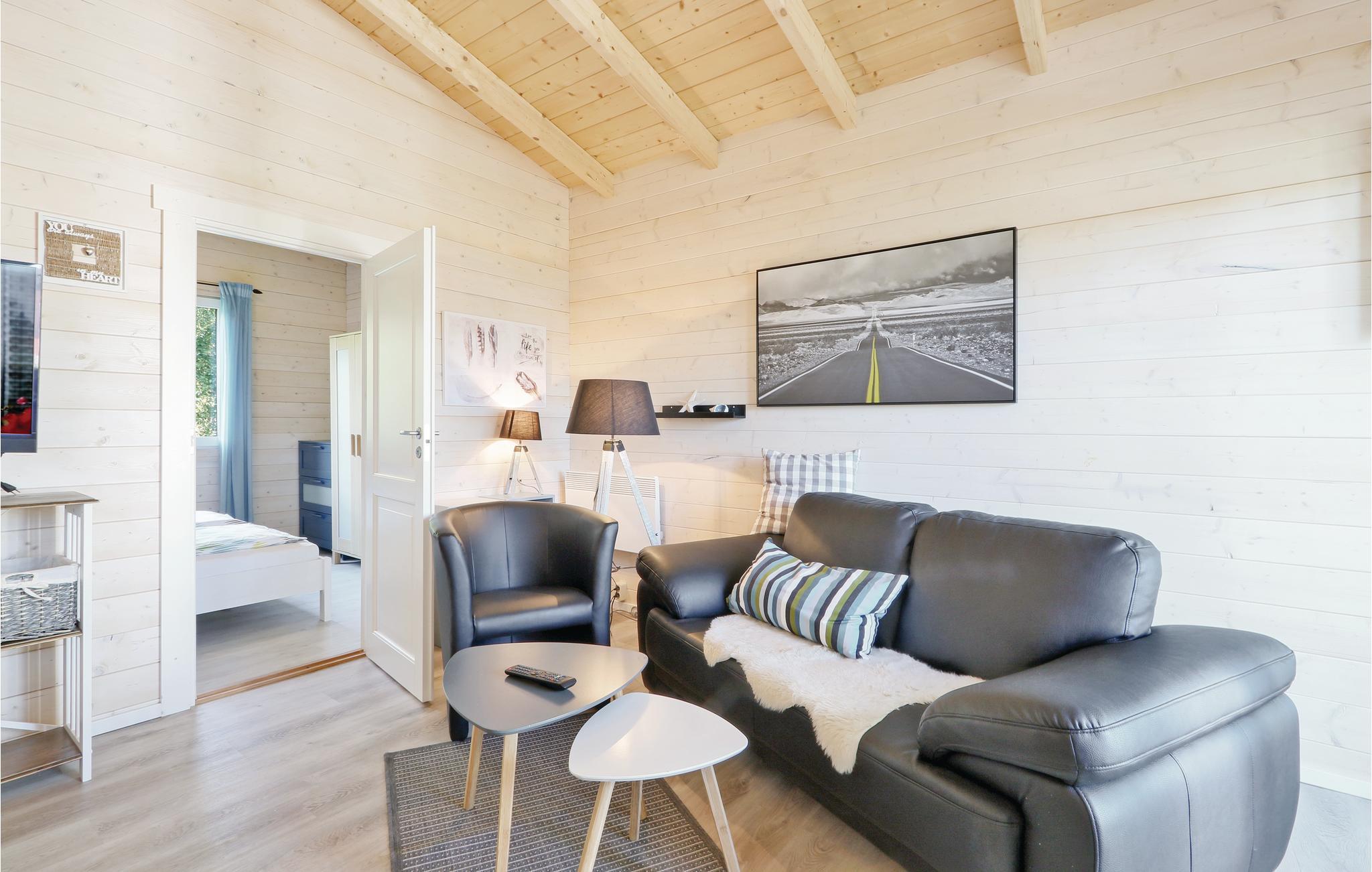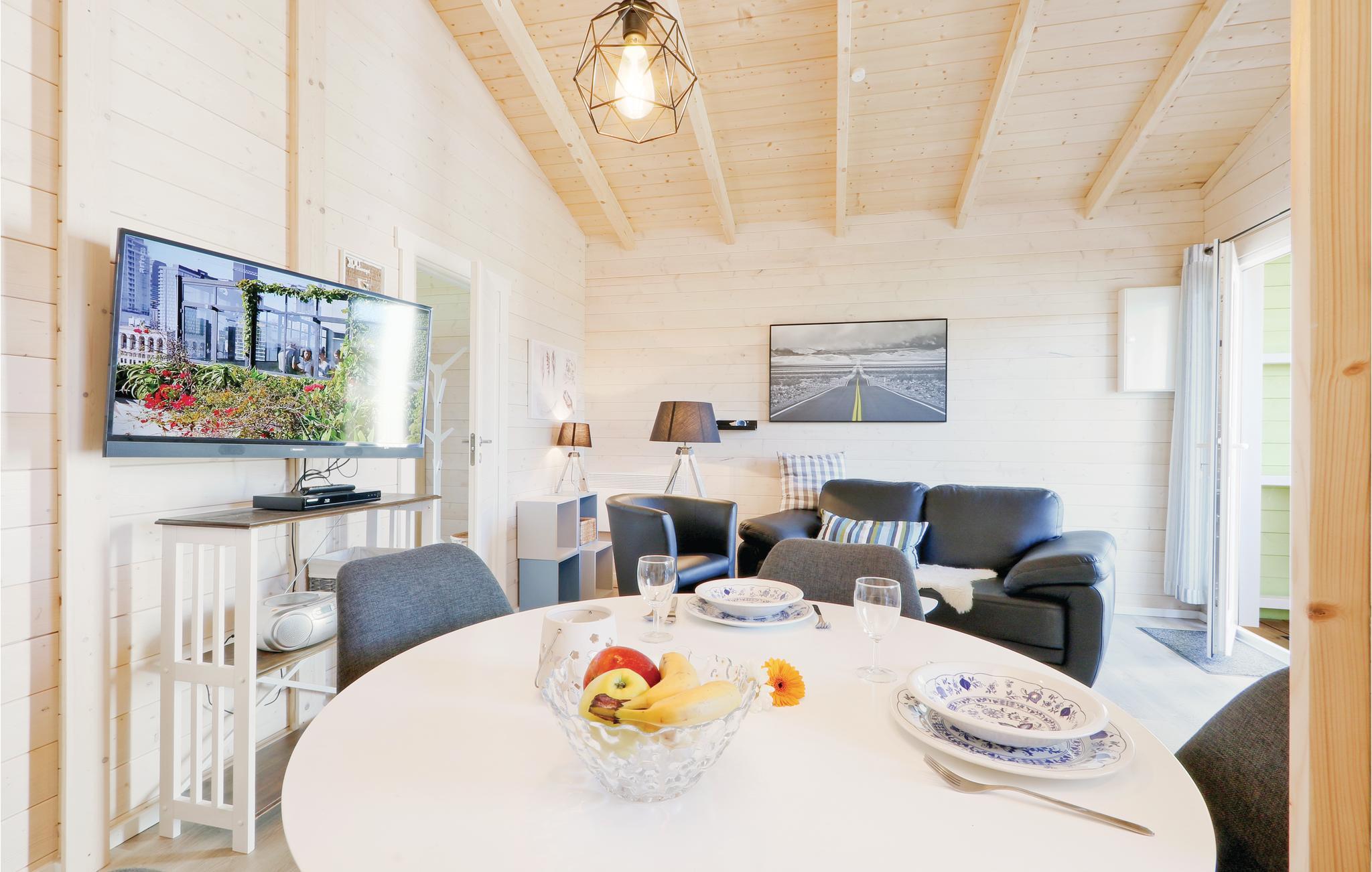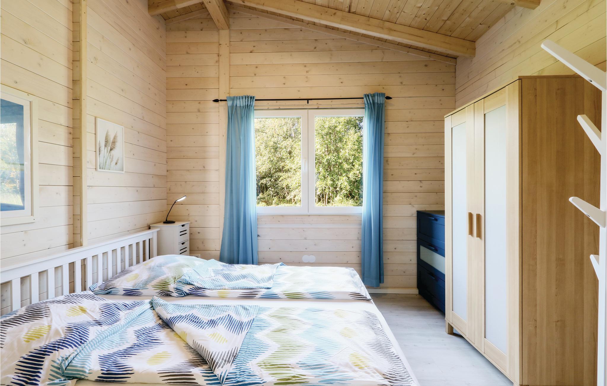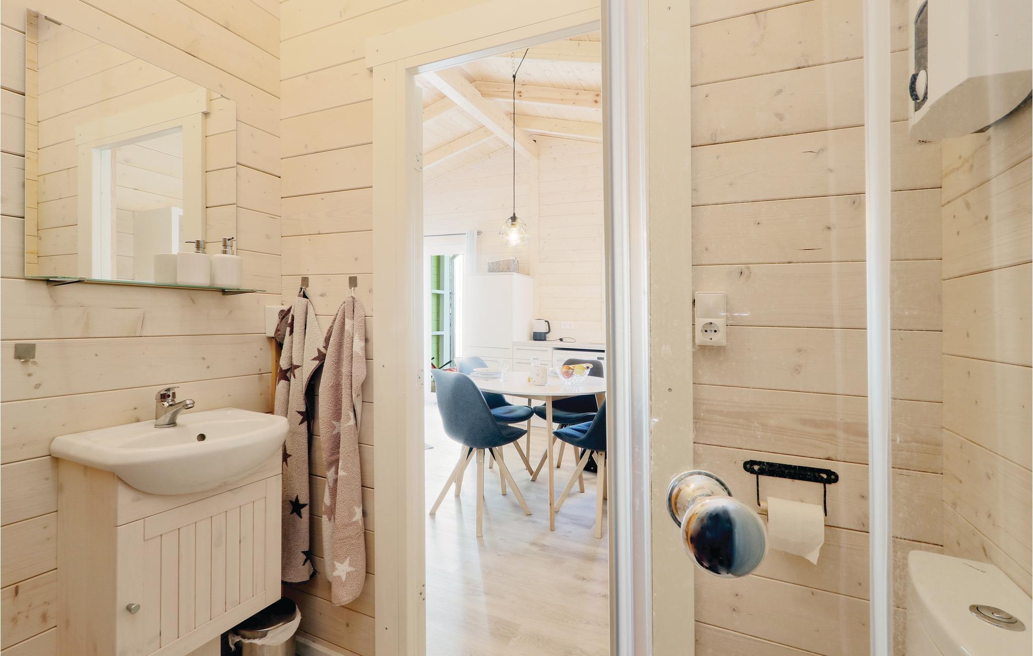 Træhuset er hyggeligt indrettet og råder et separat soveværelse med rummeligt dobbeltseng såvel som et badeværelse med separat douche. I spise - og soveområdet er det lille køkken, som er komplet udstyret og byder på al den komfort I har brug for. Den åbne terrasse foran huset inviterer til fælles måltider, der står en grill til jeres rådighed. Her lan I slappe af og nyde tiden med familien.
