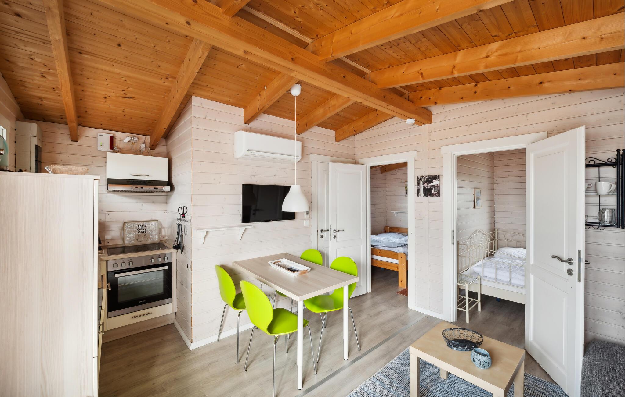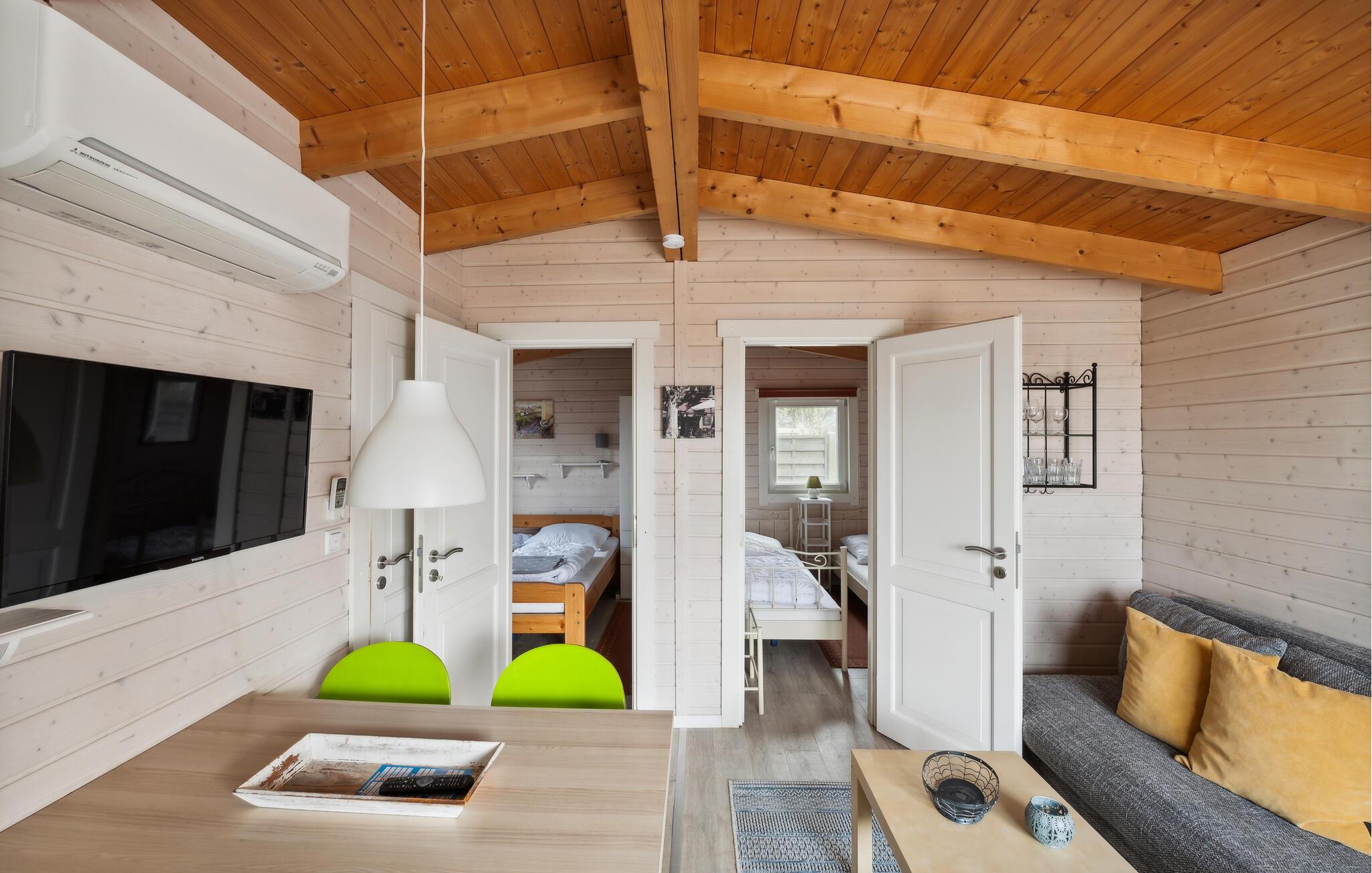 I huset er der to soveværelser, et lille badeværelse med moderne brusebad, en hyggelig stue med køkkenhjørne. Der er endda blevet plads til en opvaskemaskine, så I kan bruge ferien på at slappe af. Klimanlægget sørger for behagelige temperaturer selv på de varmeste sommerdage, allergikere vil være glade for anlæggets pollenfilter. Bemærk at der er adgang til huset via to trin.