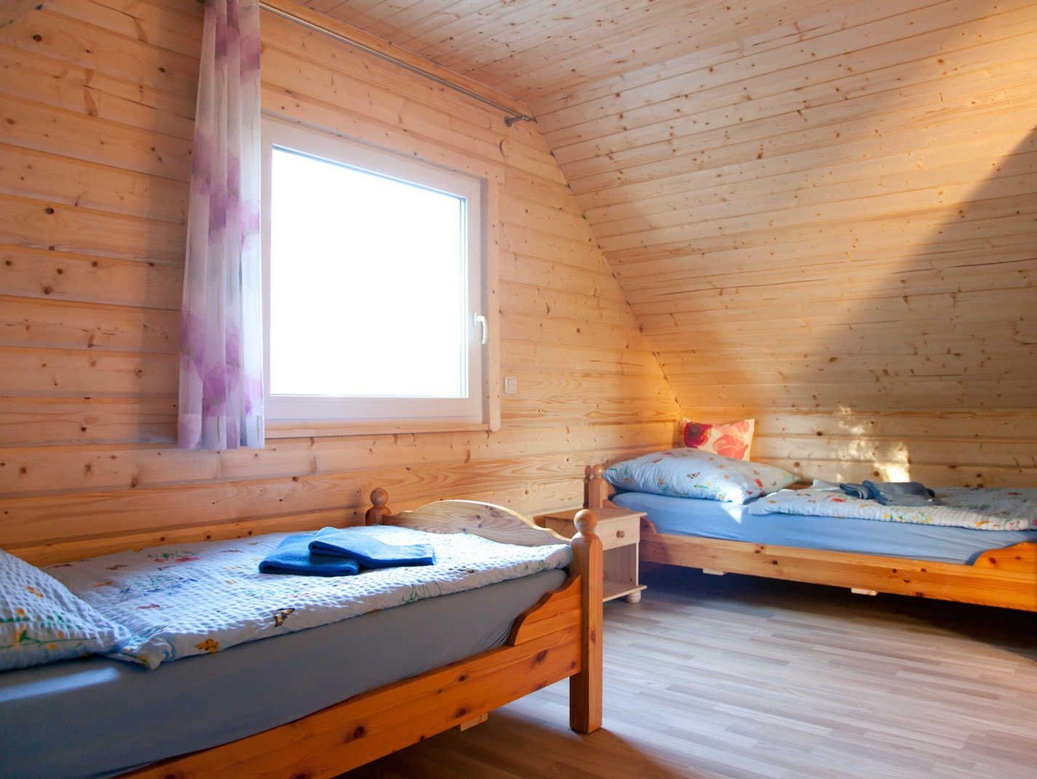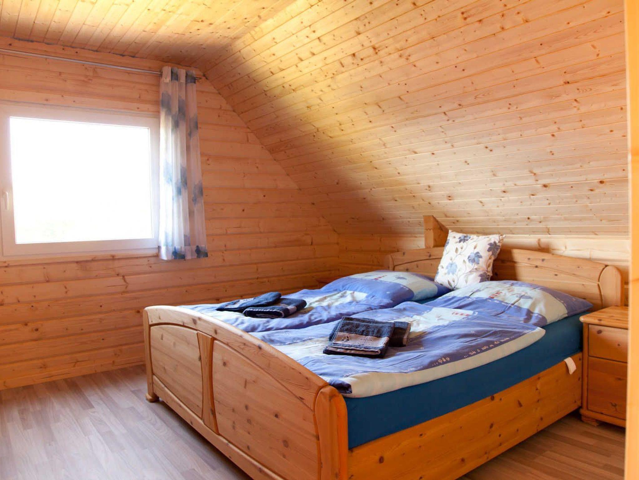 Das große Schlafzimmer im Obergeschoß ist mit einem Doppelbett ausgestattet und hat zudem ein echtes Kinderholzbett. Wenn Sie ausgeschlafen haben, können Sie den Morgen mit einem Blick über das Grundstück bis hin zum Saaler Bodden beginnen. Die obere Etage hat ein kleines eigenes WC.