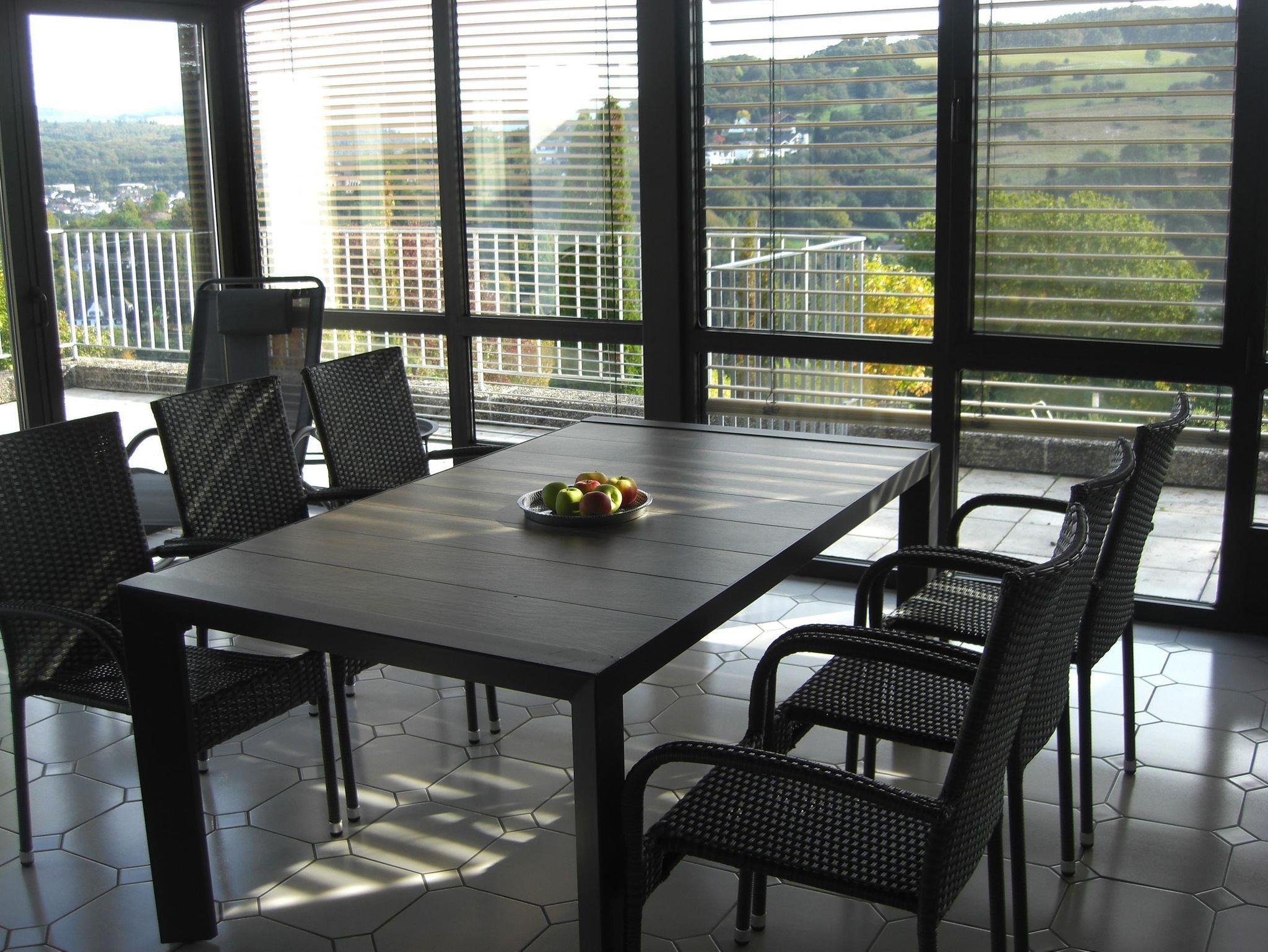 Großes Wohn-/Esszimmer, helle und geräumige Küche, 2 Badezimmer mit ebenerdiger Dusche, 1 x Zweibettzimmer am Wintergarten, 1 x Doppelzimmer mit Weinbergblick, 1 x Doppelzimmer mit eigenem Bad und Terrasse.