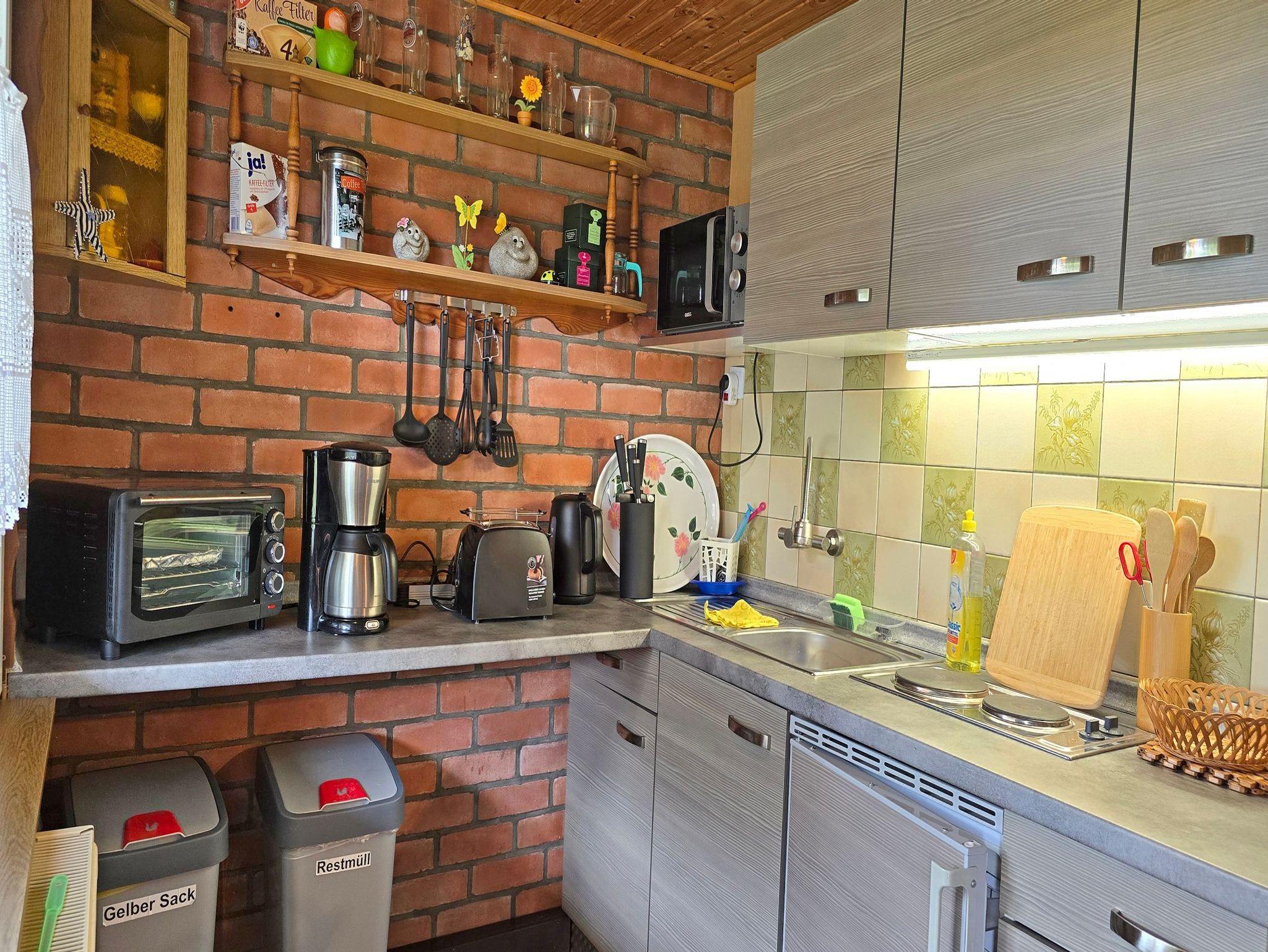 ? Die Küche ist offen zum Wohnbereich und bietet einen 2-Plattenherd, Mini-Backofen, Mikrowelle, Kühlschrank mit Tiefkühlfach, Toaster, Kaffeemaschine und Wasserkocher.