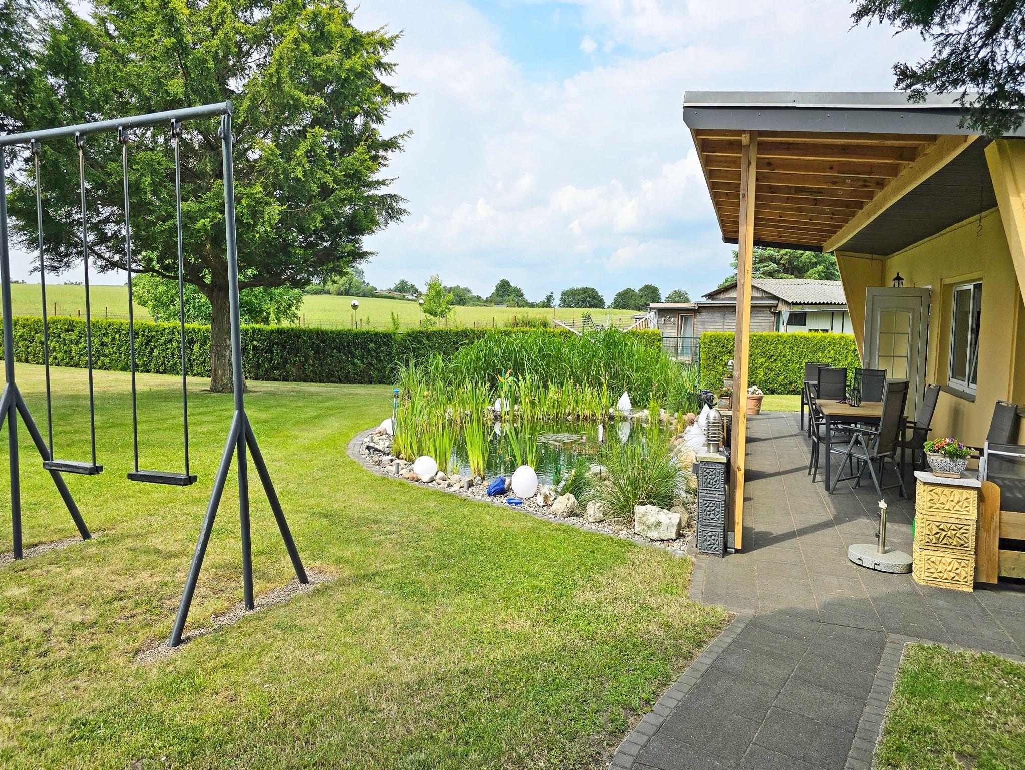 ? Der großzügige Garten mit Doppelschaukel und ein Teich mit Goldfischen lädt zum verweilen ein. Weiterhin im Garten nutzbar ist eine Wäschespinne, ein Federballspiel und eine Unterstellmöglichkeit für Fahrräder.