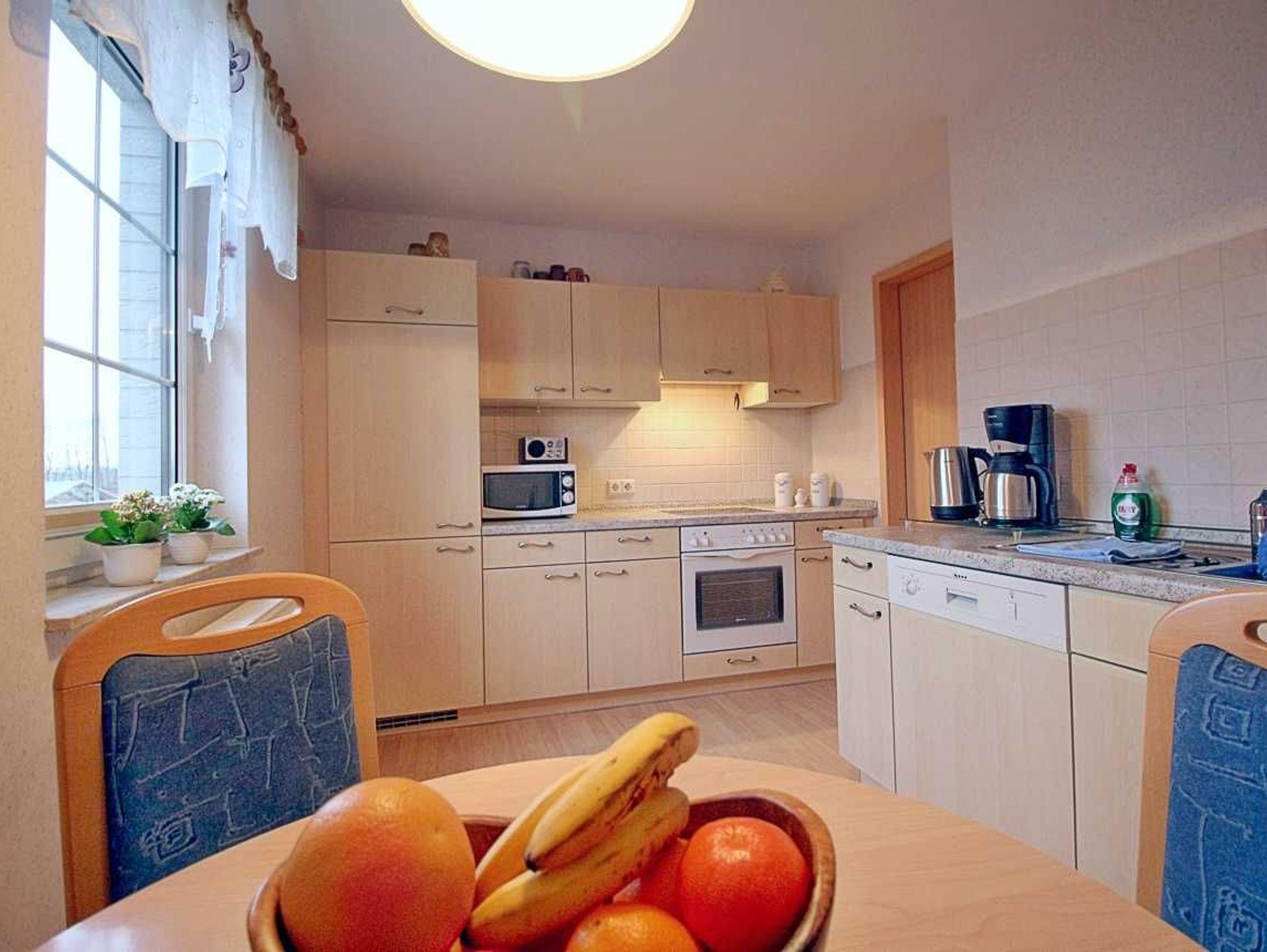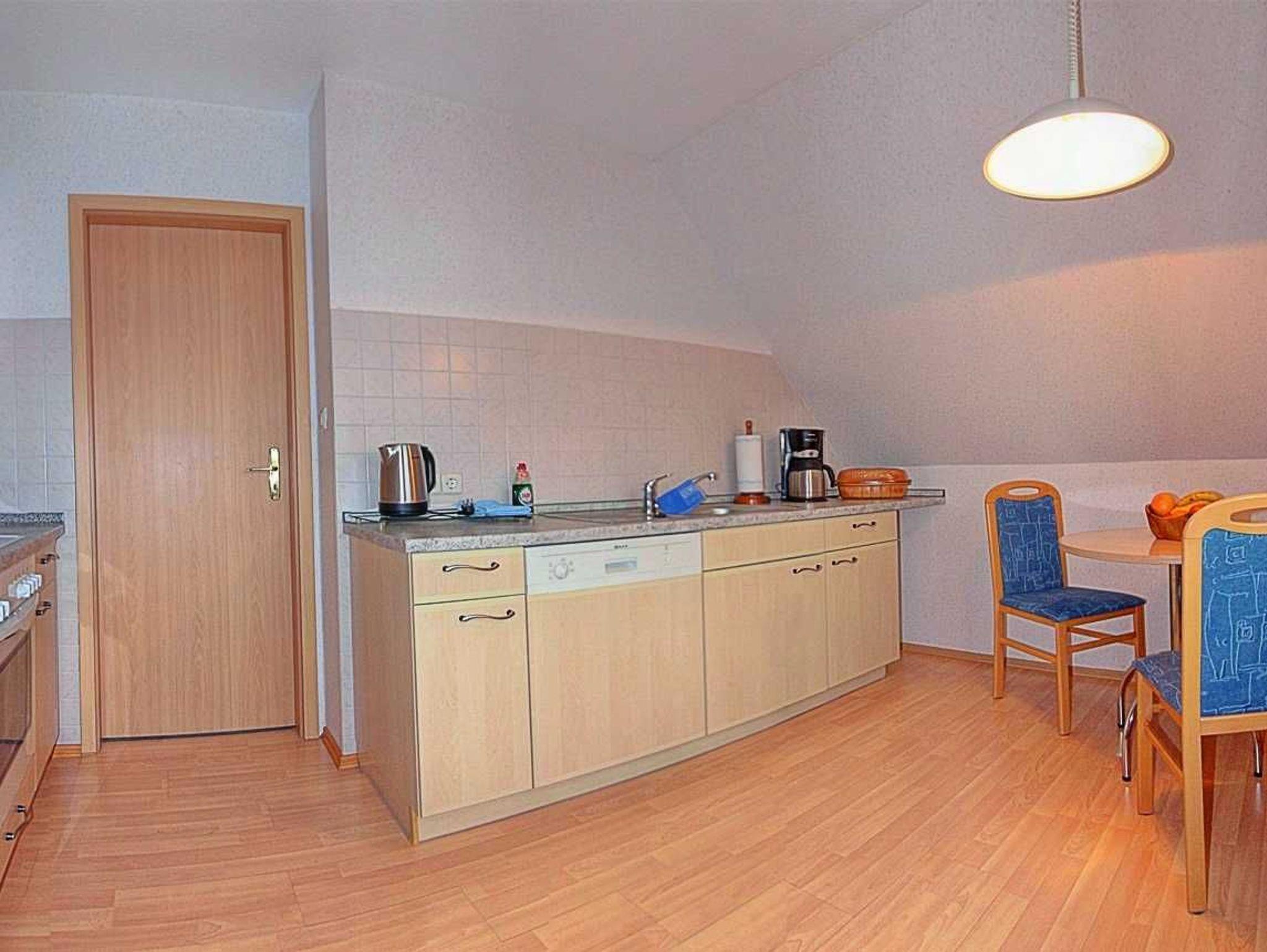 - Küche: Separat und ausgestattet mit Mikrowelle, Kaffeemaschine, Toaster, Wasserkocher, Geschirrspüler, Backofen mit Ceran-Herd, einer Essecke und allen nötigen Küchenutensilien.