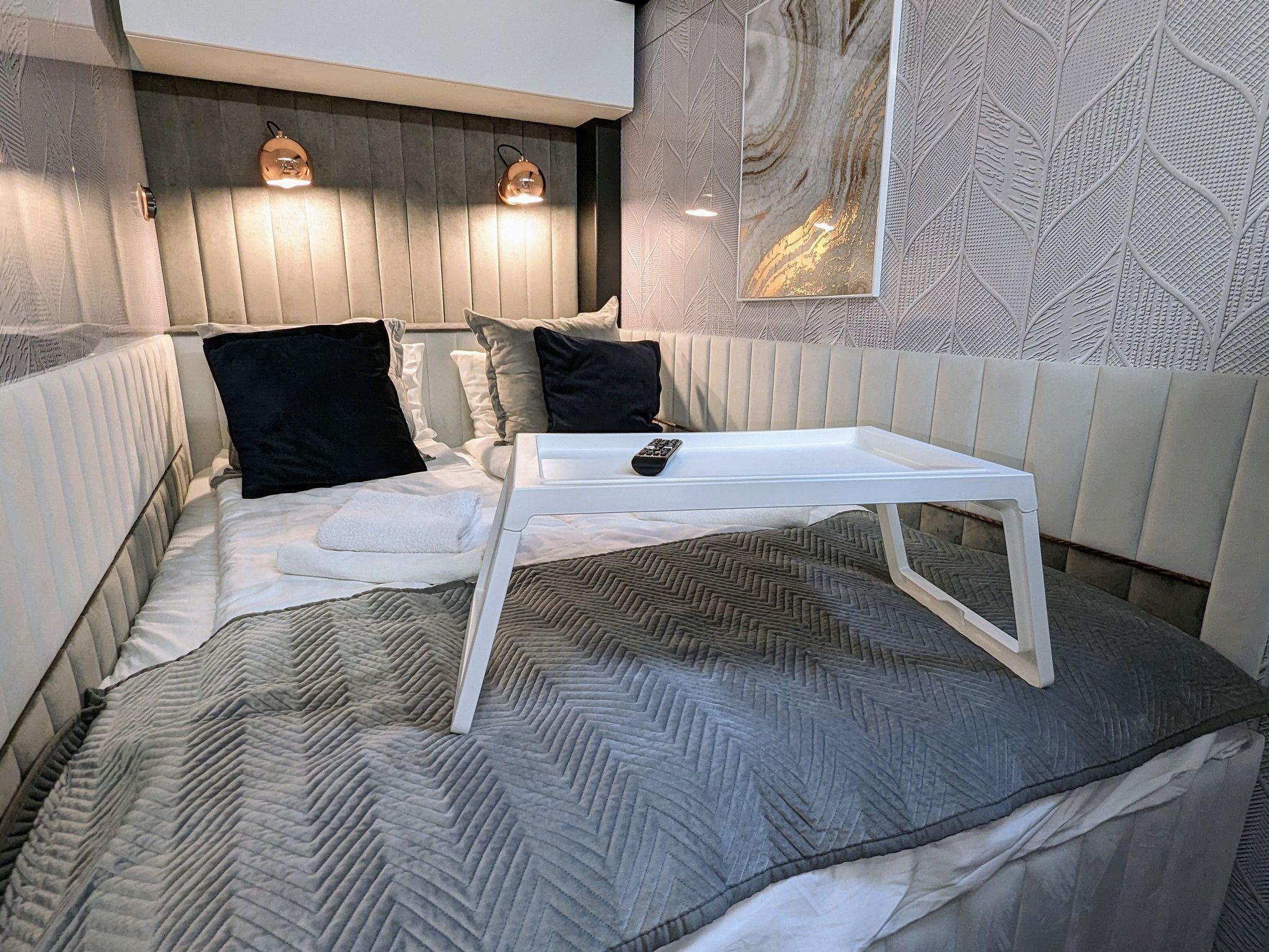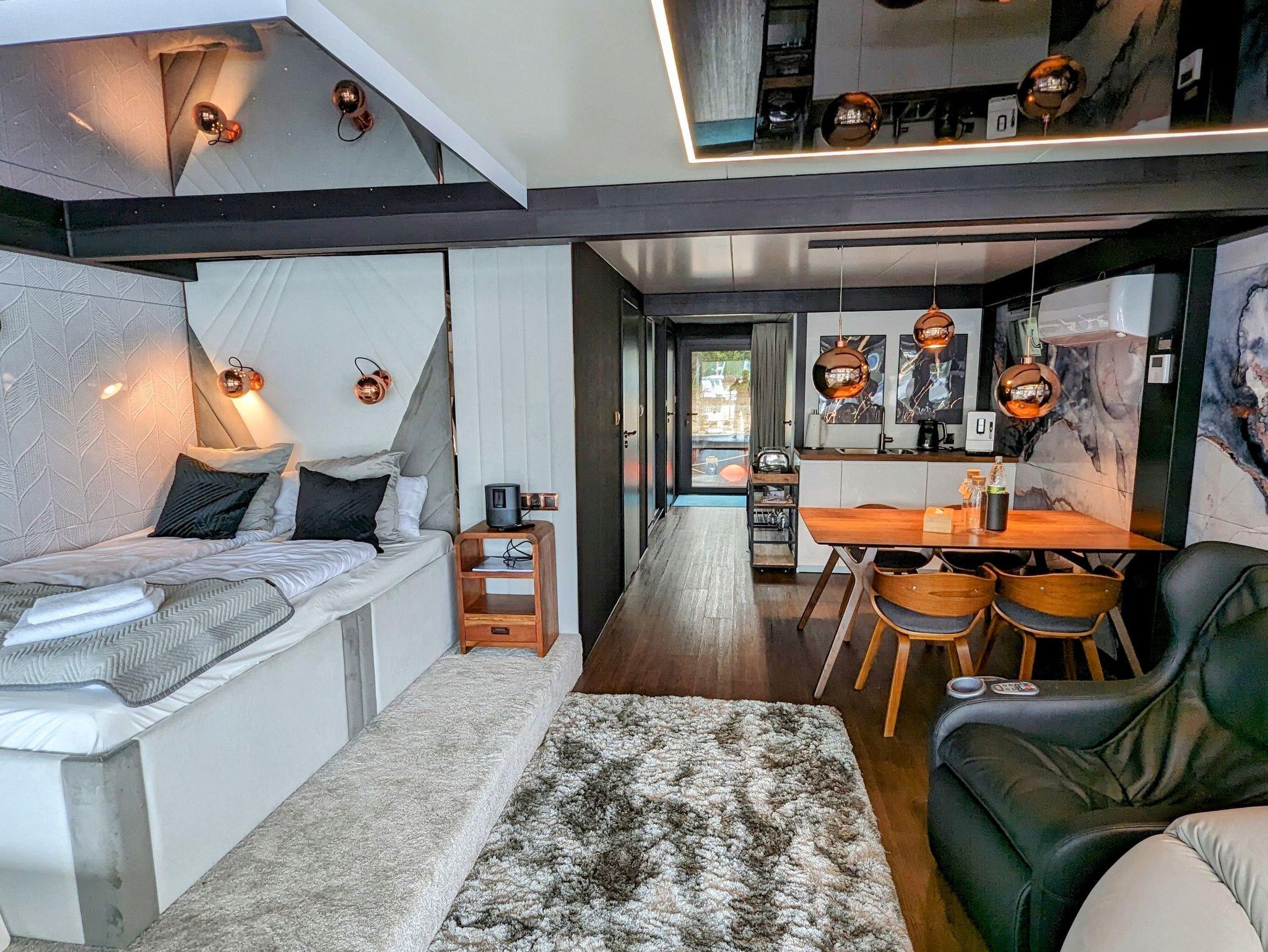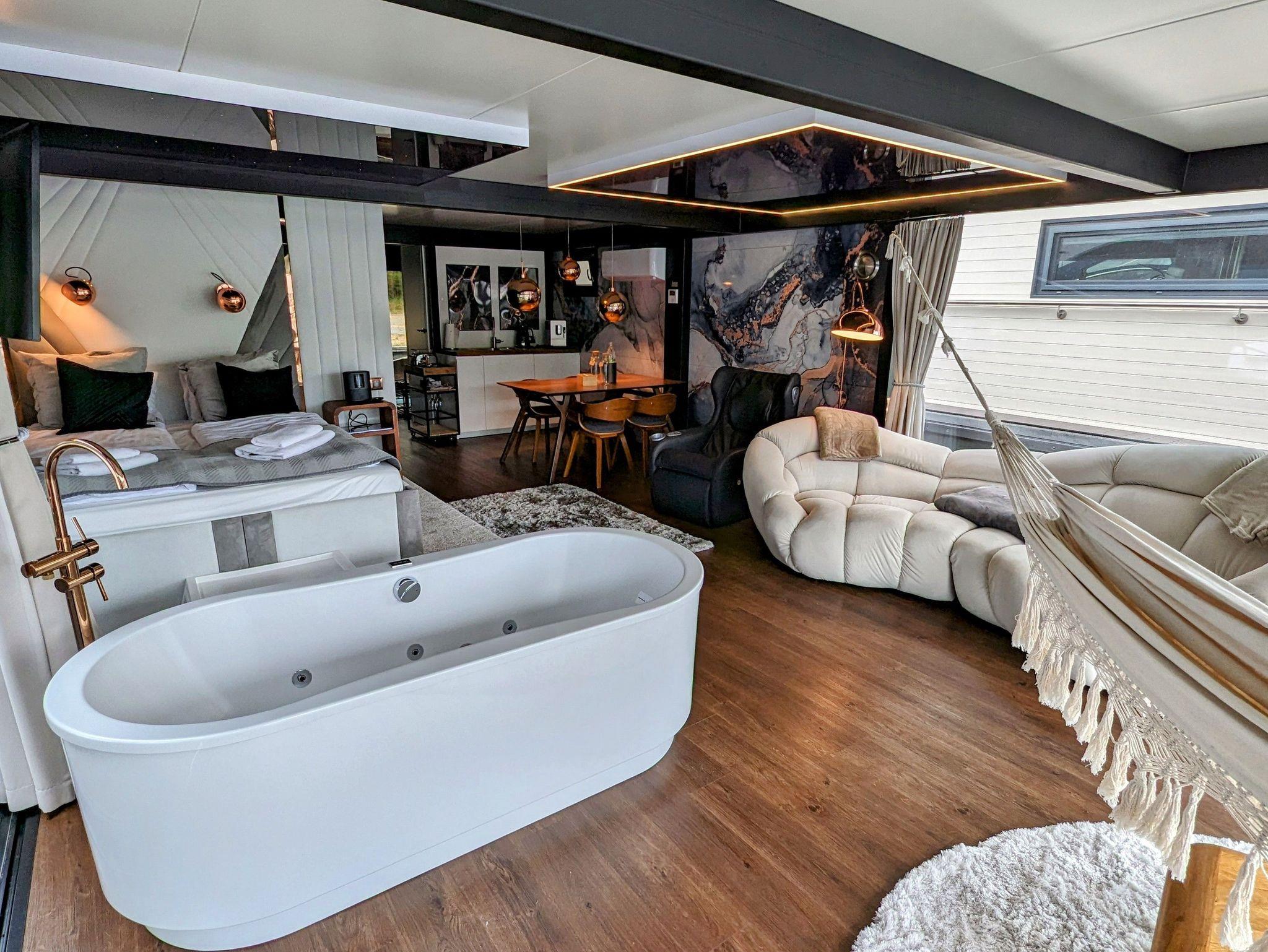 Der offene große Wohn-/Schlafbereich mit Essecke bestimmt den Auftritt des schwimmenden Apartments. Ein klassicher Kamin, eine Whirlwanne vor dem Doppelbett (140 x 200 cm), ein elektrischer Massagesessel und eine kleine Trockensauna bieten die Möglichkeit für ganz persönliche Wellnesszeiten. Eine Essecke mit kleiner Küchenzeile mit Kühlschrank, Spüle, BEKO-Kaffeemaschine, Wasserkocher und Toaster, sowie Eiswürfelmaschine gehören zur Ausstattung um eine Eigenversorgung zu ermöglichen. Frühstück (auch zur Abholung an Bord) und kleine Gerichte können im Hafenbistro gleich um die Ecke genossen werden. Im Wohnbereich gibt es eine Hängematte und 2 Yogamatten. Ferner sorgen eine Klimaanlage mit Heizfunktion im Wohnbereich und das große Panoramafenster mit atemberaubenden Blick auf den Hafen und Boote für Entspannung pur. Eine 2. kleine Kajüte mit Doppelbett (140 x 200) runden den Wohnbereich ab. W-LAN, 2 Smart-TV und eine Bose-Homesound 500-Anlage gehören zur Entertainmentausstattung. 2 Bäder mit großen Duschbereichen, Waschbecken und WC stehen im Sanitärbereich zur Verfügung. Im Eingangsbereich auf einer kleinen Terrasse befindet sich eine kleine Sitzecke. Darüber hinaus befindet sich auf dem Dach der Hausboot-Suite noch eine zusätzliche Sitzgruppe mit Blick auf den Jasmunder Bodden.