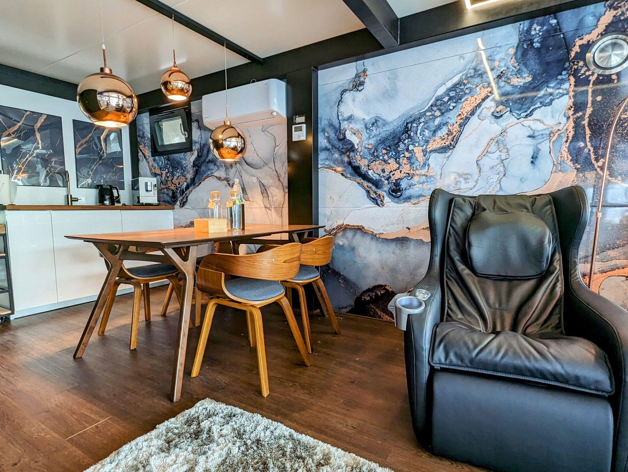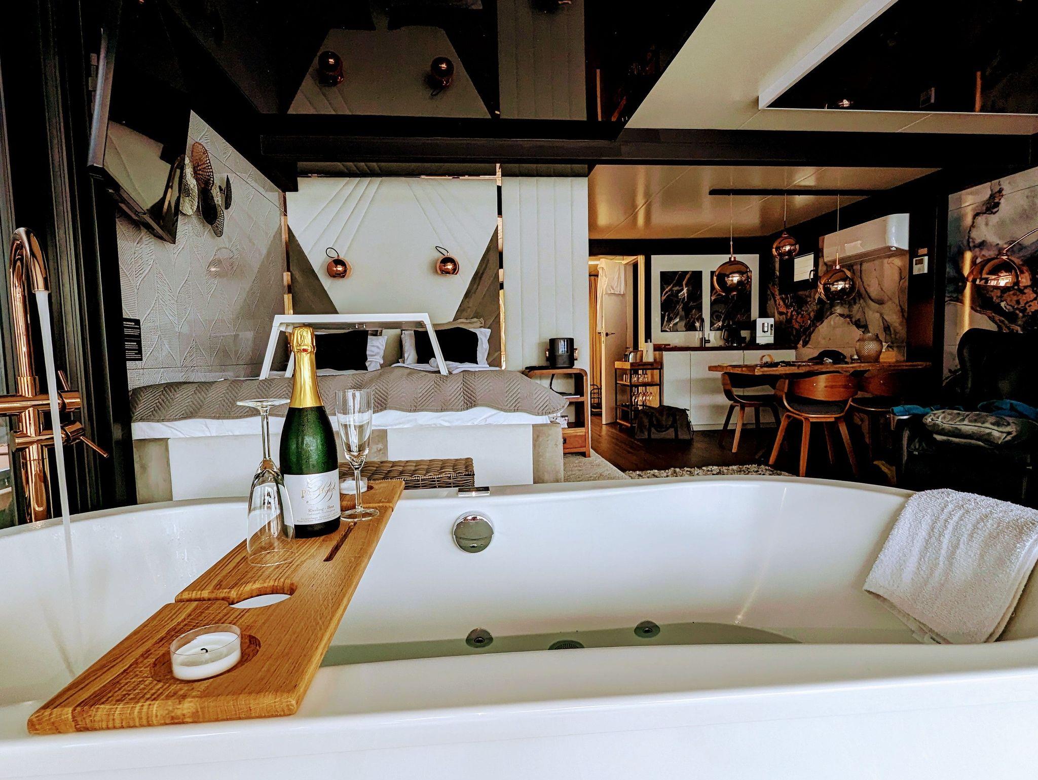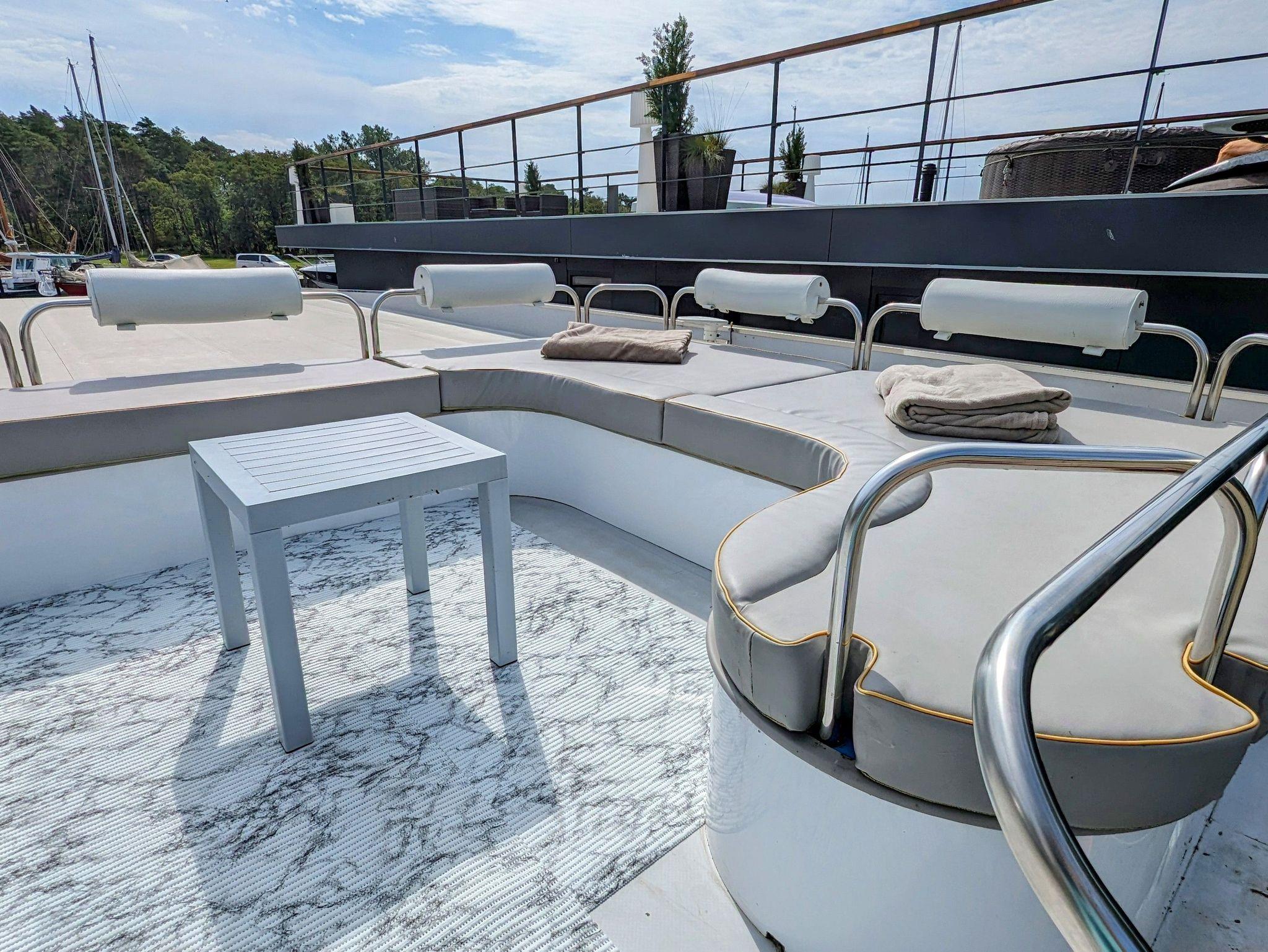 Der offene große Wohn-/Schlafbereich mit Essecke bestimmt den Auftritt des schwimmenden Apartments. Ein klassicher Kamin, eine Whirlwanne vor dem Doppelbett (140 x 200 cm), ein elektrischer Massagesessel und eine kleine Trockensauna bieten die Möglichkeit für ganz persönliche Wellnesszeiten. Eine Essecke mit kleiner Küchenzeile mit Kühlschrank, Spüle, BEKO-Kaffeemaschine, Wasserkocher und Toaster, sowie Eiswürfelmaschine gehören zur Ausstattung um eine Eigenversorgung zu ermöglichen. Frühstück (auch zur Abholung an Bord) und kleine Gerichte können im Hafenbistro gleich um die Ecke genossen werden. Im Wohnbereich gibt es eine Hängematte und 2 Yogamatten. Ferner sorgen eine Klimaanlage mit Heizfunktion im Wohnbereich und das große Panoramafenster mit atemberaubenden Blick auf den Hafen und Boote für Entspannung pur. Eine 2. kleine Kajüte mit Doppelbett (140 x 200) runden den Wohnbereich ab. W-LAN, 2 Smart-TV und eine Bose-Homesound 500-Anlage gehören zur Entertainmentausstattung. 2 Bäder mit großen Duschbereichen, Waschbecken und WC stehen im Sanitärbereich zur Verfügung. Im Eingangsbereich auf einer kleinen Terrasse befindet sich eine kleine Sitzecke. Darüber hinaus befindet sich auf dem Dach der Hausboot-Suite noch eine zusätzliche Sitzgruppe mit Blick auf den Jasmunder Bodden.