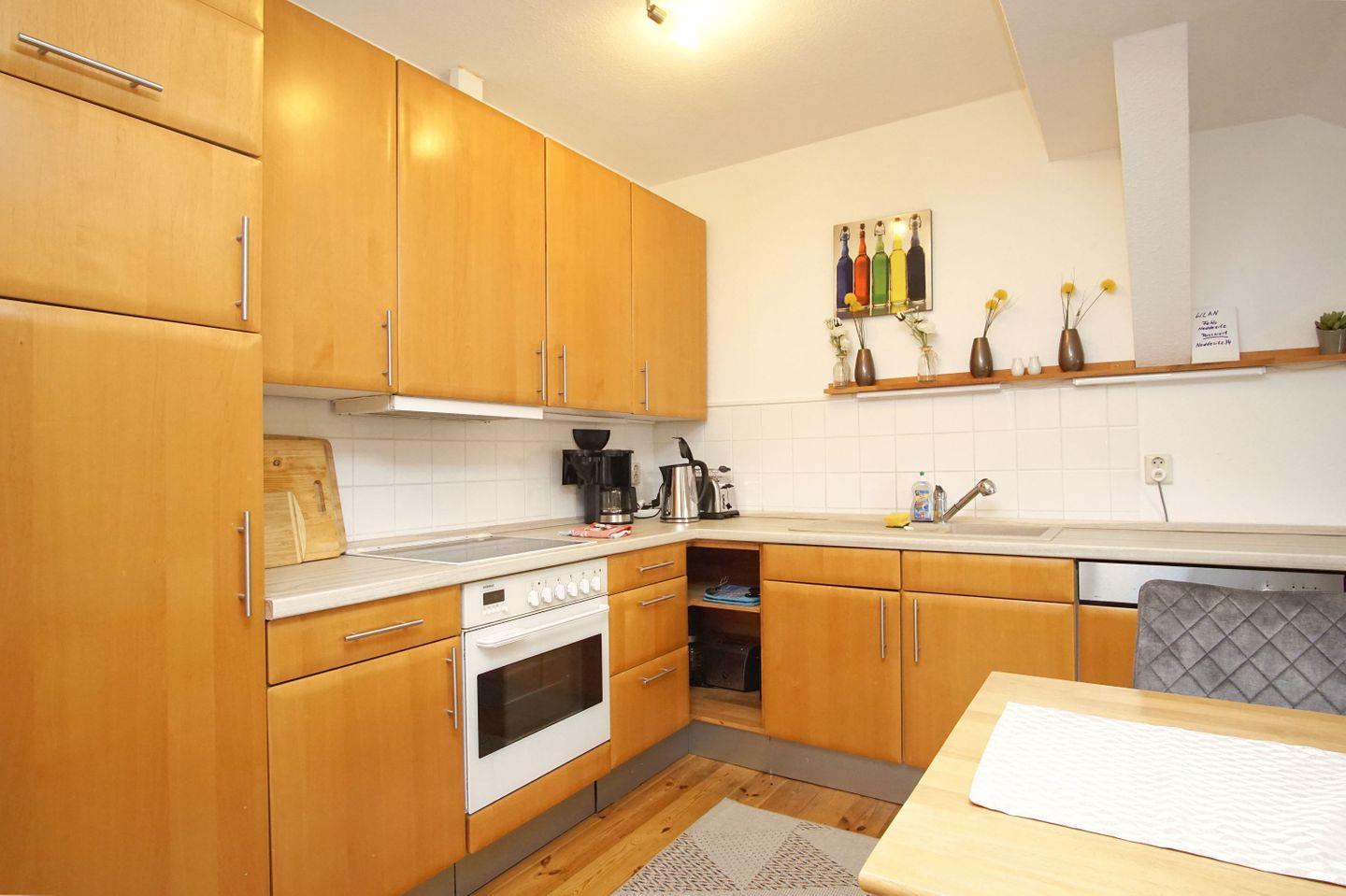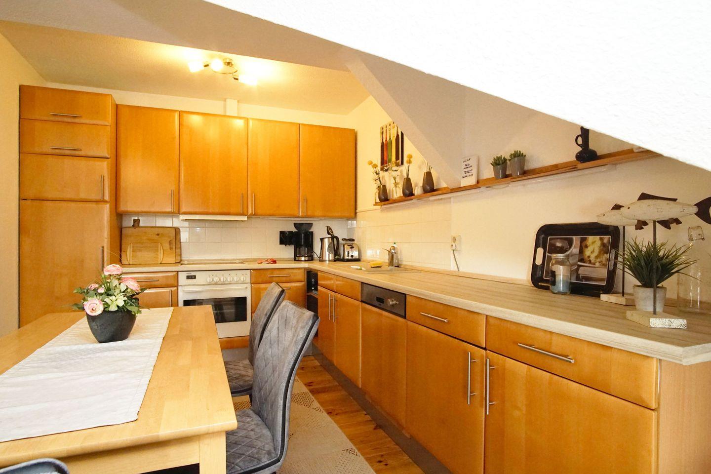 KÜCHE // offene Küche mit Cerankochfeld (4-Platten), Kühlschrank, Backofen, Mikrowelle, Toaster, Wasserkocher, Kaffeemaschine, Spülmaschine, reichlich Besteck, Geschirr und Küchenutensilien ++