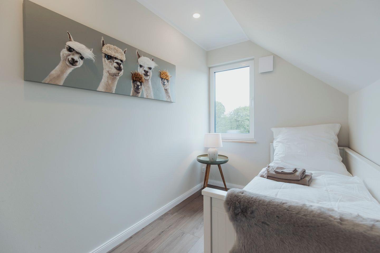 Ausschlafen, kochen, faulenzen: Im geräumigen Familienhaus kommt jeder zu seinem Recht. Die ca. 120 m2 Wohnfläche verteilen sich optimal auf die beiden Etagen. Im Obergeschoss gibt es vier Zimmer, sowie ein Vollbad, das über ein Dachfenster Tageslichtbeleuchtung hat. Die Schlafzimmer mit hochwertigen Boxspringbetten (in den Größen 1,60 x 2,10 Meter, sowie 1,80 x 2,10 Meter) von bester Qualität, laden zum Ausschlafen ein. In den maßgefertigten Einbauschränken finden Sie genügend Stauraum für alle.