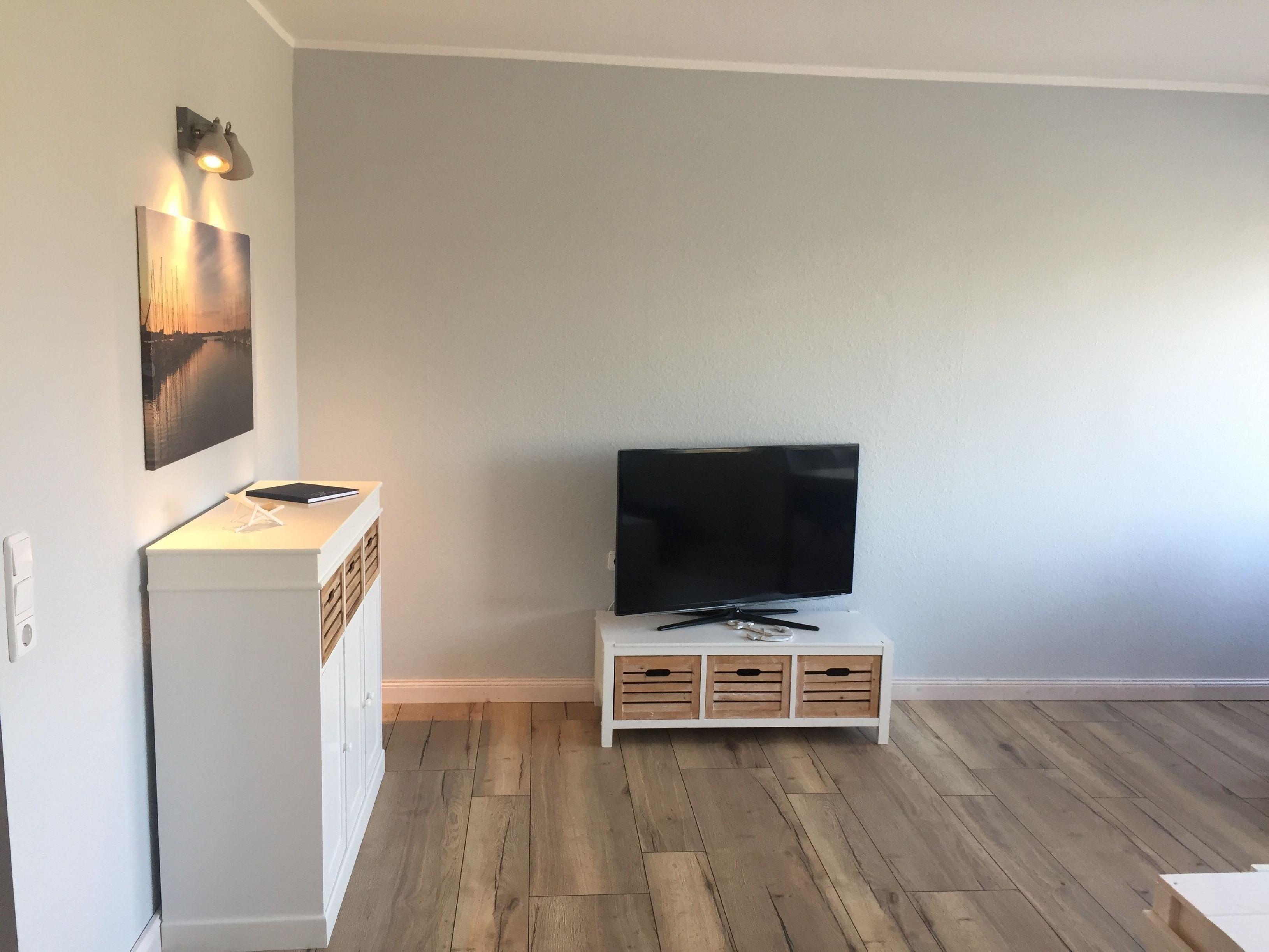 Das Wohnzimmer lädt zum entspannen ein mit direktem Blick vom Esstisch auf das Treiben im Hafen. Außerdem könnt ihr es euch auf dem gemütlichen Sofa vor dem 46 Zoll TV bequem machen.