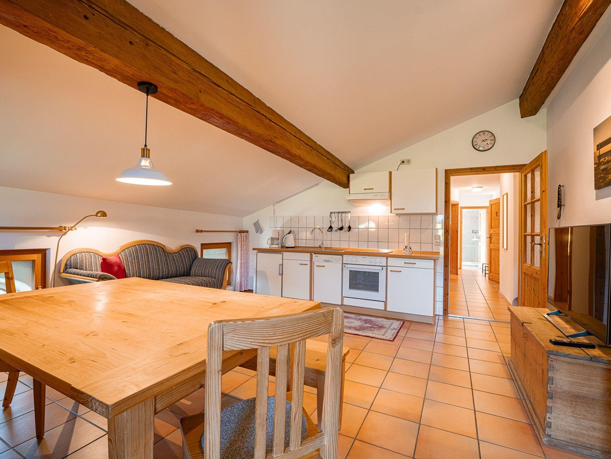 Die Mansardenwohnung im 2. OG unseres Hofes erreichen Sie über einen eigenen Eingang. Sie besteht aus einem stilvoll eingerichteten Wohnraum mit Küchenzeile und großen Esstisch. Die Wohnung beinhaltet außerdem ein geräumiges Bad und 2 separate Schlafzimmer. Ein Schlafzimmer mit Doppelbett und ein Schlafzimmer mit Stockbett. Eine Besonderheit unserer Galeriewohnung ist der gemütliche Südbalkon mit herrlichen Ausblick auf unser heimisches Bergpanorama.