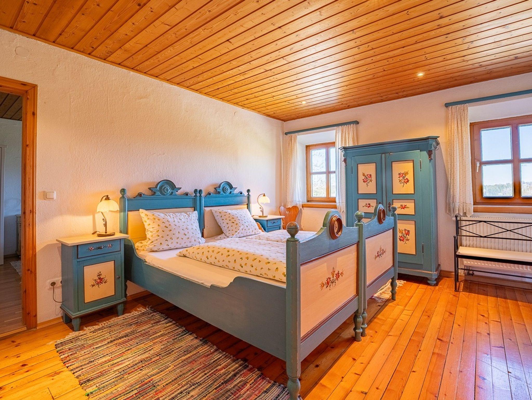 Die Hofwohnung im 1. OG unseres Hofes erreichen Sie über einen eigenen Eingang. Sie besteht aus einer gemütlichen, authentisch bayerischen Wohnstube mit großem Esstisch für gesellige Runden und einem großen Sofa. Die Wohnung beinhaltet außerdem ein modernes Bad und 2 separate Schlafzimmer. Die beiden Schlafzimmer haben jeweils ein Doppelbett und sind mit traditionellen Bauernmöbeln ausgestattet.