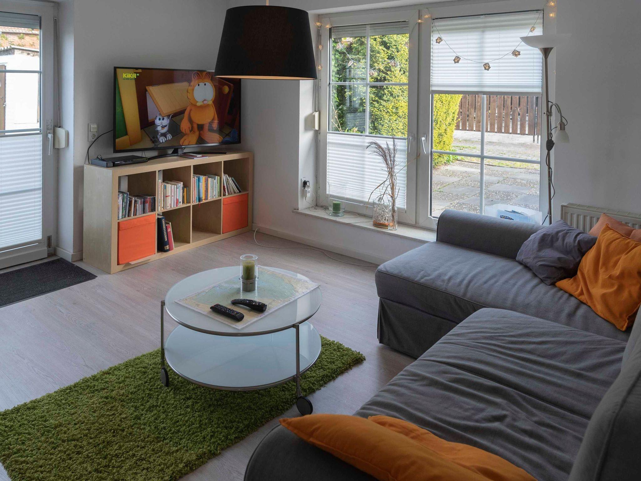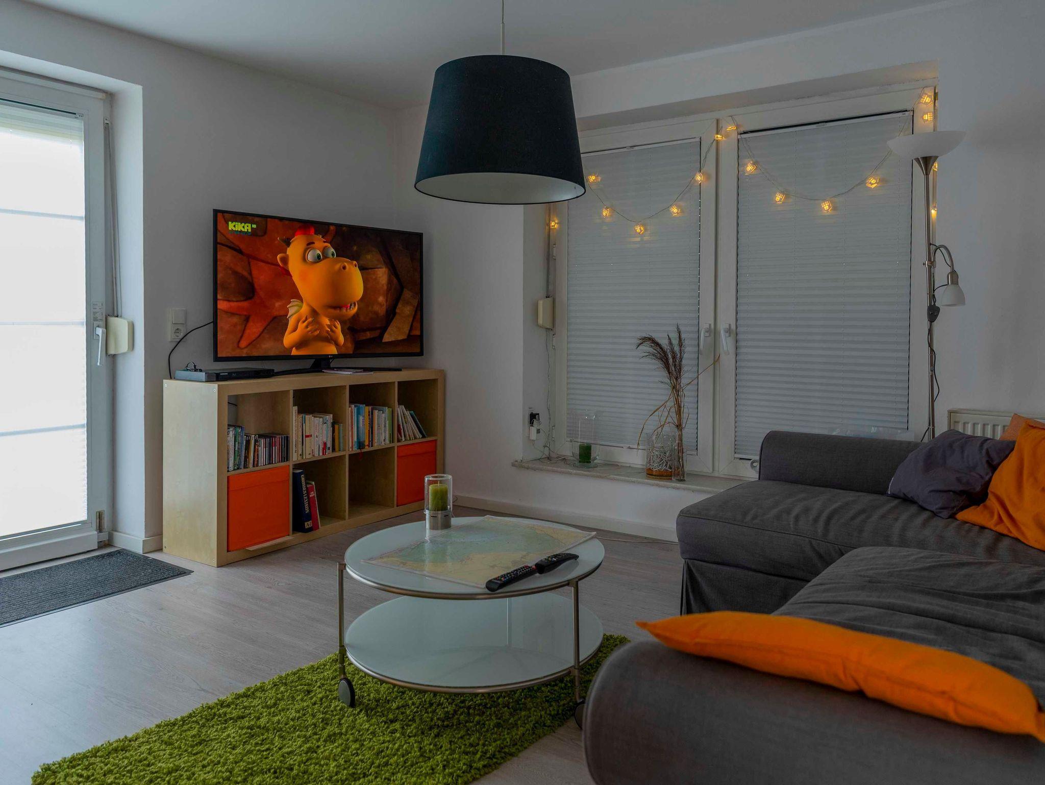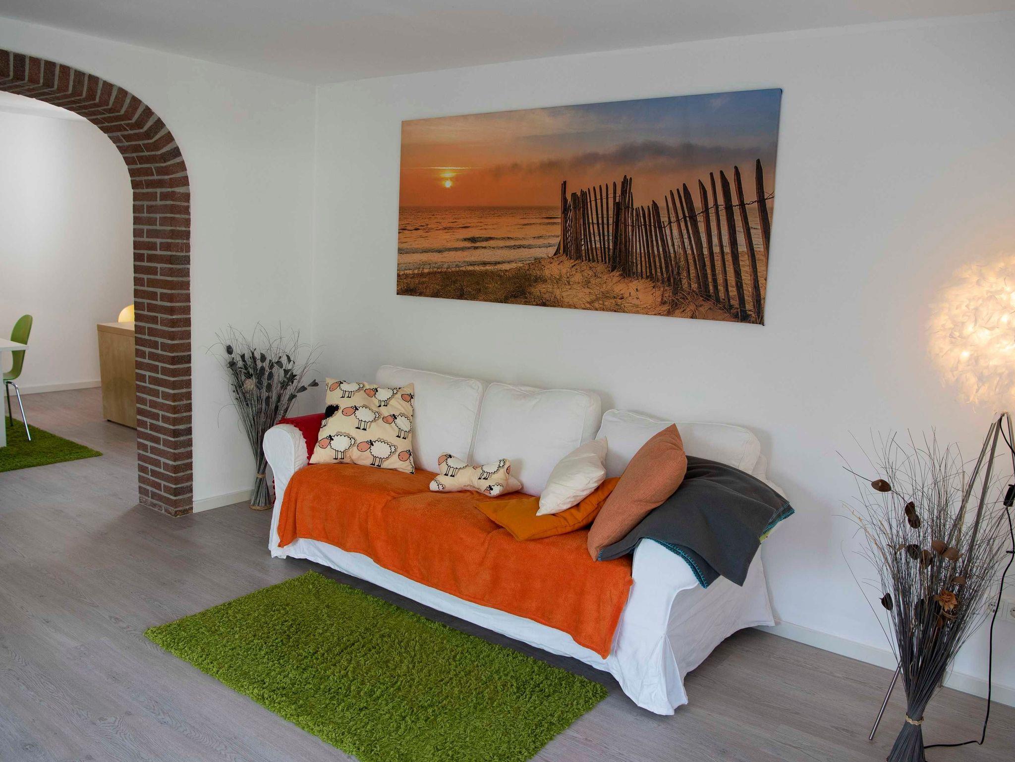 Der offene Wohn-, Ess-, Kochbereich ist gemütlichen und stilvoll eingerichtet - lichtdurchflutet. Die gemütlichen Sofas laden zum Verweilen ein. Ein CD/ Radioplayer, der auch mit einem USB-Stick gefüttert werden kann, lässt den musikalischen Genuß nicht zu kurz kommen. Ein moderner Fernseher lädt zum Verweilen auf dem Sofa ein. Für die moderne Kommunikation des 21. Jahrhunderts bietet Ihnen diese Ferienwohnung schnelles WLAN.