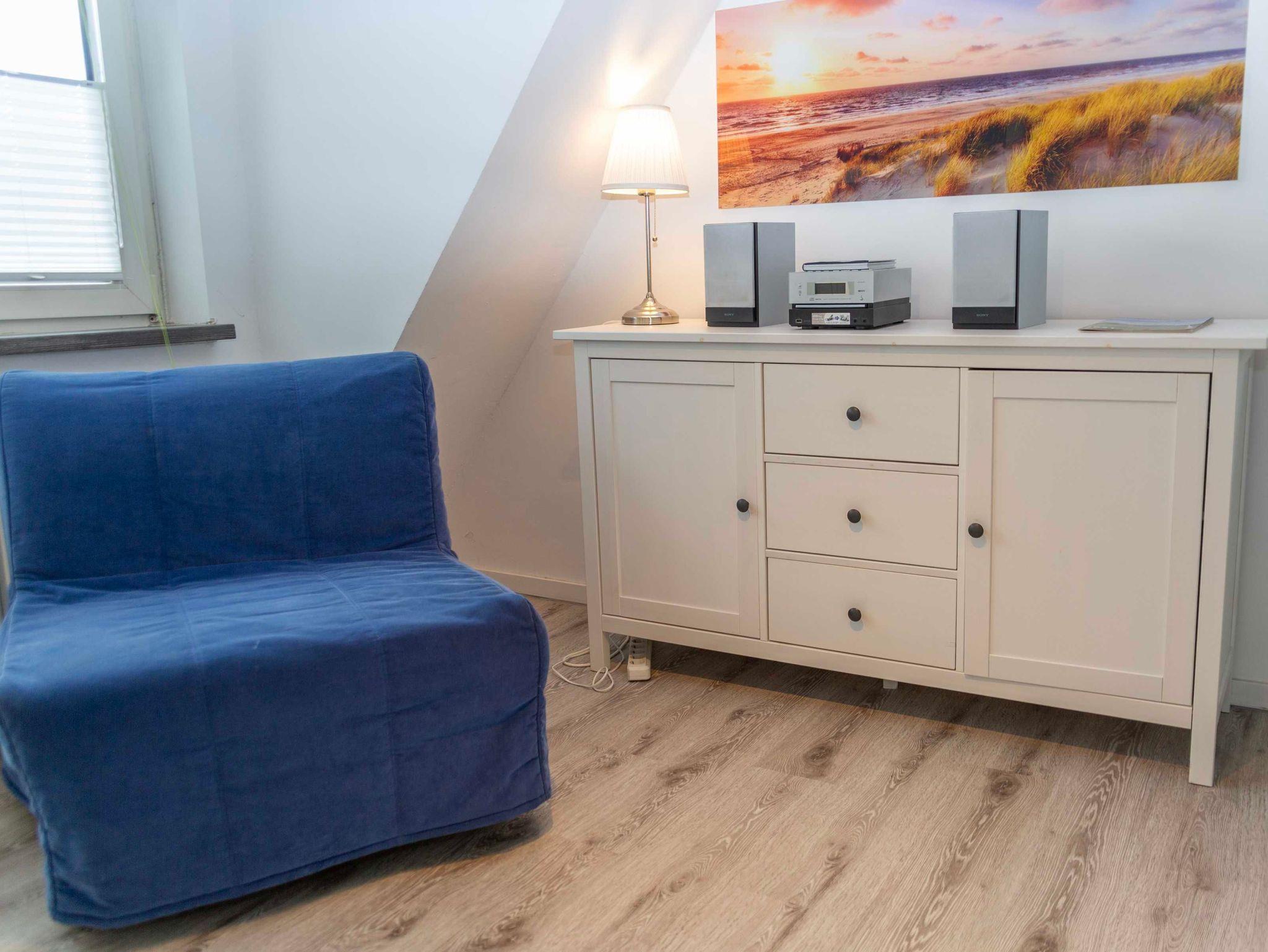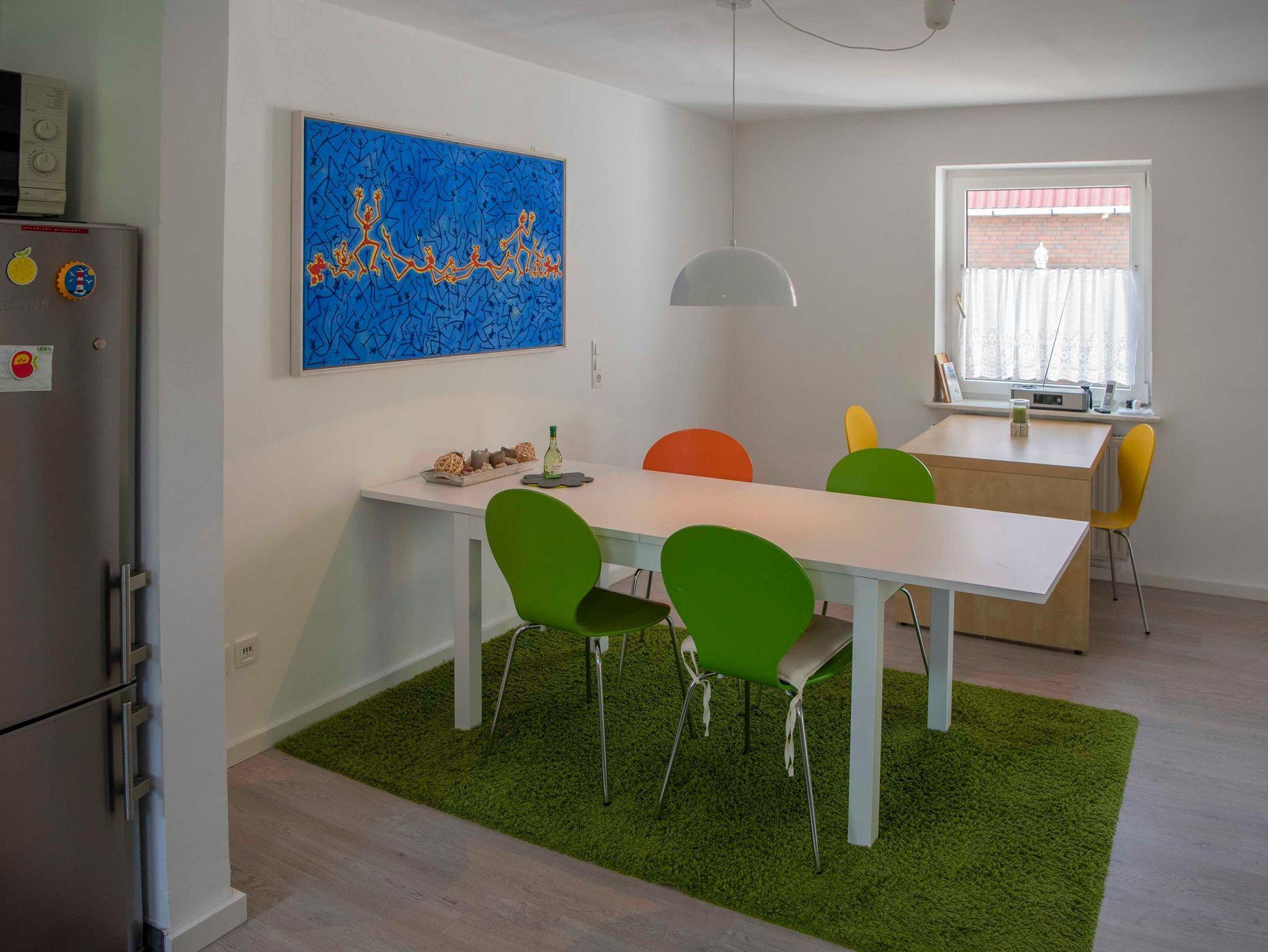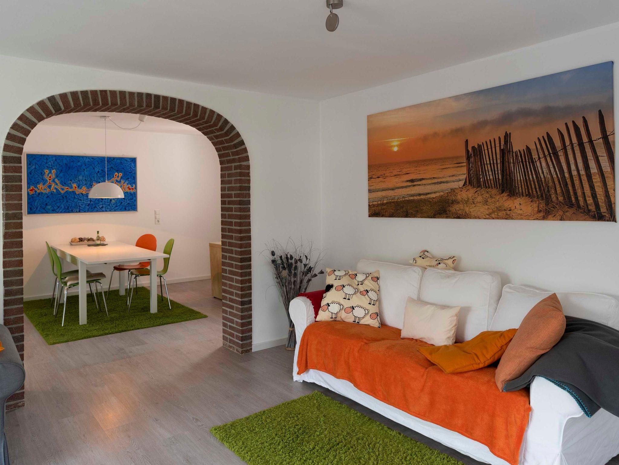 Der offene Wohn-, Ess-, Kochbereich ist gemütlichen und stilvoll eingerichtet - lichtdurchflutet. Die gemütlichen Sofas laden zum Verweilen ein. Ein CD/ Radioplayer, der auch mit einem USB-Stick gefüttert werden kann, lässt den musikalischen Genuß nicht zu kurz kommen. Ein moderner Fernseher lädt zum Verweilen auf dem Sofa ein. Für die moderne Kommunikation des 21. Jahrhunderts bietet Ihnen diese Ferienwohnung schnelles WLAN.