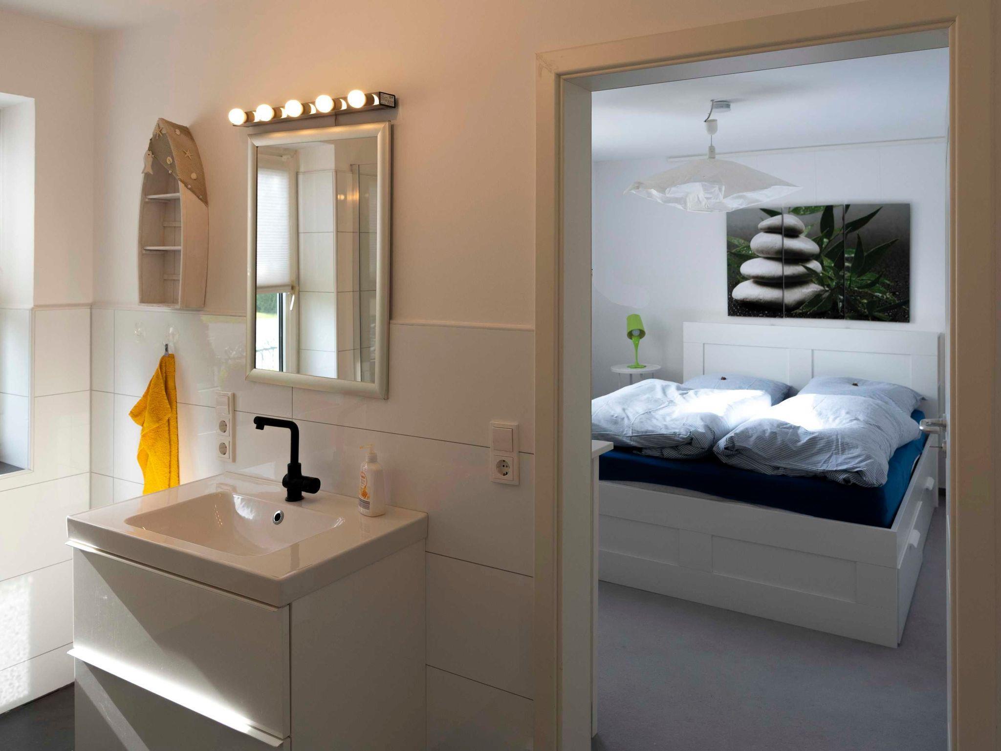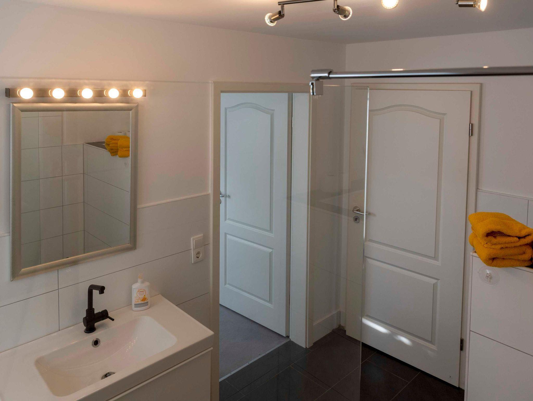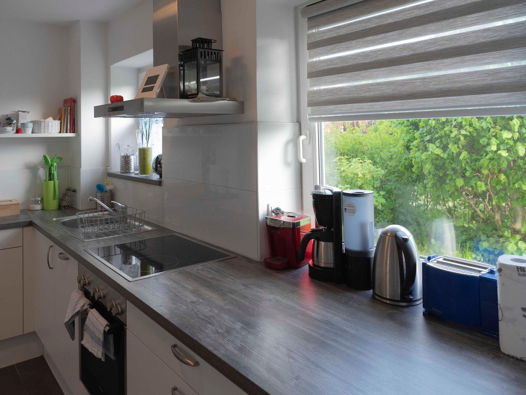 Das moderne Bad bietet eine großzügige Duschlandschaft. Die Küche ist umfangreich ausgestattet. Über den Geschirrspüler, einer Senseo-Maschine für die Kaffeezubereitung, einer Mikrowelle, einem Wasserkocher, dem Ceranfeld-Herd mit Backofen bis hin zum Kühlschrank mit Eisfach ist alles vorhanden.