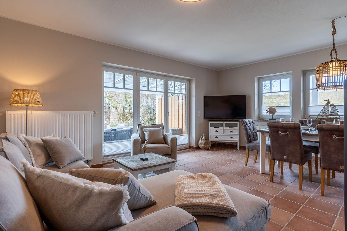 Ein weiteres Highlight der Ferienunterkunft ist der Garten, in dem Sie sich auf Gartenmöbeln entspannen können. Genießen Sie die frische Nordseeluft auf der überdachten Terrasse oder dem Balkon und verweilen Sie mit einem guten Buch oder einer Tasse Kaffee. Auch der Strandkorb im Garten bietet den perfekten Platz zum Entspannen.