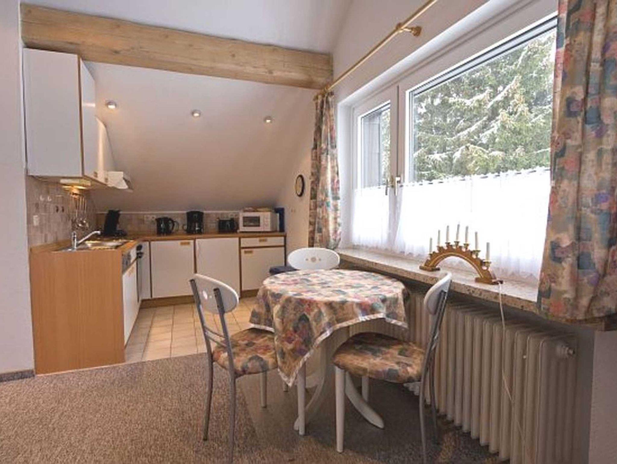 Die Wohnung 6 ist 84 m² groß. Sie besteht aus einem Wohnzimmer mit separatem Küchenbereich, kleinem Frühstückstisch, zwei separaten Schlafzimmern (eines mit Ehebett und zusätzlichem Bett) und hat eine geräumige Diele mit Esstisch und 4 Stühlen. Von hier haben Sie einen traumhaften Blick in die herrliche Berglandschaft des Oberharzes. Das Duschbad hat ein Fenster zum Garten und ist geräumig. Ein Fön und ein Kosmetikspiegel sind vorhanden. Die Küche ist ausgestattet mit einem 4-Sterne-Kühlschrank, Geschirrspülmaschine, Kaffeemaschine, Toaster, Wasserkocher, 4-Platten-Herd mit Backofen, einem Mikrowellengerät und für 8 Personen Gläser, Geschirr, Töpfe und Besteck. Zur Wohnung gehören ein TV-Flachbildschirm mit Kabel-Anschluss, ein DVD-Gerät, ein Radio-Wecker und ein CD-Kassetten-Radio-Gerät.