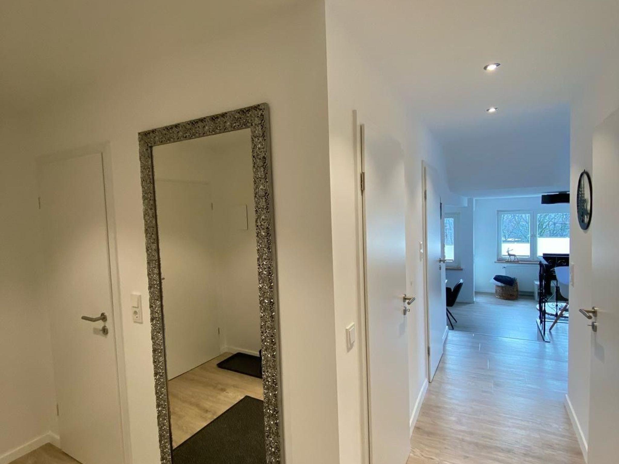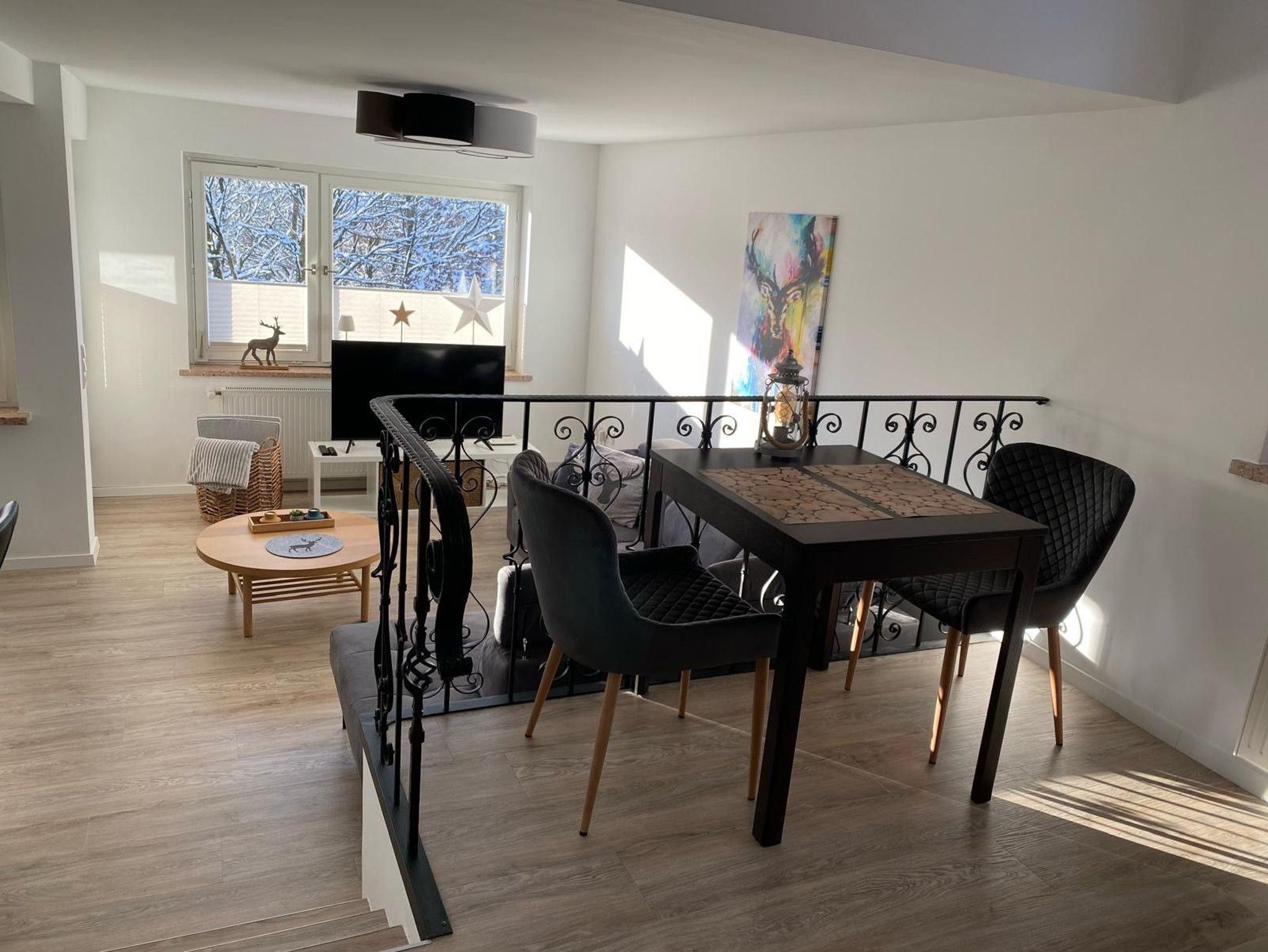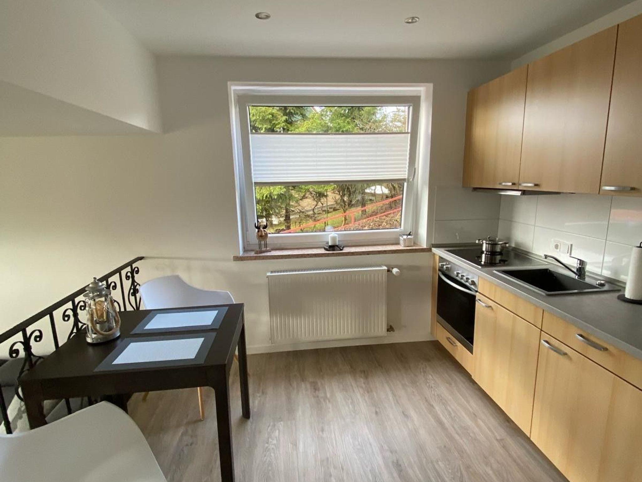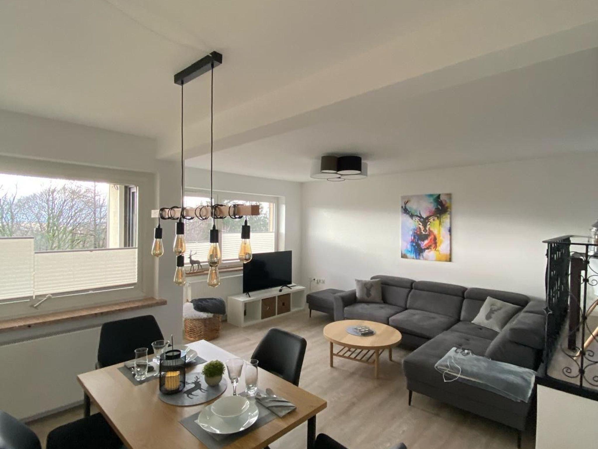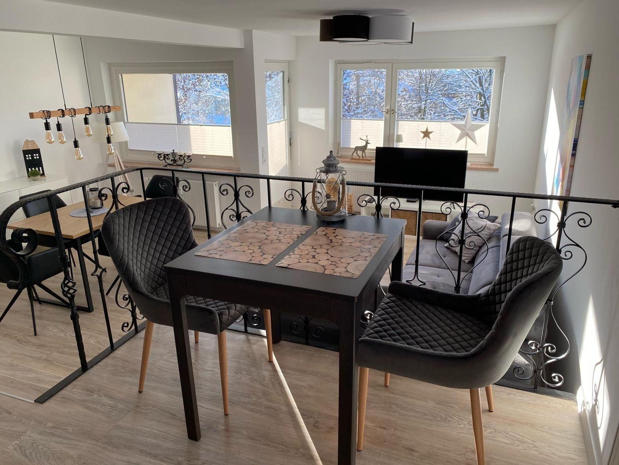 Moderne Behaglichkeit bietet das lichtdurchflutete, großzügig aufgeteilte Wohnzimmer. Mit einem Frühstücksplatz für zwei direkt neben der Küchenzeile oder auf einer zweiten Ebene mit einem Esstisch für bis zu 4 Personen. Die Einrichtung wurde liebevoll ausgewählt und bildet zusammen mit der Dekoration ein harmonisches Bild. Nach einem erlebnisreichem Urlaubstag lädt der Balkon mit Blick auf die Rodelwiese und die Fontäne im Kurpark zu einem gemütlichen Tagesausklang ein. Vielleicht genießen Sie hier auch Ihr Frühstück in der warmen Jahreszeit. Im Schlafzimmer erwartet Sie ein bequemes Doppelbett. Im neuen Badezimmermit der geräumigen Dusche können Sie es sich richtig gut gehen lassen. WLAN ist ohne zusätzliche Kosten vorhanden.