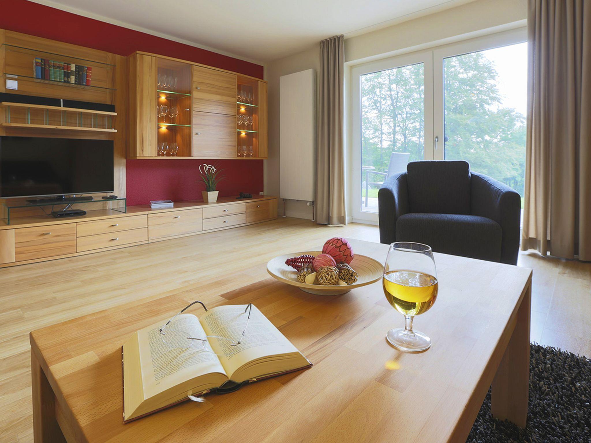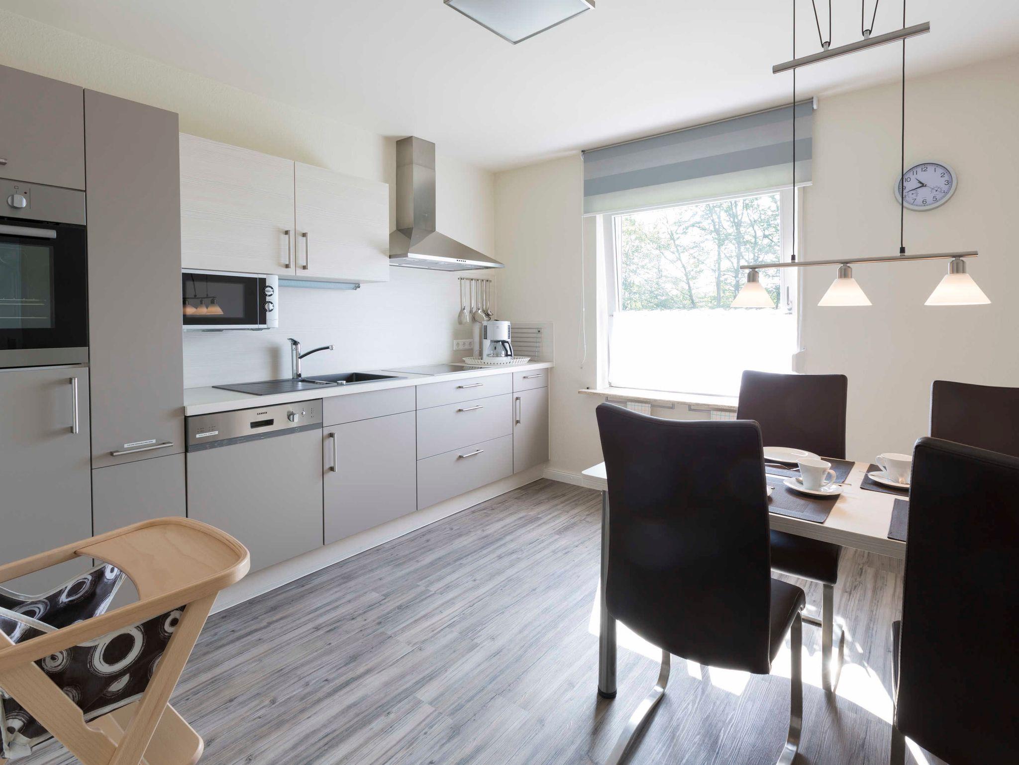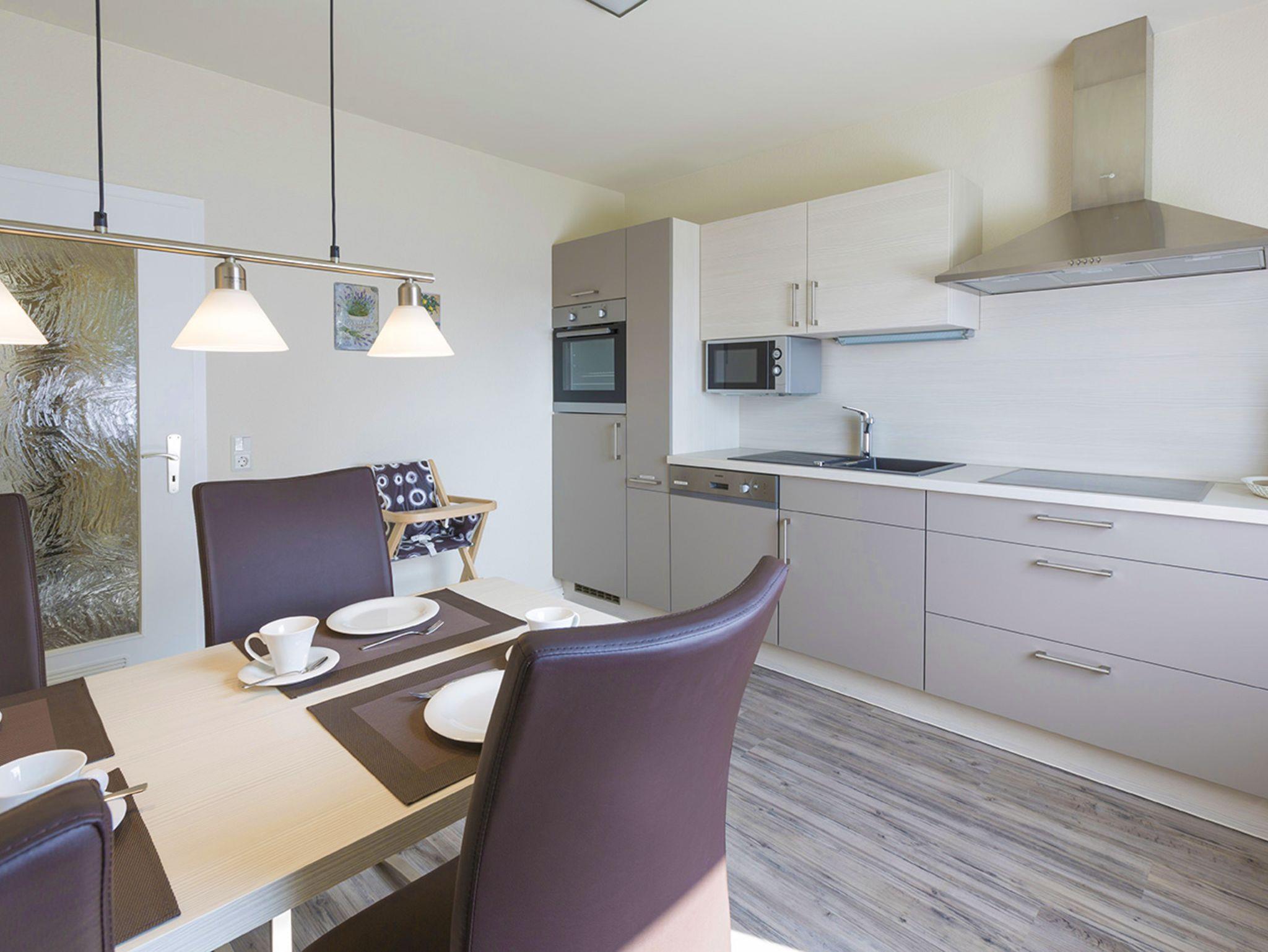 Das Wohnzimmer verfügt über eine gemütliche Sitzecke, einen großzügigen Essplatz sowie ein Schrankbett und es bietet Zugang zum Balkon. Kostenfreies WLAN, Flachbild-TV, DVD-Player, Soundbar mit Bluetooth für Smartphone /Tablet-PC / Laptop, Web Radio und CD-Player gehören ebenfalls zur Ausstattung. Das Schlafzimmer verfügt über ein Doppelbett und einen großen Kleiderschrank mit Tresor. Die separate Küche wurde mit hochwertigen Elektrogeräten ausgestattet und bietet einen Elektroherd mit Cerankochfeld, Kühlschrank mit Gefrierkombination, Geschirrspüler, Mikrowelle, Kaffeemaschine, Wasserkocher und Toaster. Das moderne Duschbad mit WC verfügt außerdem über ein Urinal und bietet Fön und Kosmetikspiegel. Im Treppenhaus befindet sich Stauraum für Garderobe, Schuhe und Reinigungsmittel.