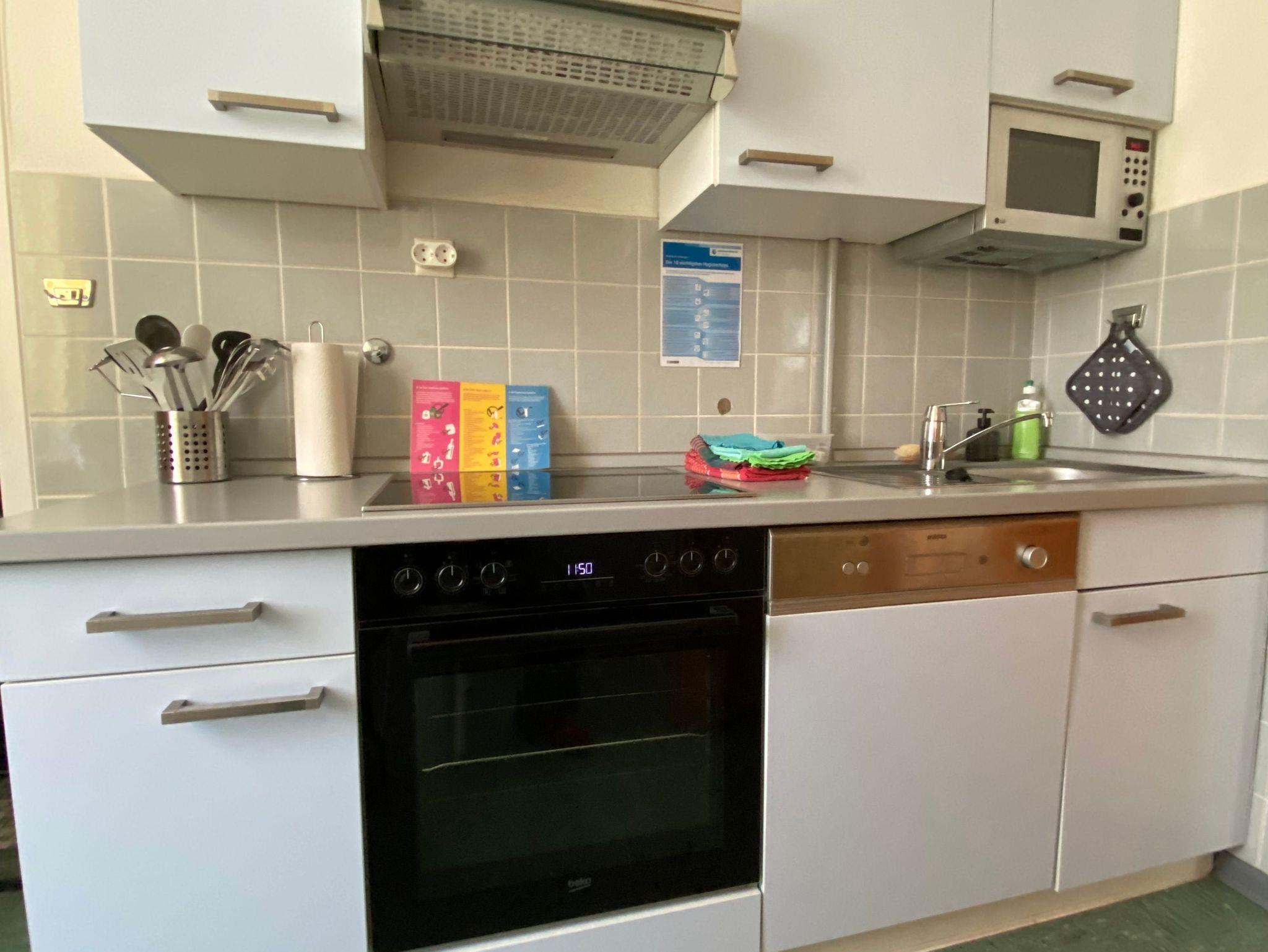 Die Küche ist komplett ausgestattet mit einer Sitzgruppe für 4 Personen, E-Herd und Backofen, Mikrowelle, Geschirrspüler, Kühlschrank mit Frosterfach, Kaffeemaschine, Toaster, Wasserkocher sowie Geschirr,Töpfe und Pfannen.