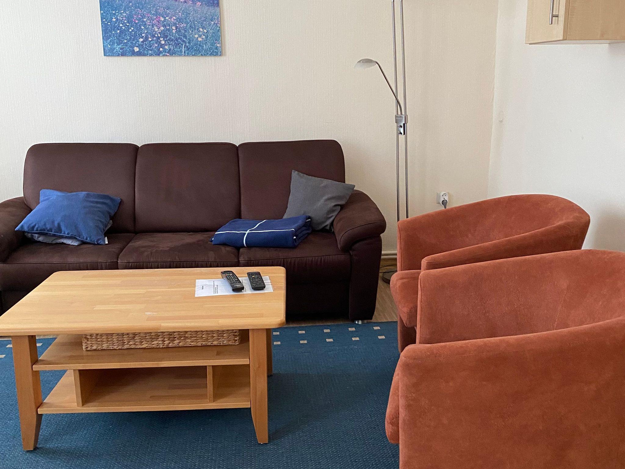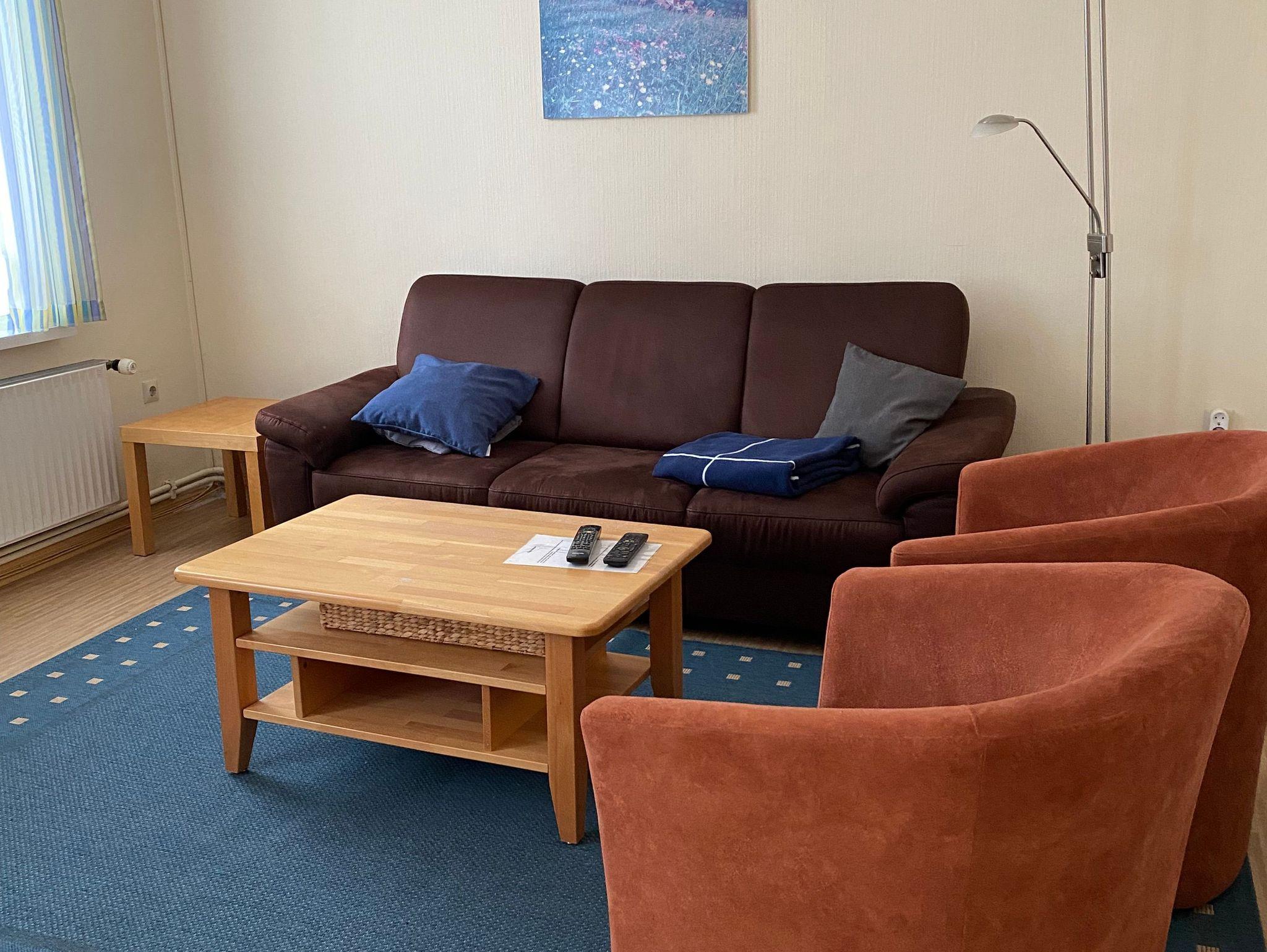 Das Wohnzimmer hat eine Fläche von ca. 26 qm und bietet mit einer Sitzgarnitur und einer Essecke mit ausziehbarem Esstisch genügend Raum für 4 Personen. Kabelfernsehen, Radio, Video- und DVD-Player sind vorhanden.