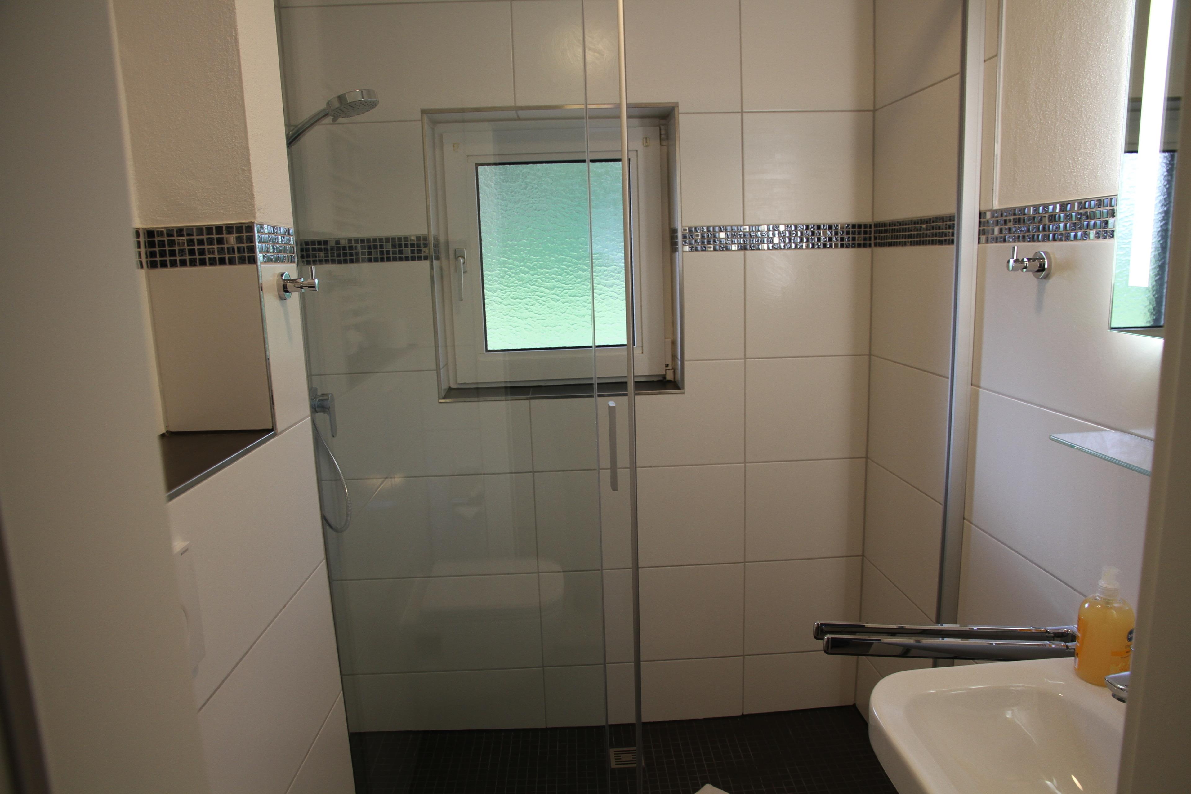 Im Bad, ausgestattet mit WC, Waschbecken und Dusche, stehen unseren Gästen auch ein Haartrockner, Handwaschseife und Kosmetiktücher zur Verfügung.