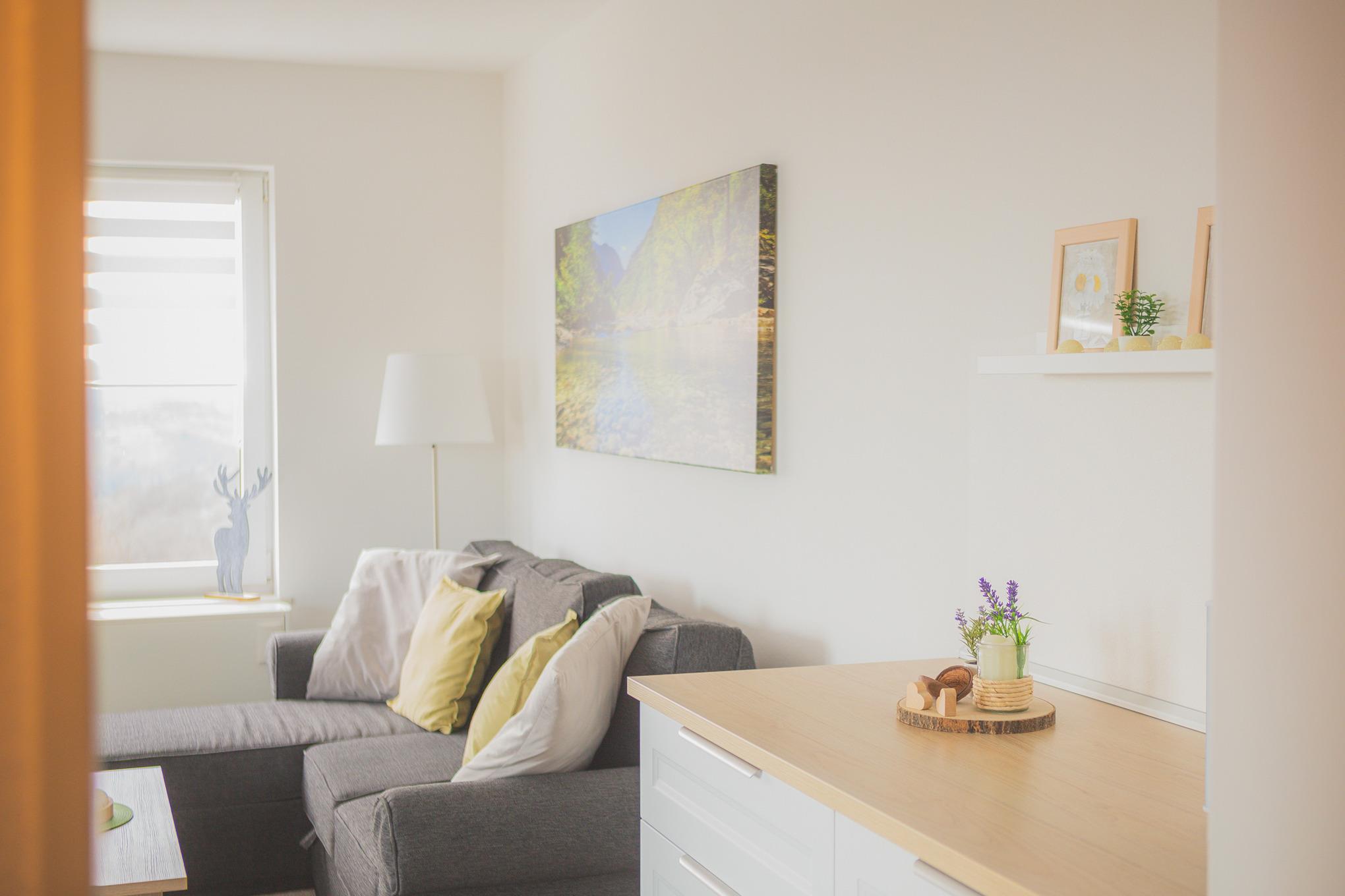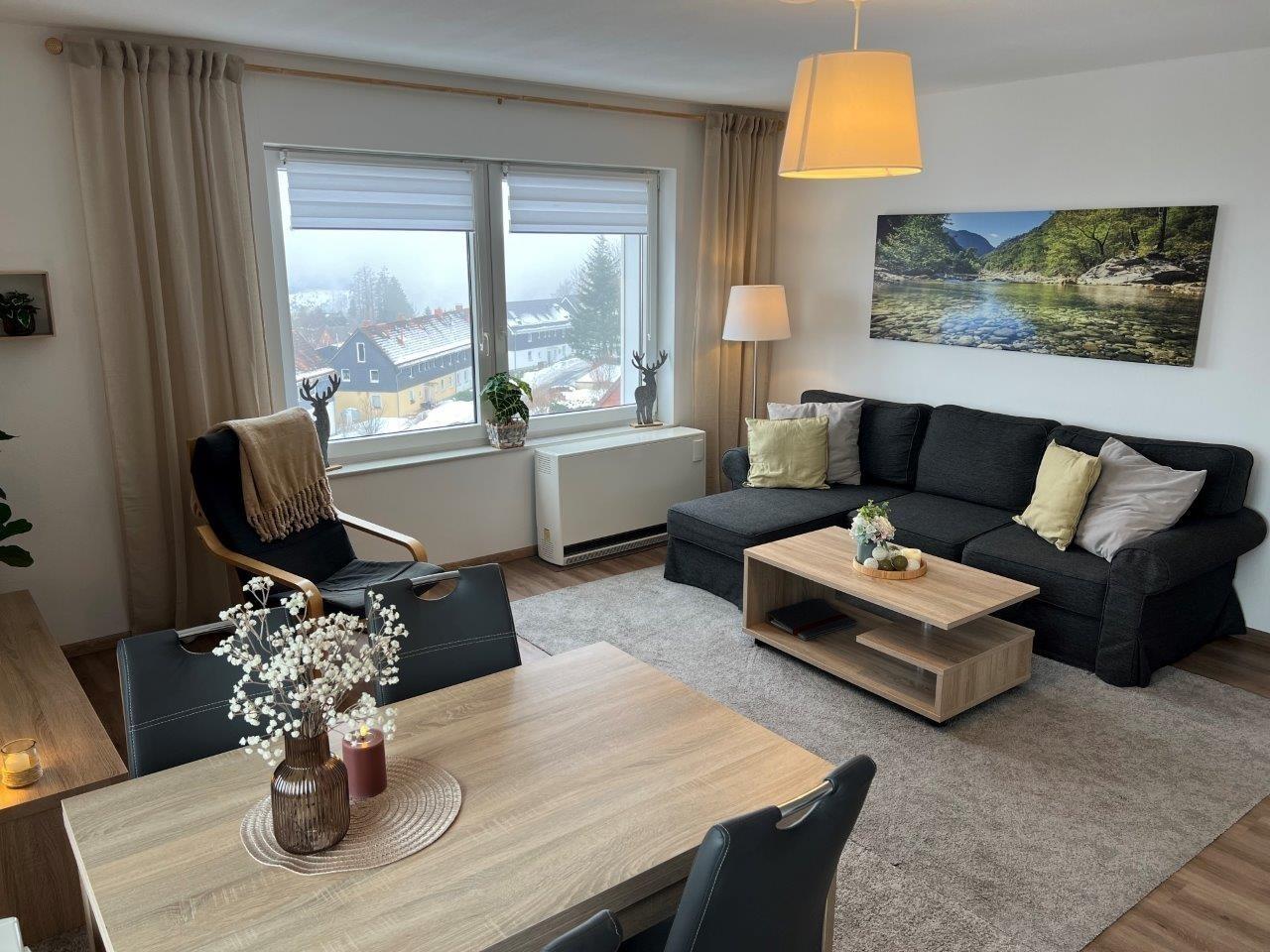 Die Wohnung wurde komplett neu saniert und modern eingerichtet. Der Wohn/Essbereich verfügt über ein Ecksofa mit Schlaffunktion (Liegefläche 1,30m x 2,00m), 1 Sessel, Smart TV (1,40m Diagonale), ausziehbaren Esstisch mit 4 Stühlen und der offenen Küche. Der Balkon ist direkt von hier aus erreichbar und lockt mit seinem schönen Ausblick zum Verweilen an der gesunden Harzer Luft.